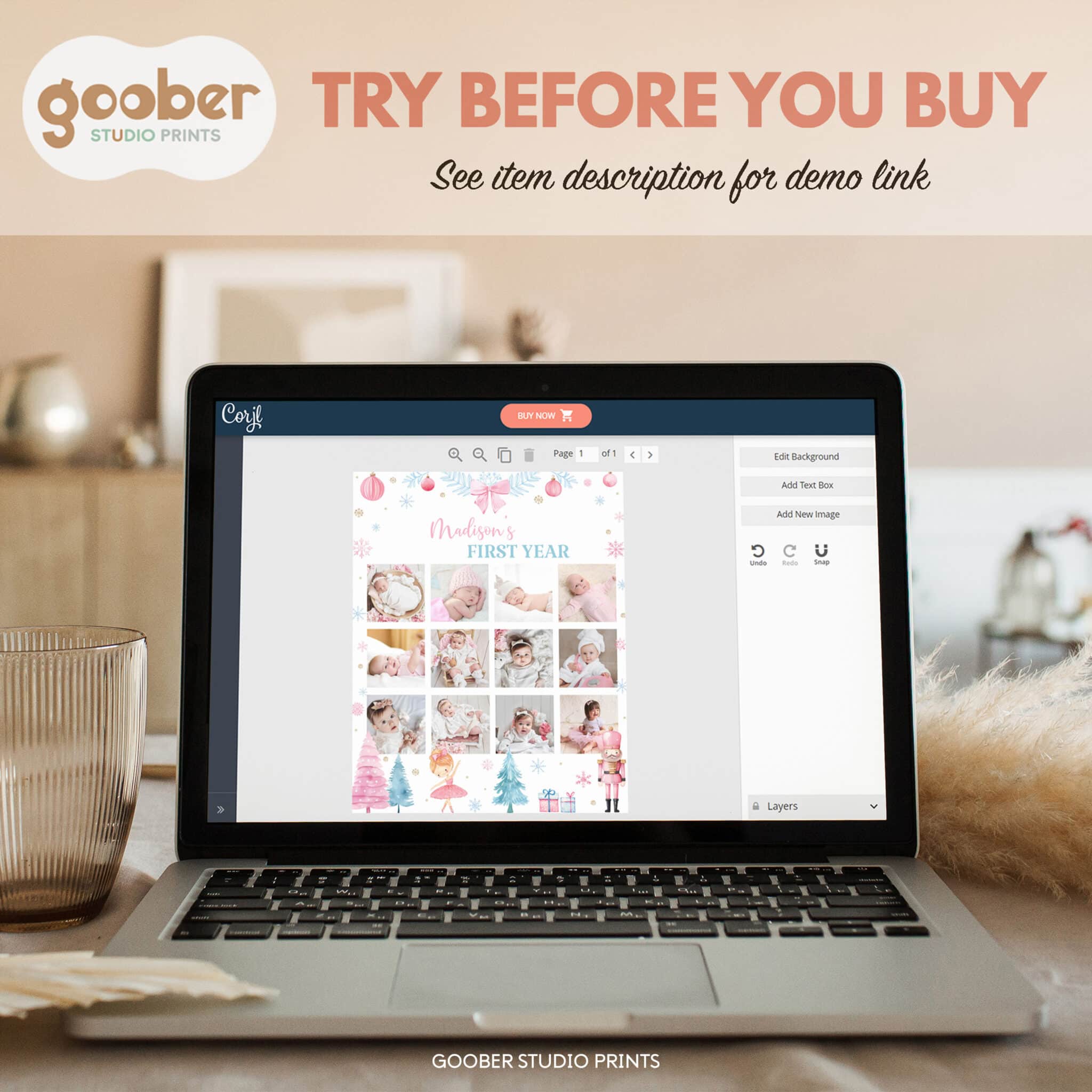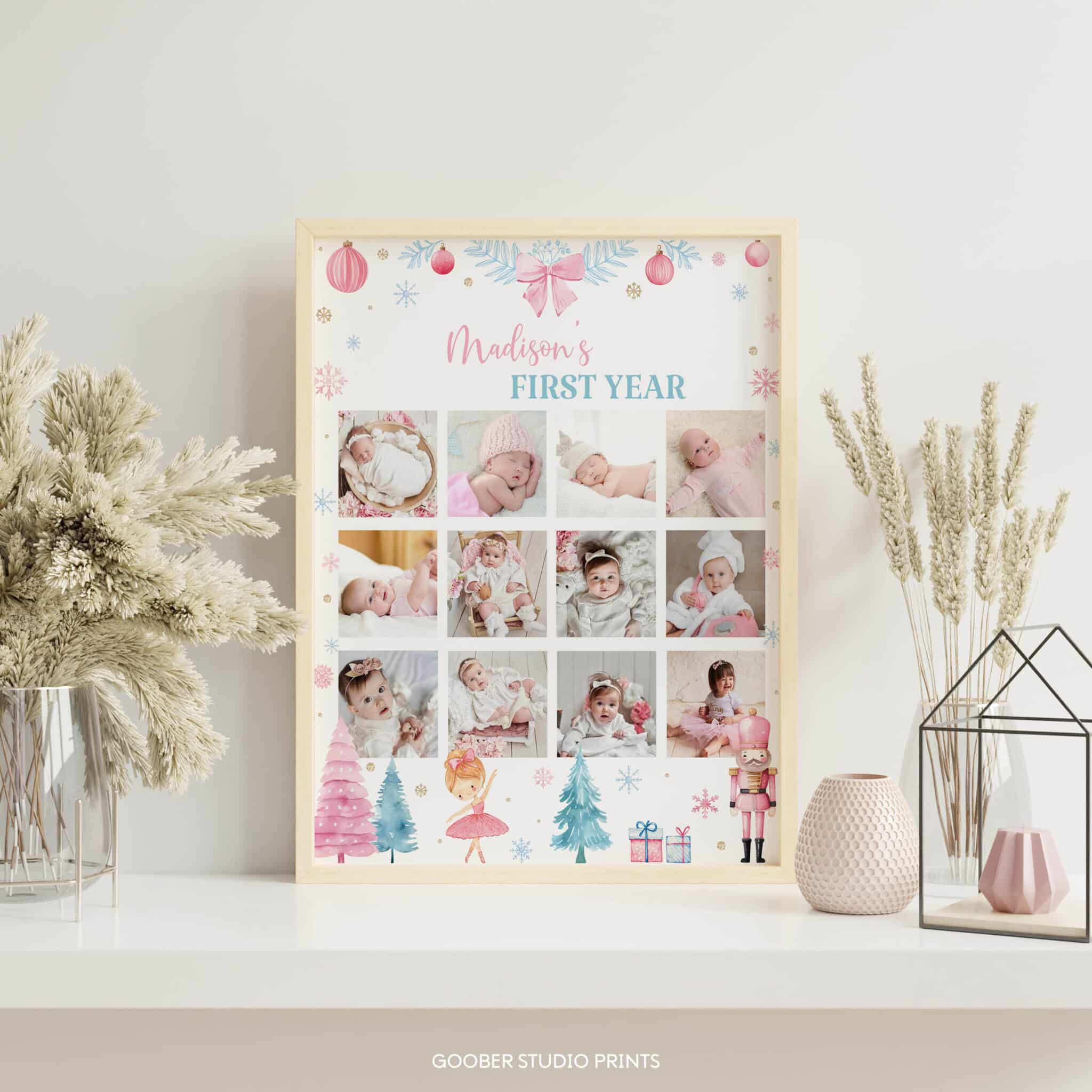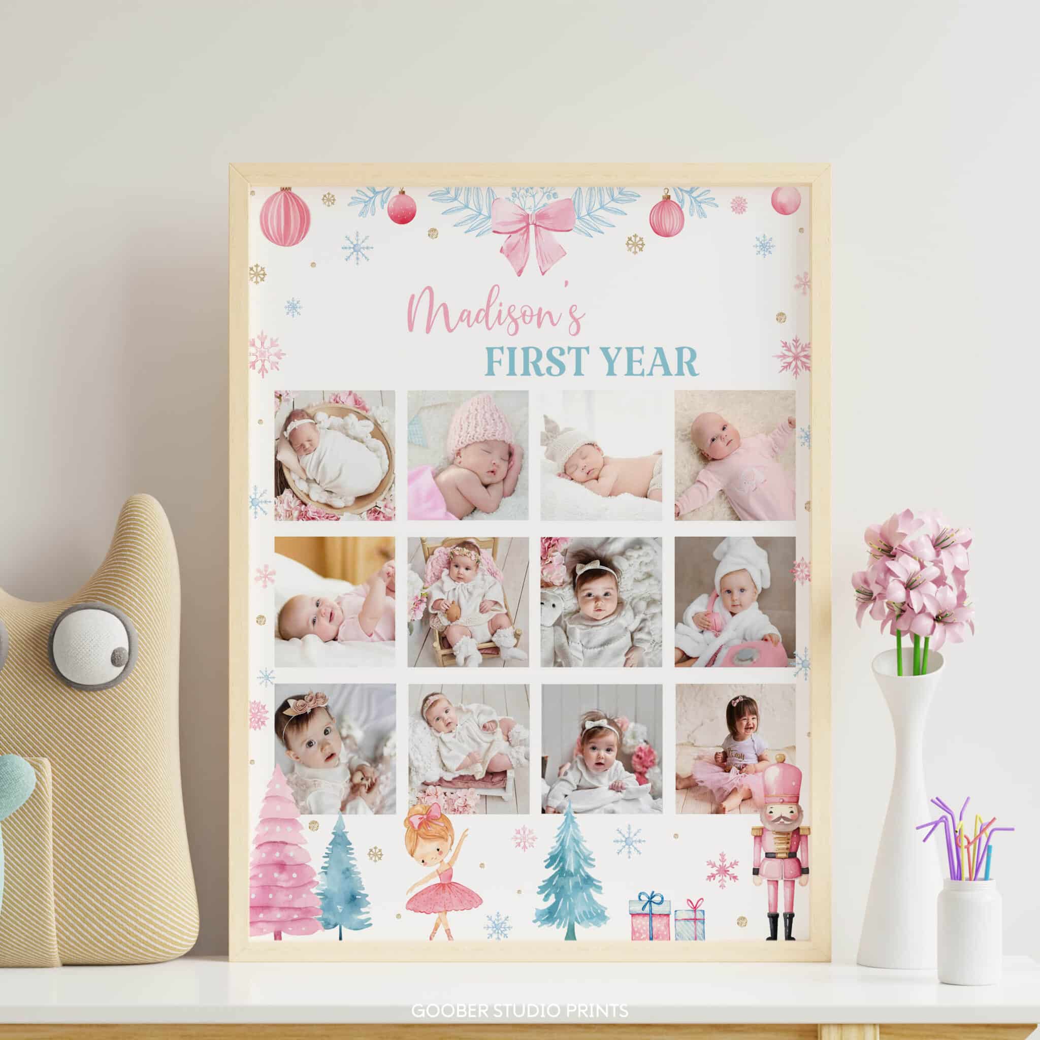 Treasure every sweet moment of your baby girl’s nutcracker birthday with this milestone photo collage, perfect for a magical winter birthday or festive Christmas party. Designed for a little sugarplum, it features whimsical nutcrackers, delicate snowflakes, soft pink bows, and dreamy winter wonderland details. Ideal for showcasing her monthly photos, this collage makes a beautiful keepsake highlighting milestones from her first year.
