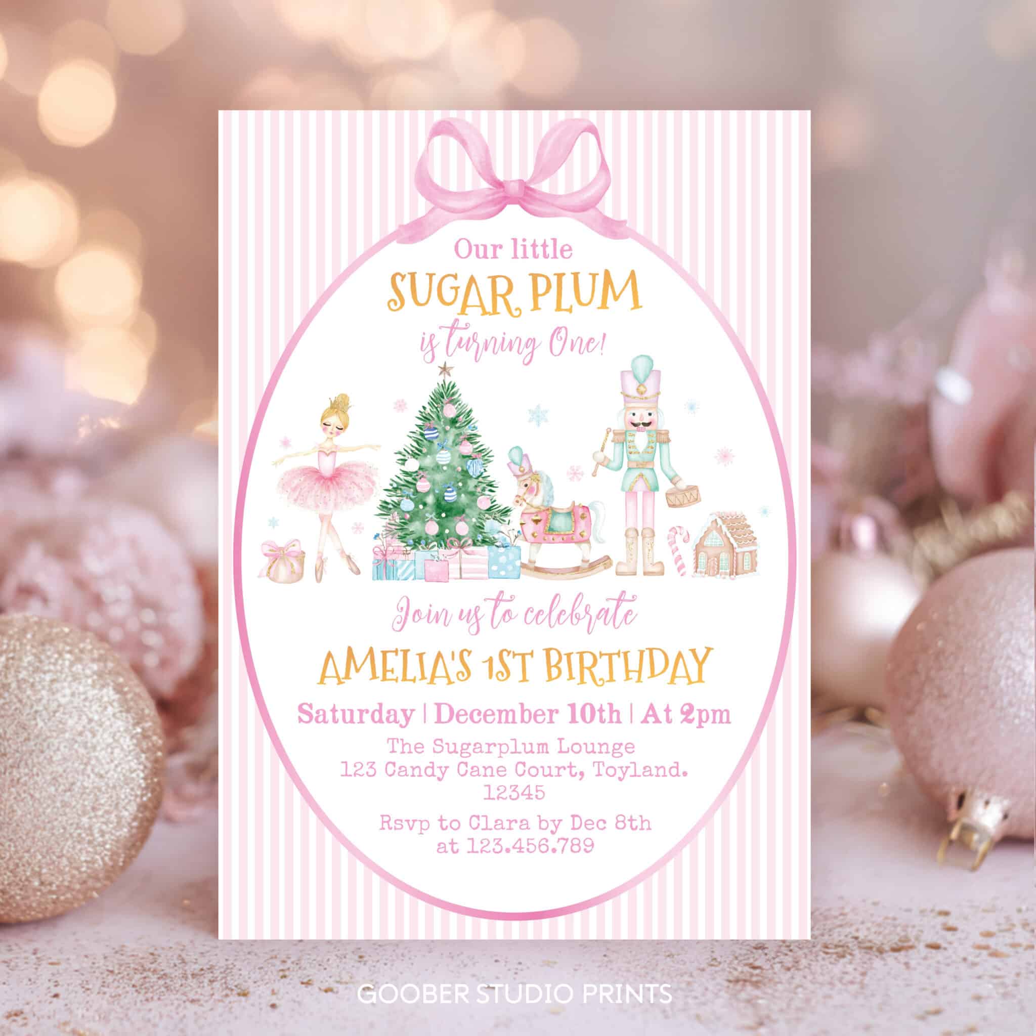 Invite friends and family to a magical celebration with our nutcracker birthday invitation, designed for a charming winter onederland party. Featuring whimsical nutcrackers, delicate snowflakes, soft pink bow accents, and a sweet little sugar plum theme, it’s perfect for a cozy winter birthday or festive christmas party. Easy to personalize and print at home, this invitation offers a stylish, budget-friendly way to share all your celebration details.