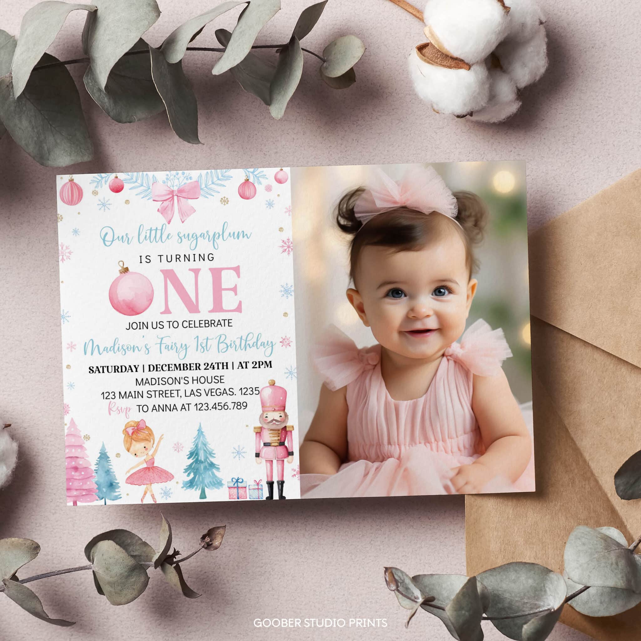 Invite family and friends to celebrate your little one’s nutcracker birthday with this sweet nutcracker 1st birthday photo invitation. Designed for a little sugarplum, it features whimsical nutcrackers, delicate snowflakes, soft pink bows, and dreamy winter wonderland details—perfect for a magical winter birthday or festive Christmas party. Easy to personalize and print at home, it’s a stylish and budget-friendly way to celebrate your baby’s first birthday.