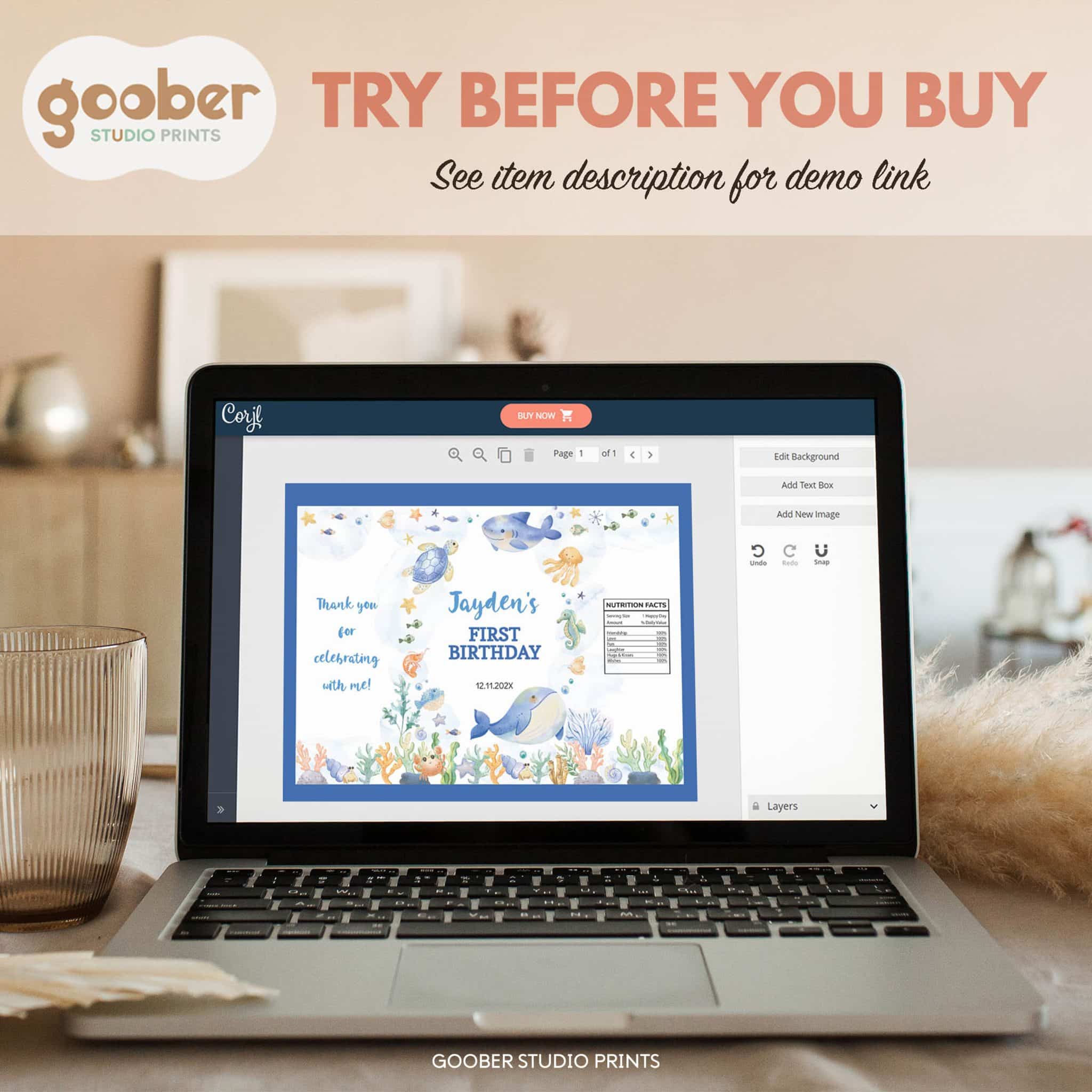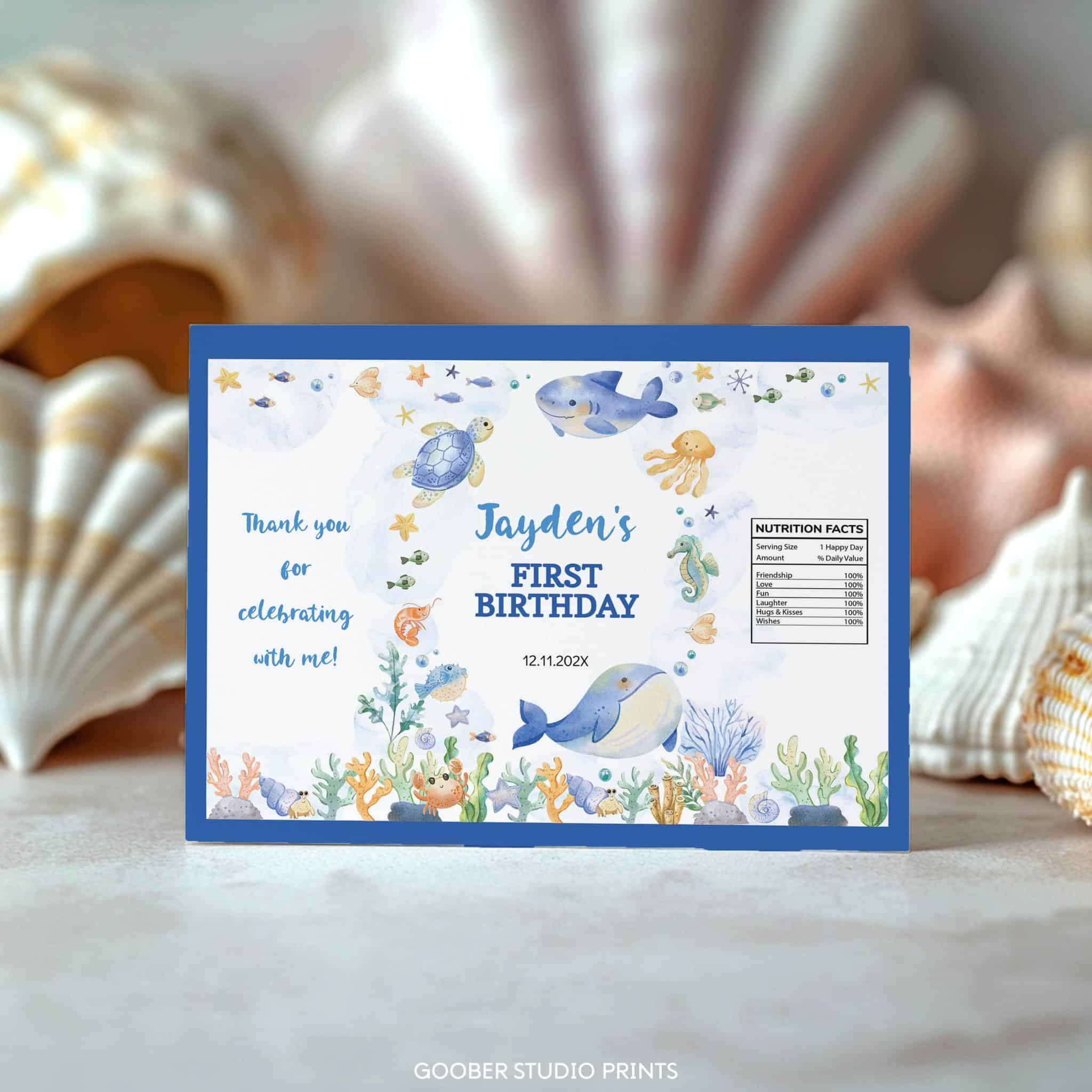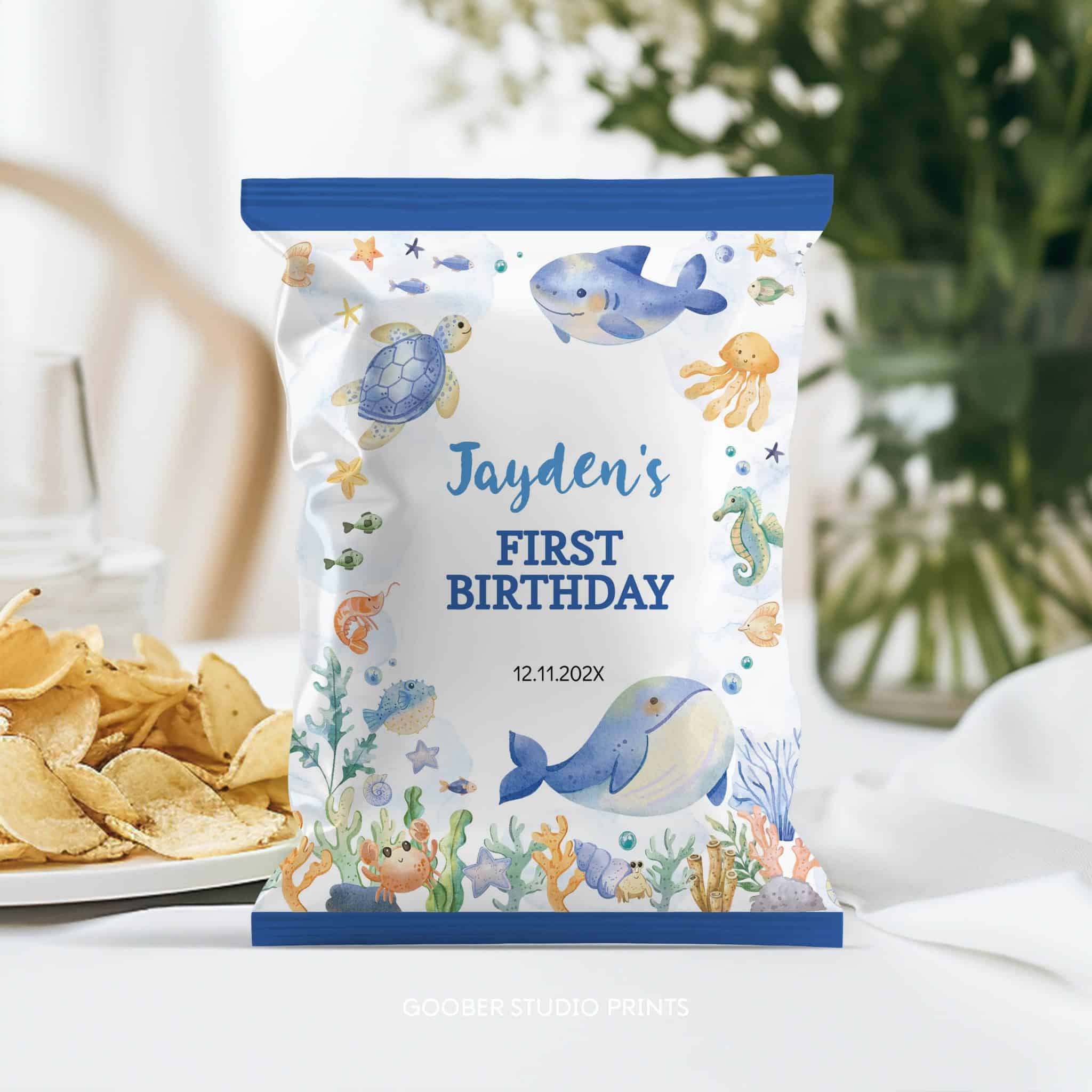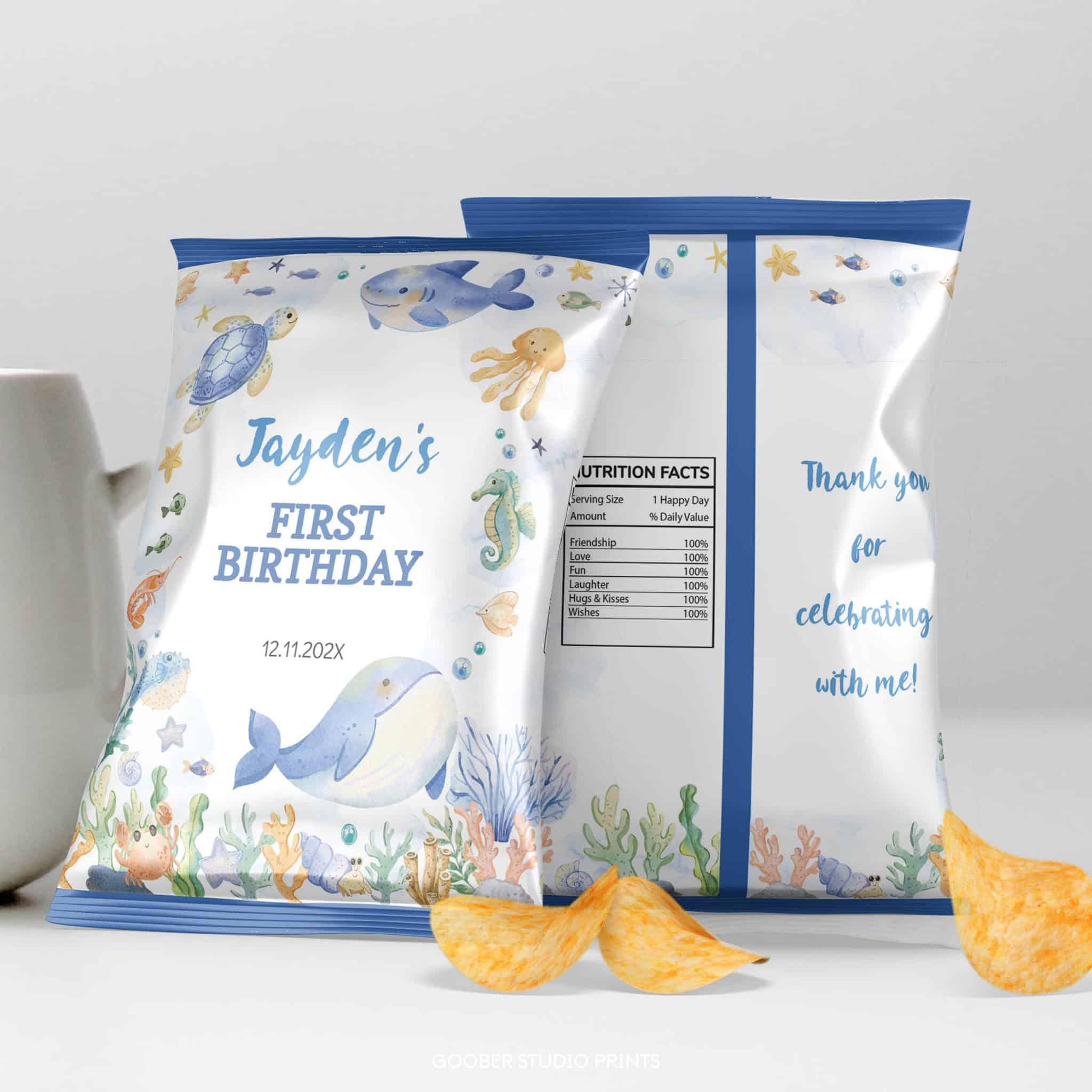 Make your snack table extra festive with our under the sea birthday chip bag! Featuring adorable ocean animals in a soft watercolor design, this customizable chip bag can include the birthday boy’s name and age. Simply print at home on standard paper and assemble into snack-size bags. These printable chip bags add a whimsical, personal touch to your ocean-themed celebration!