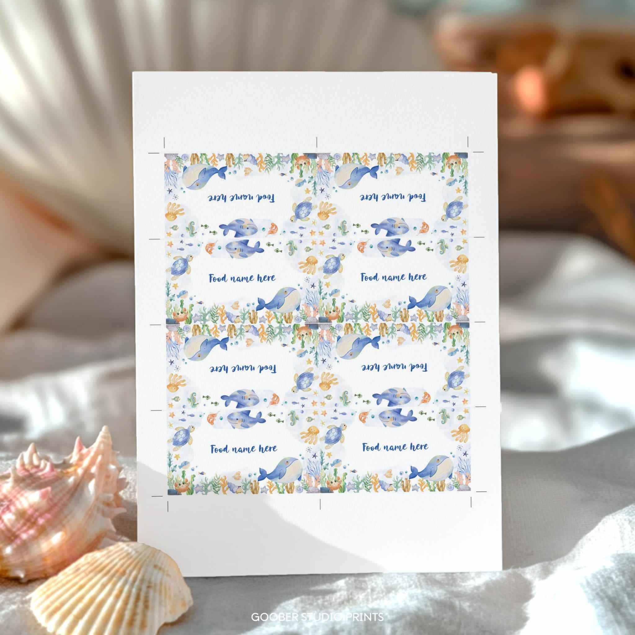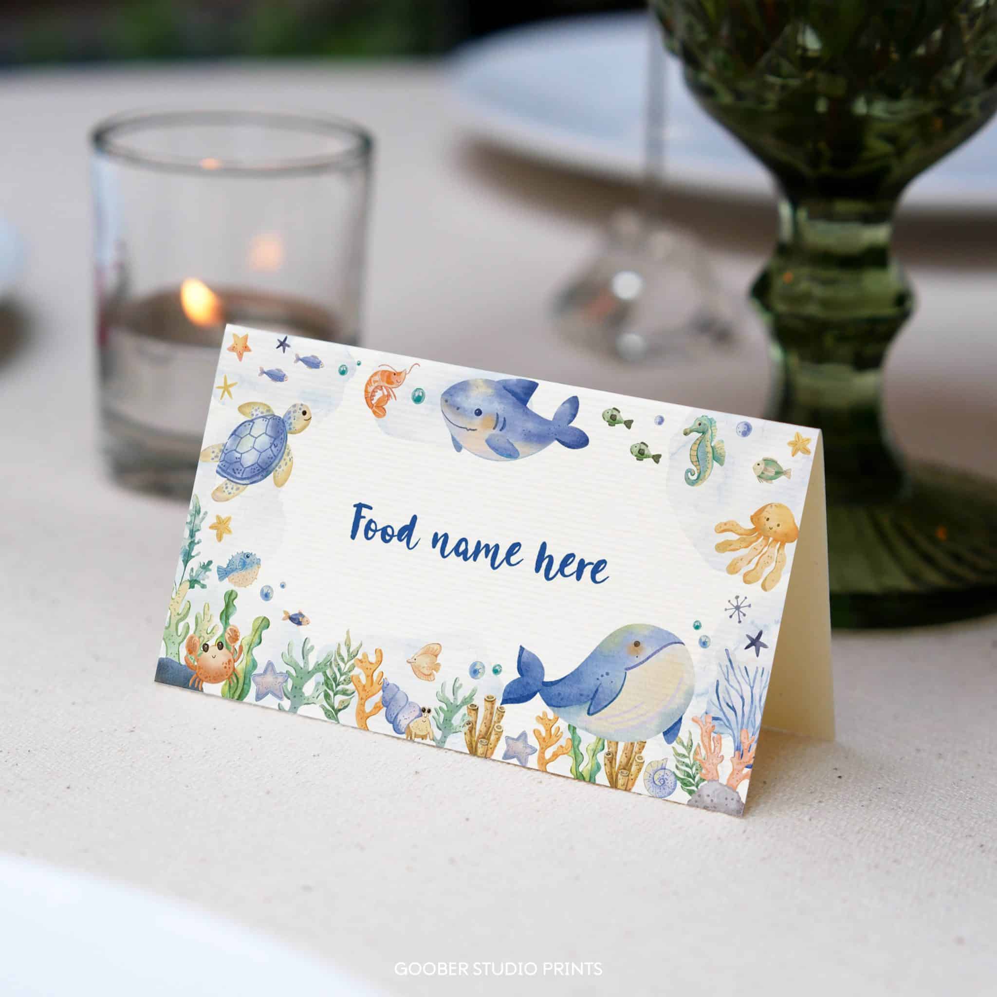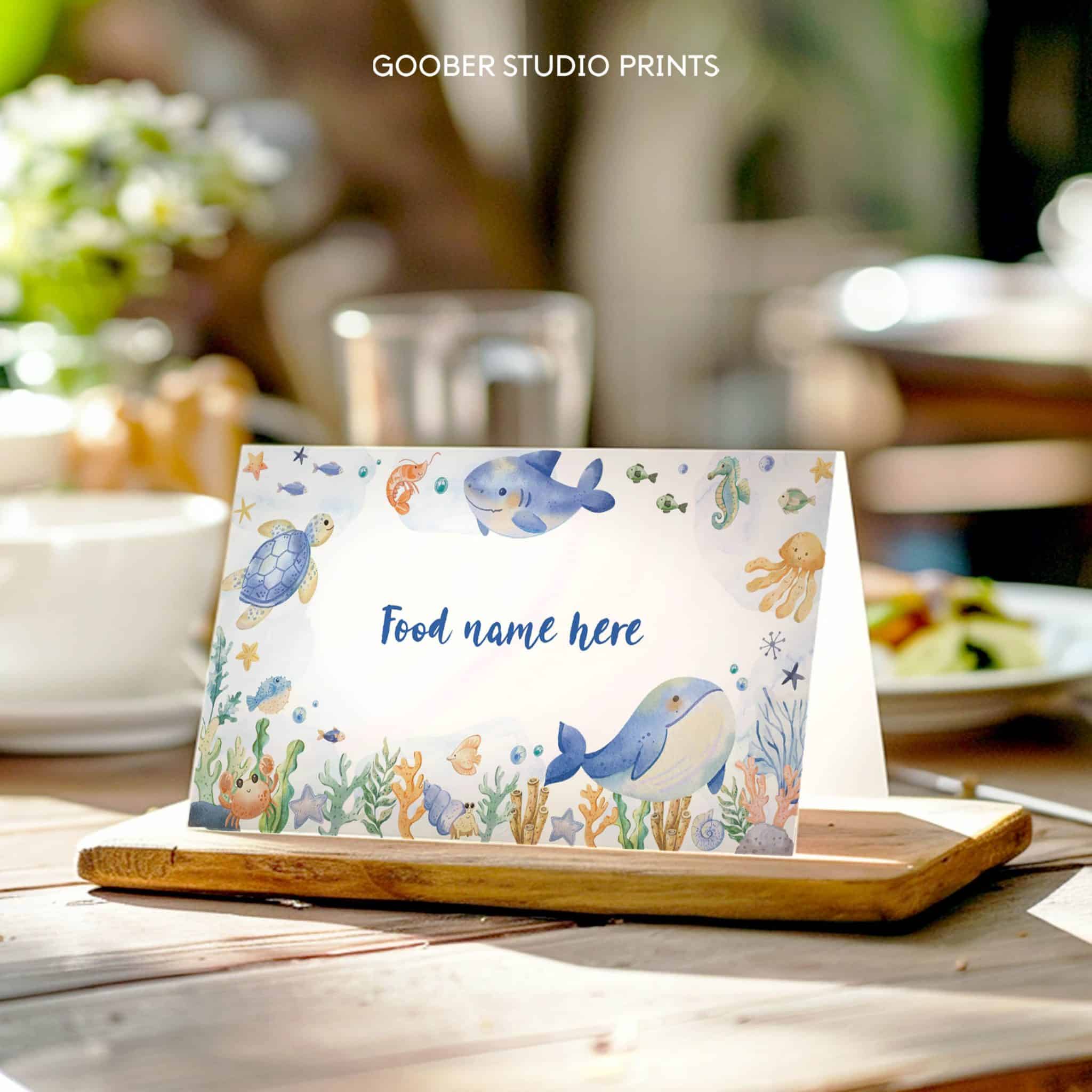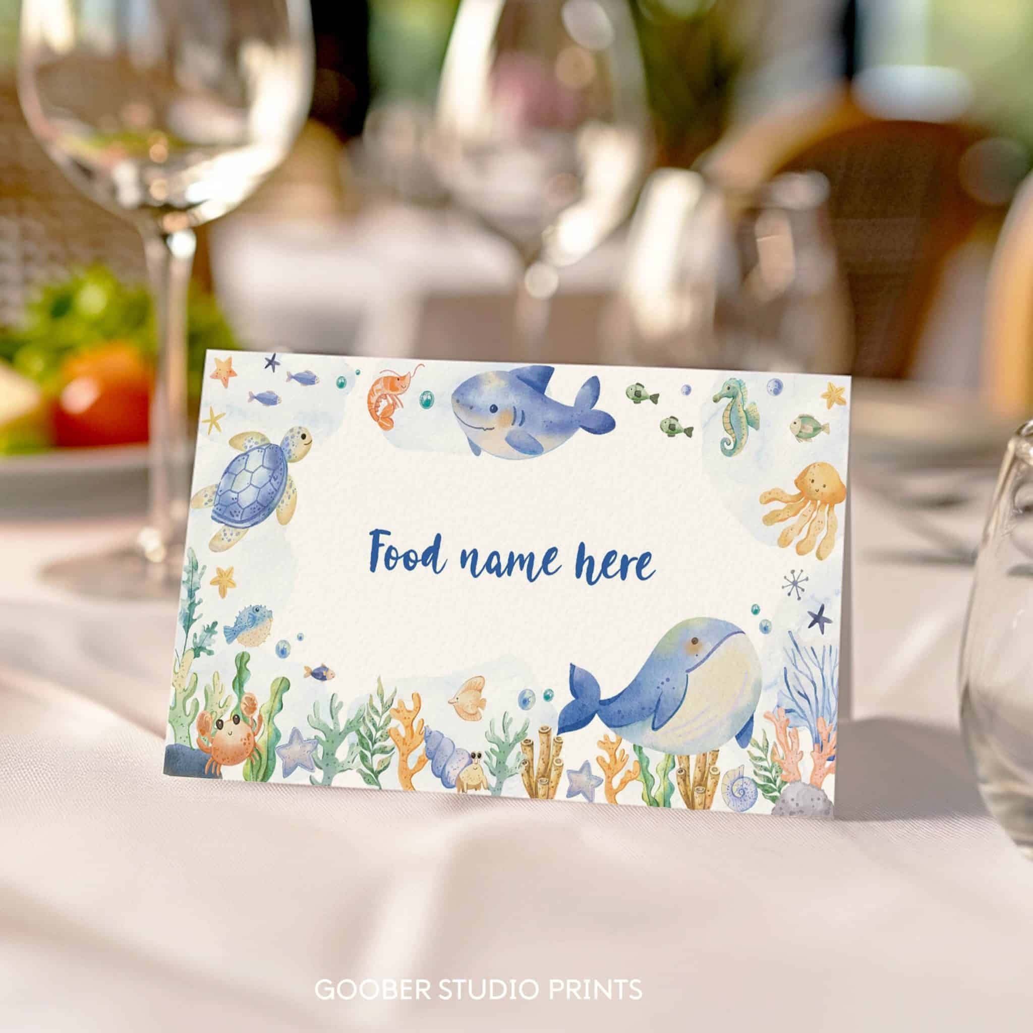 Label your party menu in style with our under the sea birthday food tent cards! Featuring adorable ocean animals in a soft watercolor design, these cards offer space to write dish names and add a whimsical touch to your buffet or dessert table. Easily customizable and printable at home on standard cardstock, they’re perfect for organizing food at any ocean-themed birthday celebration or sit-down meal.