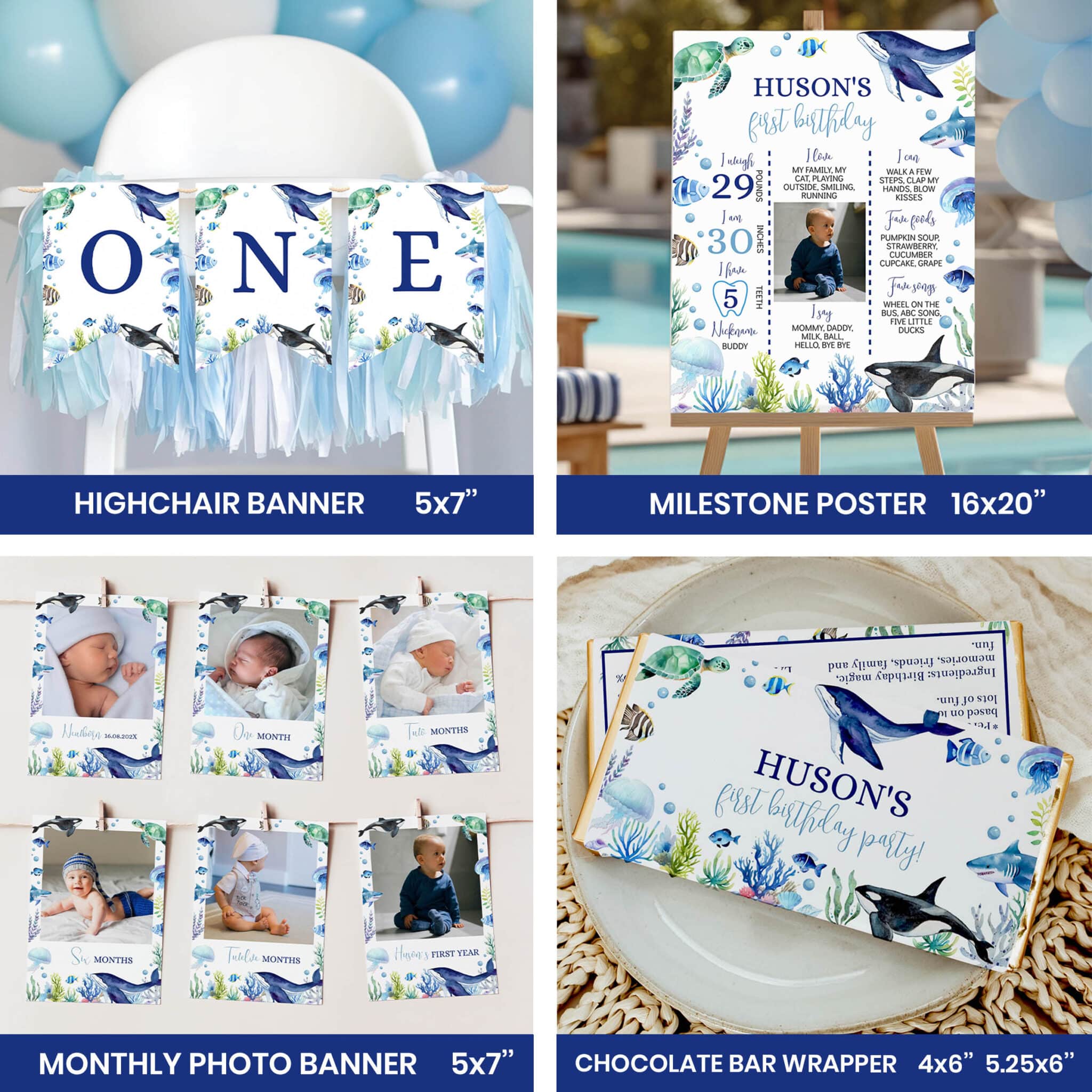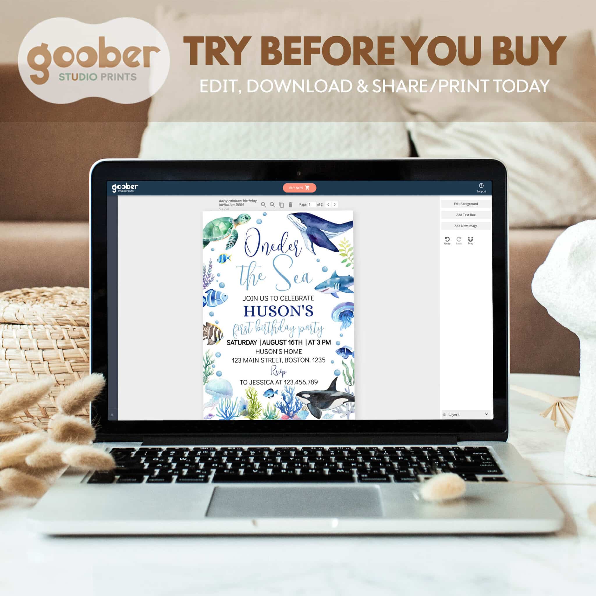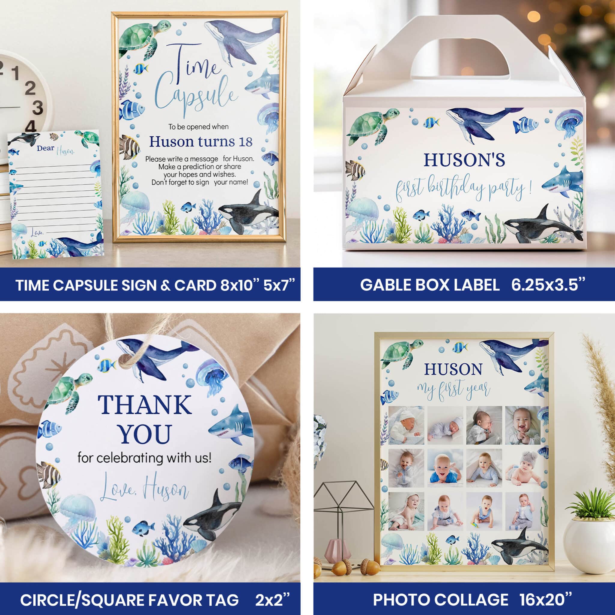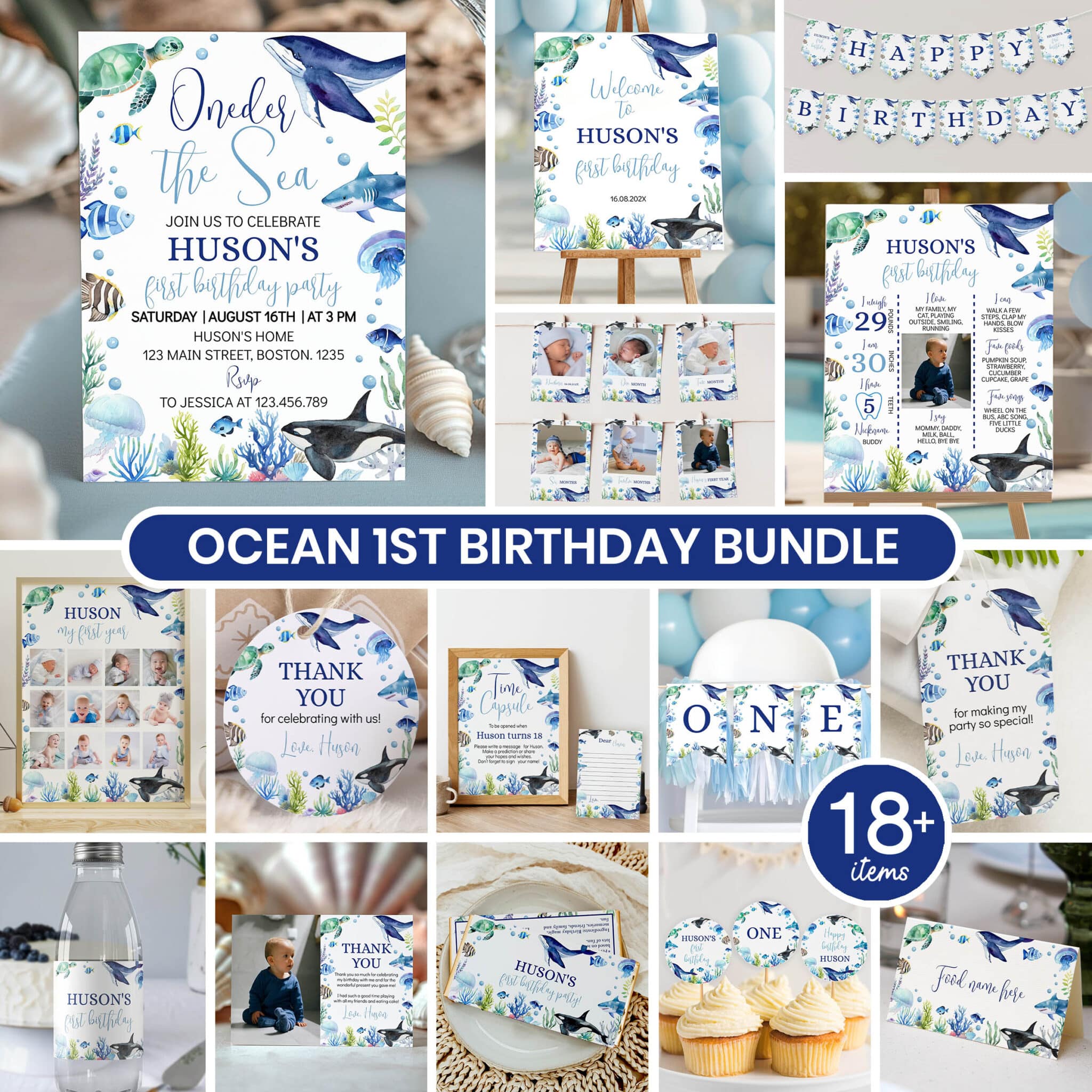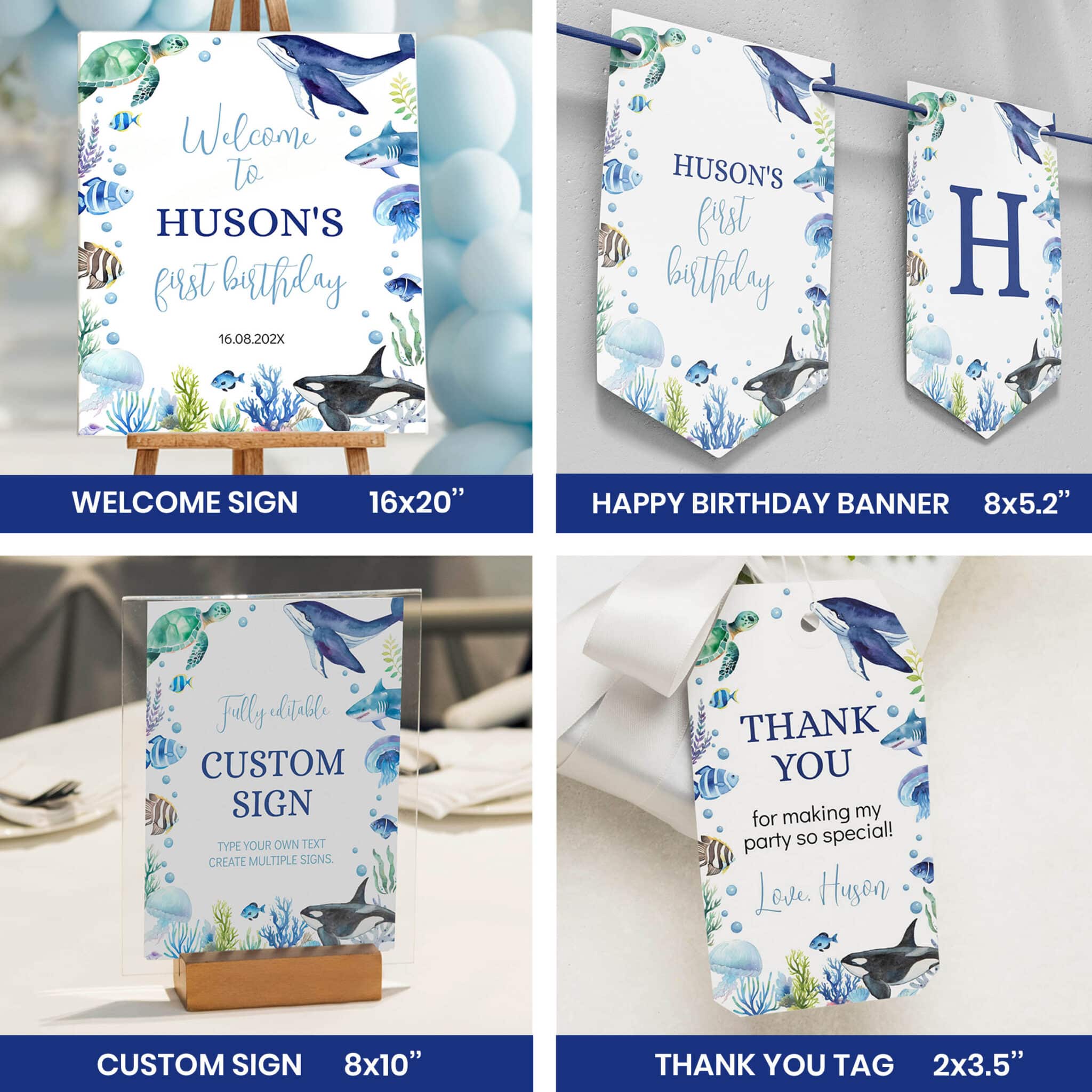 An access link to your editable ocean birthday bundle set will be sent to your e-mail address. The link allows you to edit, save and download your designs as JPG or PDF files. All the included designs and their sizes are: