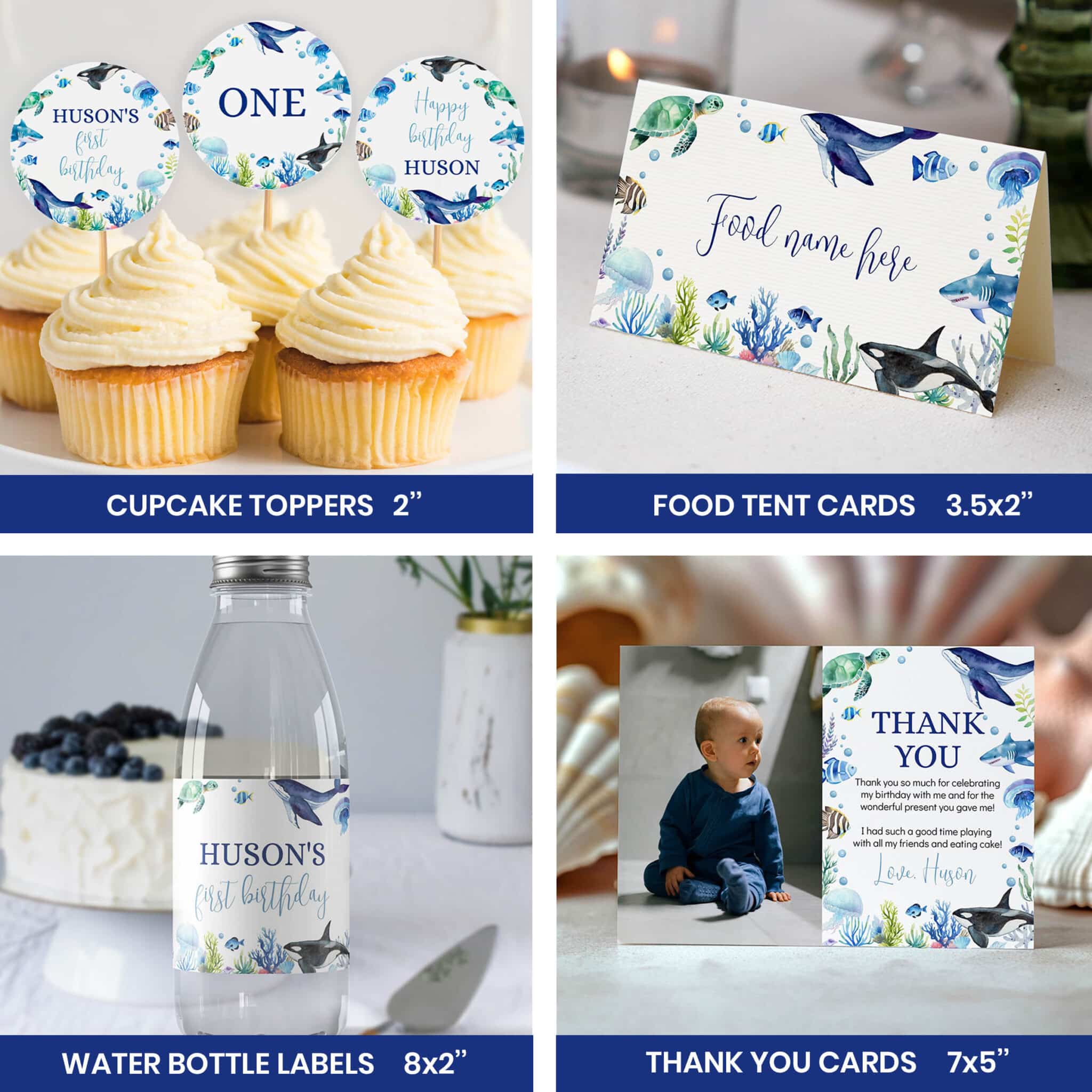 Our Ocean printable birthday bundle is the perfect solution if you’re looking for an all-in-one package of birthday decorations and invitations. The bundle includes a variety of Ocean Animals themed designs, including birthday invitations, banners, cupcake toppers, favor tags, and more. Each design can be easily customized to include personal details such as the birthday person’s name, date, or party information. See all the designs included in the bundle below.