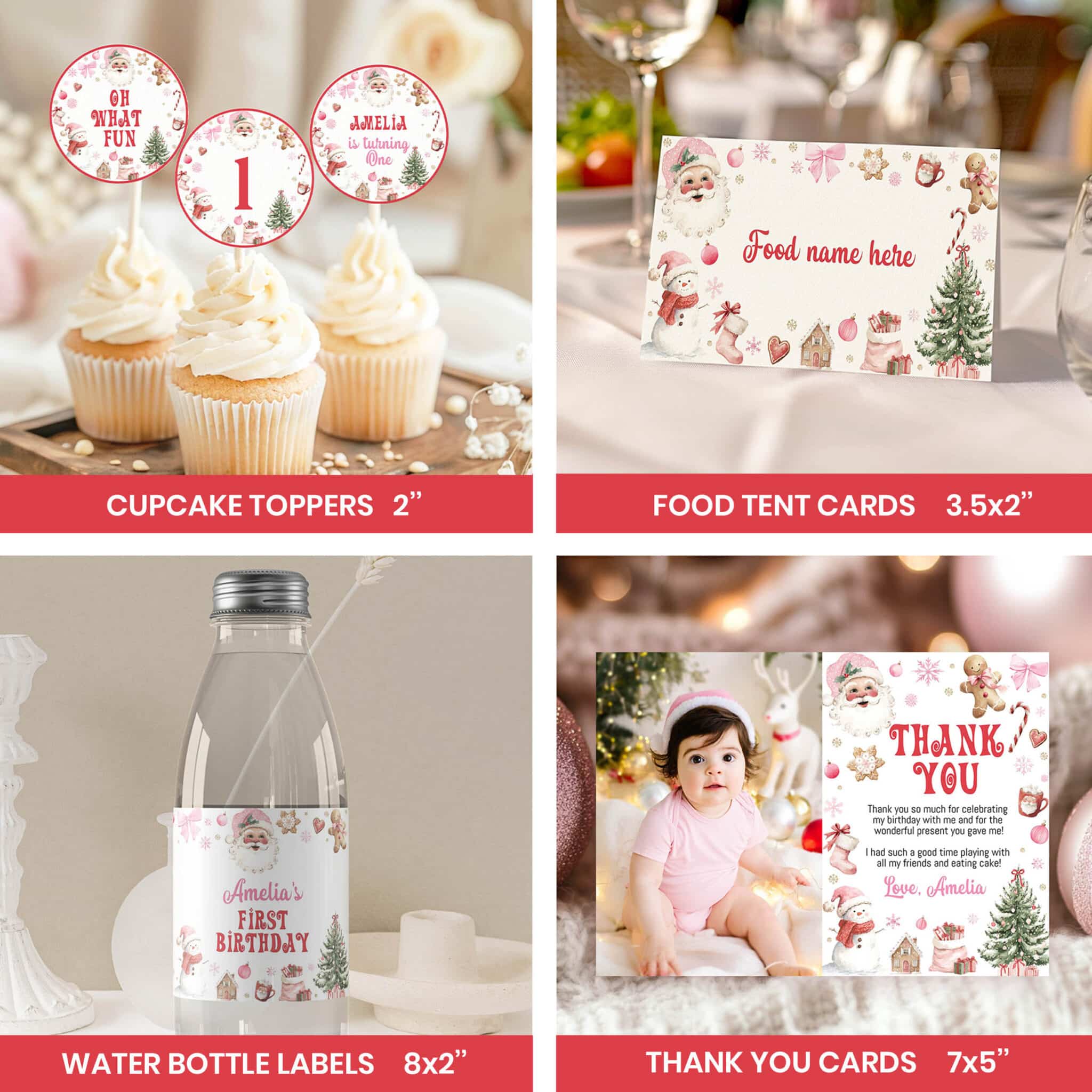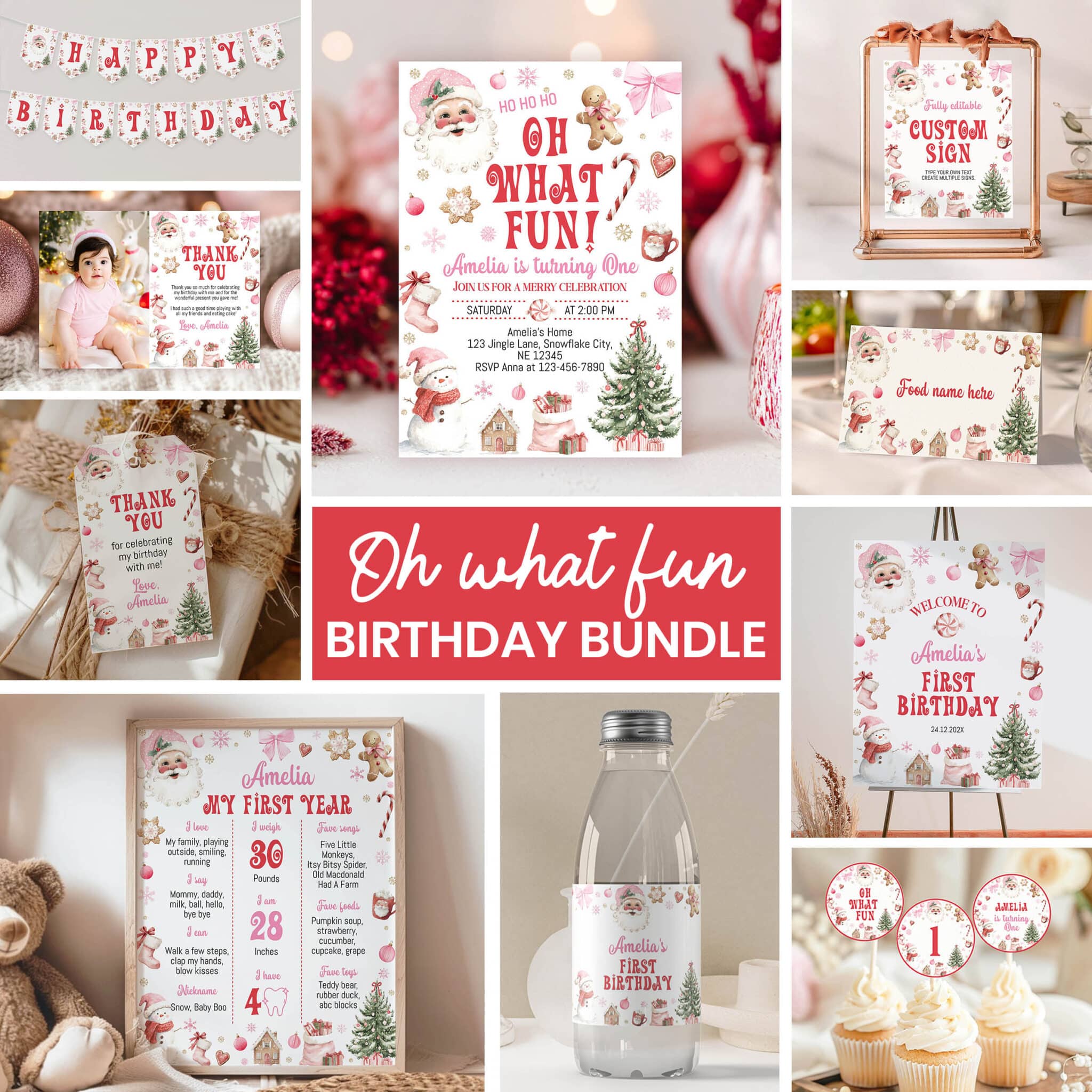 Get everything you need for an oh what fun Christmas birthday celebration with our festive watercolor party bundle! Perfect for a girl birthday, this all-in-one set features Santa Claus, snowy trees, and cozy holiday accents in pink and red with a sweet pink bow. The bundle includes invitations, banners, cupcake toppers, favor tags, and more—all fully customizable with your child’s name, date, and party details. A joyful and budget-friendly way to make your little one’s Santa Claus birthday or oh what fun Christmas birthday celebration truly magical and memorable. See the full bundle contents below!