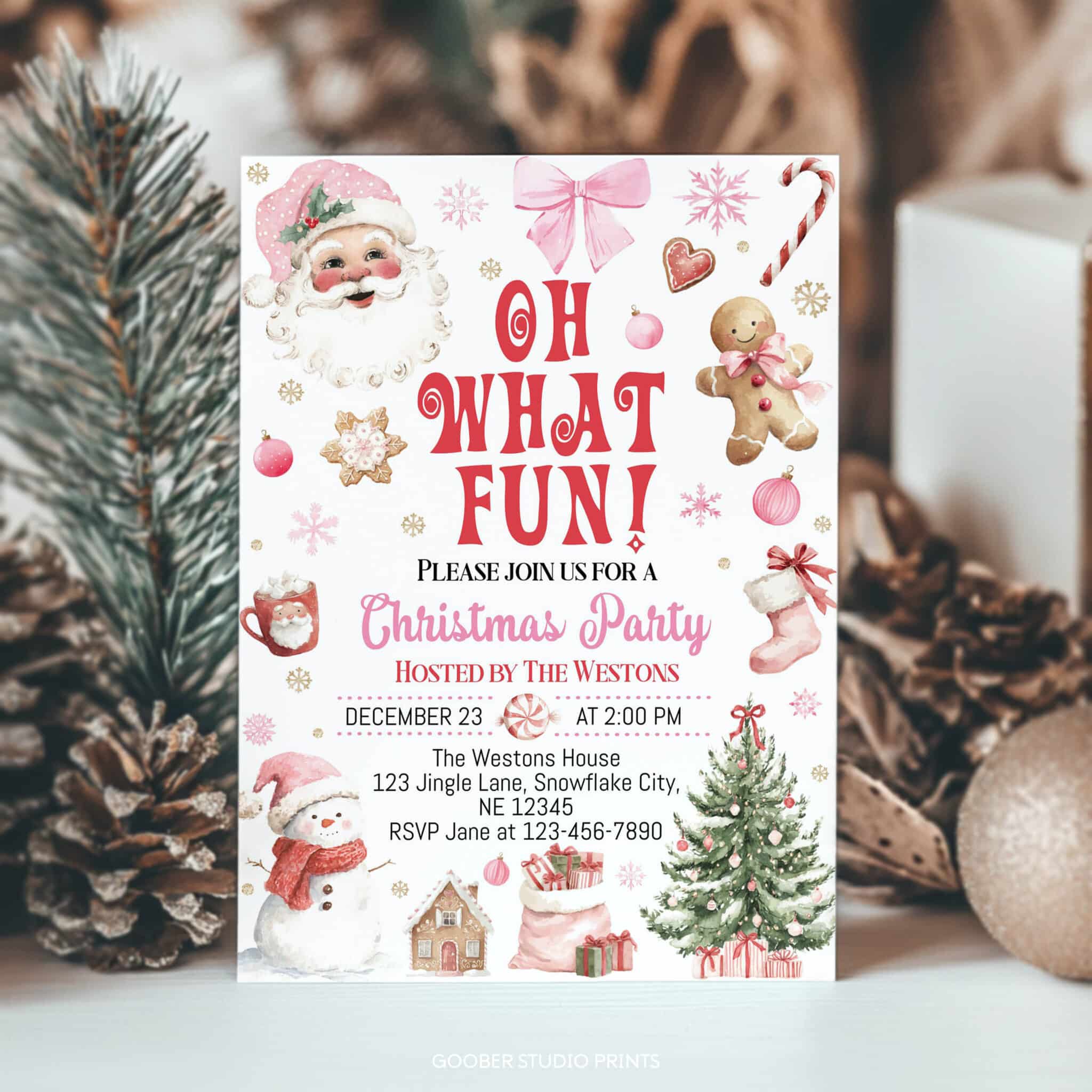 Bring the holiday cheer to life with our oh what fun Christmas party invitation! Perfect for a festive Santa Claus party, this joyful design features Santa, snowy trees, and playful holiday accents in pink and red with a sweet pink bow. Fully customizable with your event details—date, time, and location—it sets the perfect tone for a merry and magical celebration. Easy to personalize and print at home, this invitation is a fun and budget-friendly way to make your Christmas party truly unforgettable!