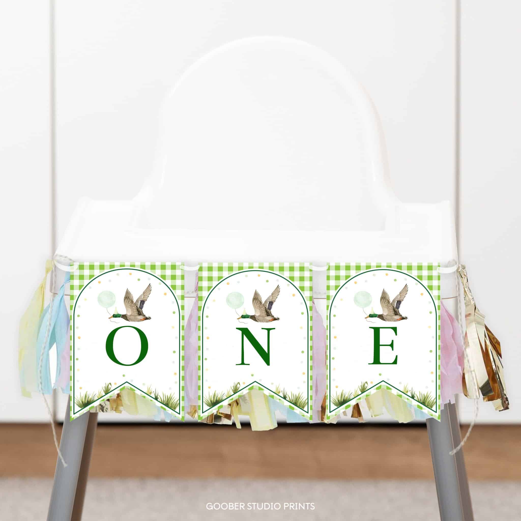 Make your baby boy’s one lucky duck birthday unforgettable with our watercolor mallard highchair banner! Featuring a delightful watercolor mallard and a classic green gingham pattern, this charming design spells out ‘one,’ make their highchair the centerpiece of the celebration. Easily printable at home, it’s perfect for creating a sweet and memorable duck-themed atmosphere.