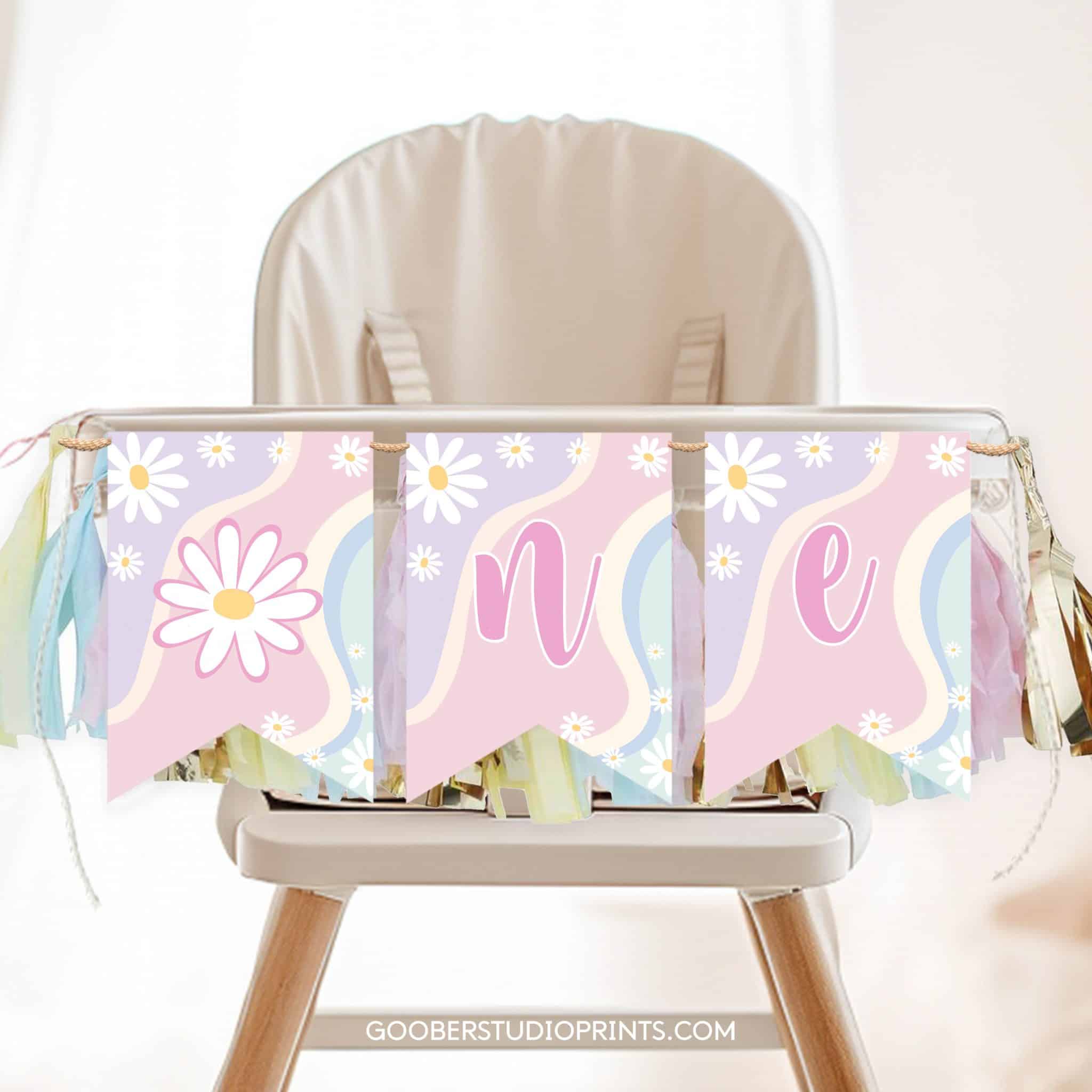 Our Pastel Daisy printable first birthday highchair banner is the perfect way to make a little one’s first birthday celebration extra special. The design features colorful and playful letters spelling out “ONE” along with cute illustrations that will make their highchair stand out. The banner can be easily printed at home on standard paper and strung up to decorate the highchair. It is a great way to create a festive and memorable atmosphere for your baby’s first birthday celebration.