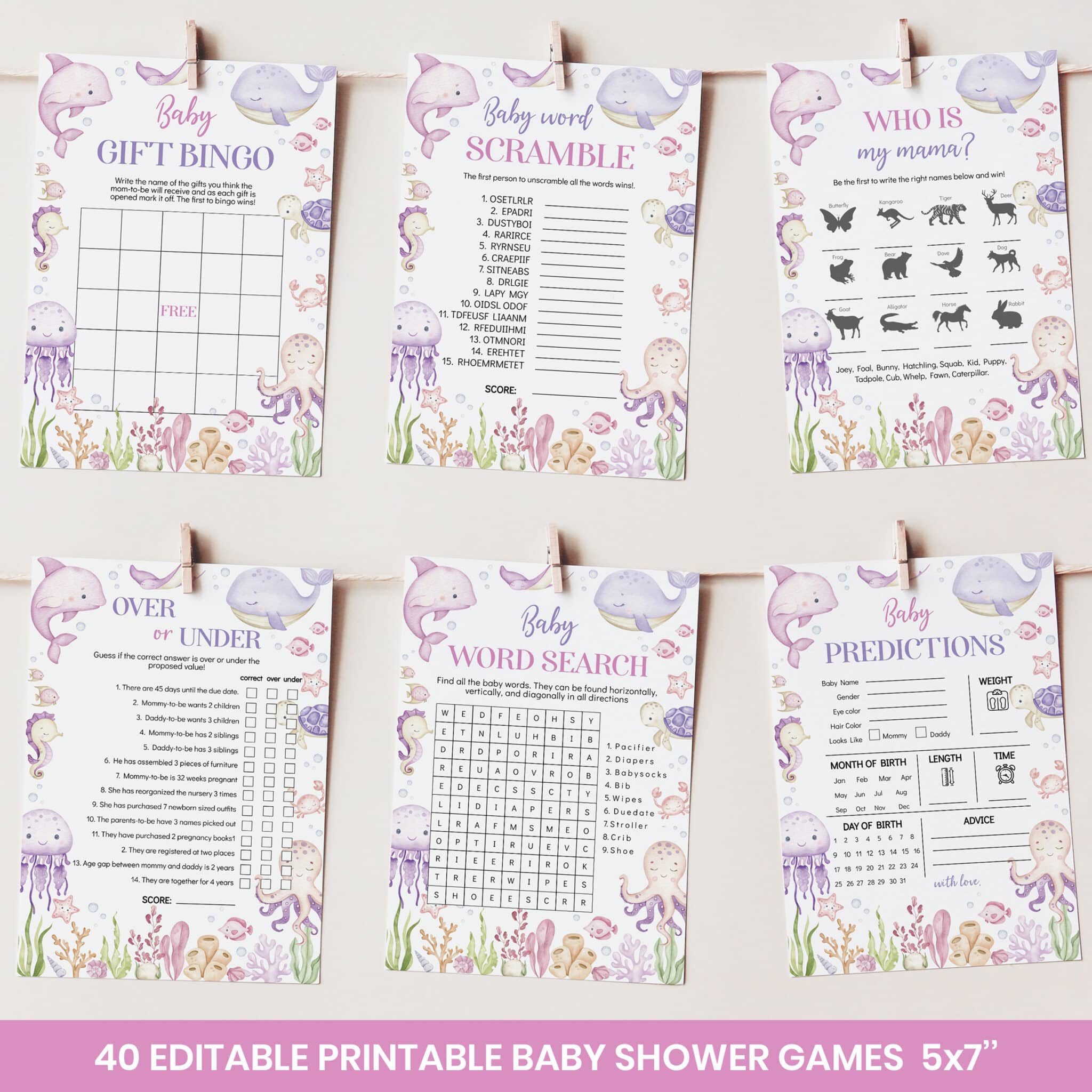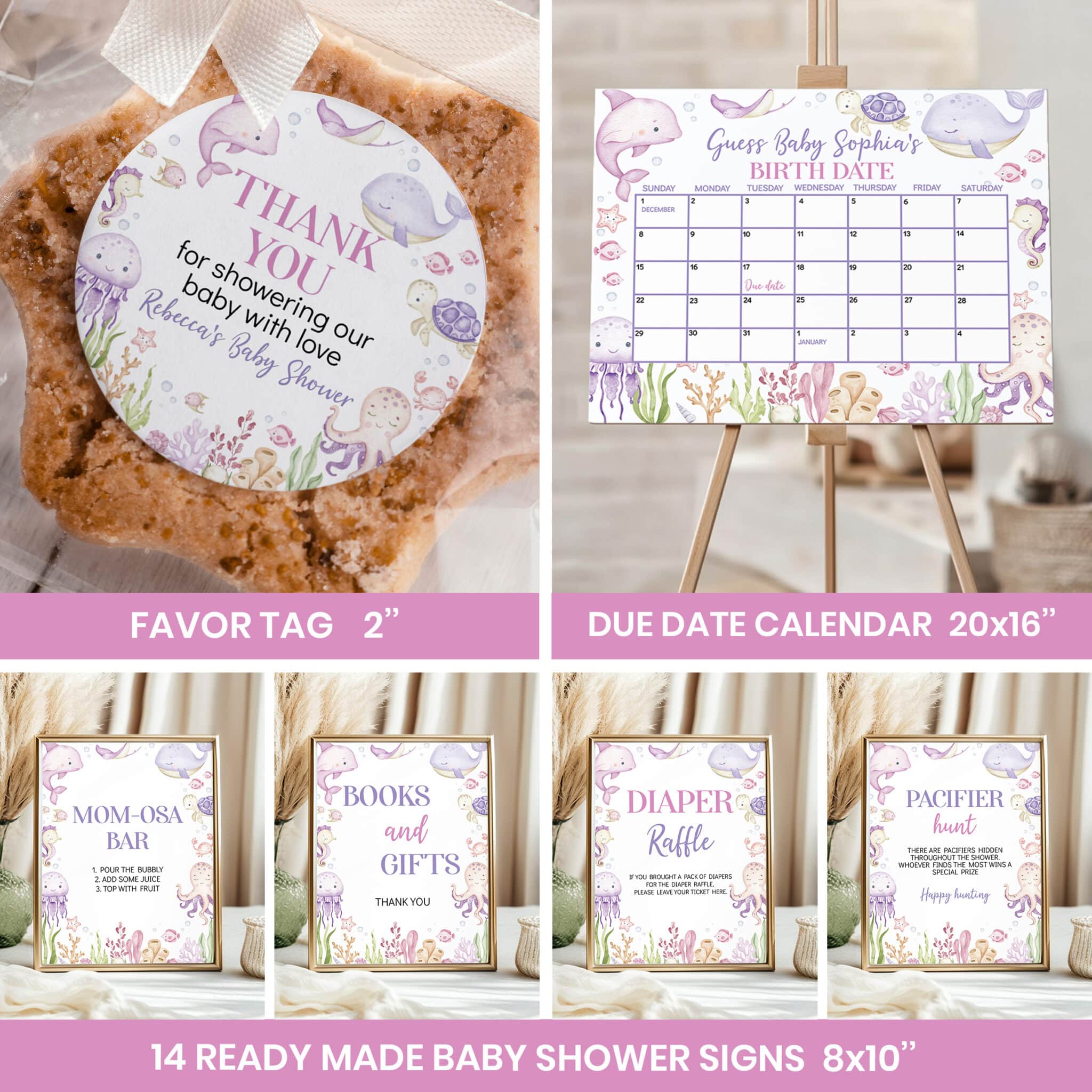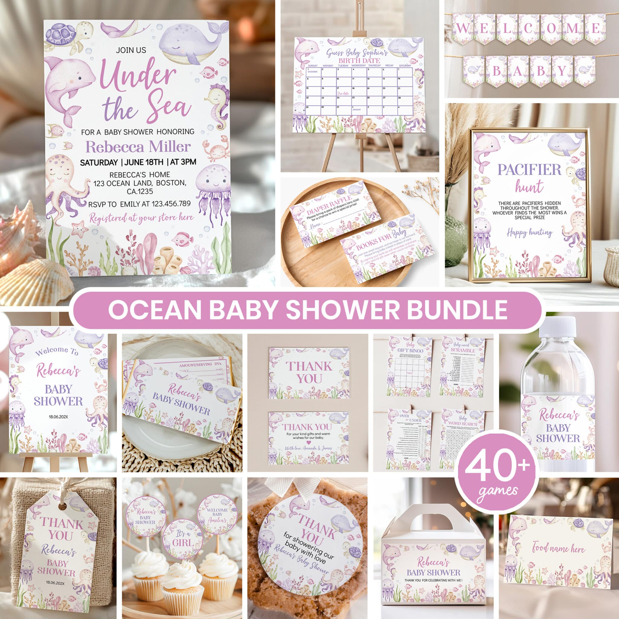 Host a memorable celebration with our pastel under the sea baby shower bundle, designed especially for welcoming your baby girl. Featuring adorable watercolor ocean animals and soft pastel accents, this all-in-one set is perfect for an ocean themed party. The bundle includes customizable invitations, thank you cards, 14 pre-made signs, 40 fun baby shower games with answers, and more—all personalized with your name and shower details. A complete and charming way to create an unforgettable under the sea celebration.