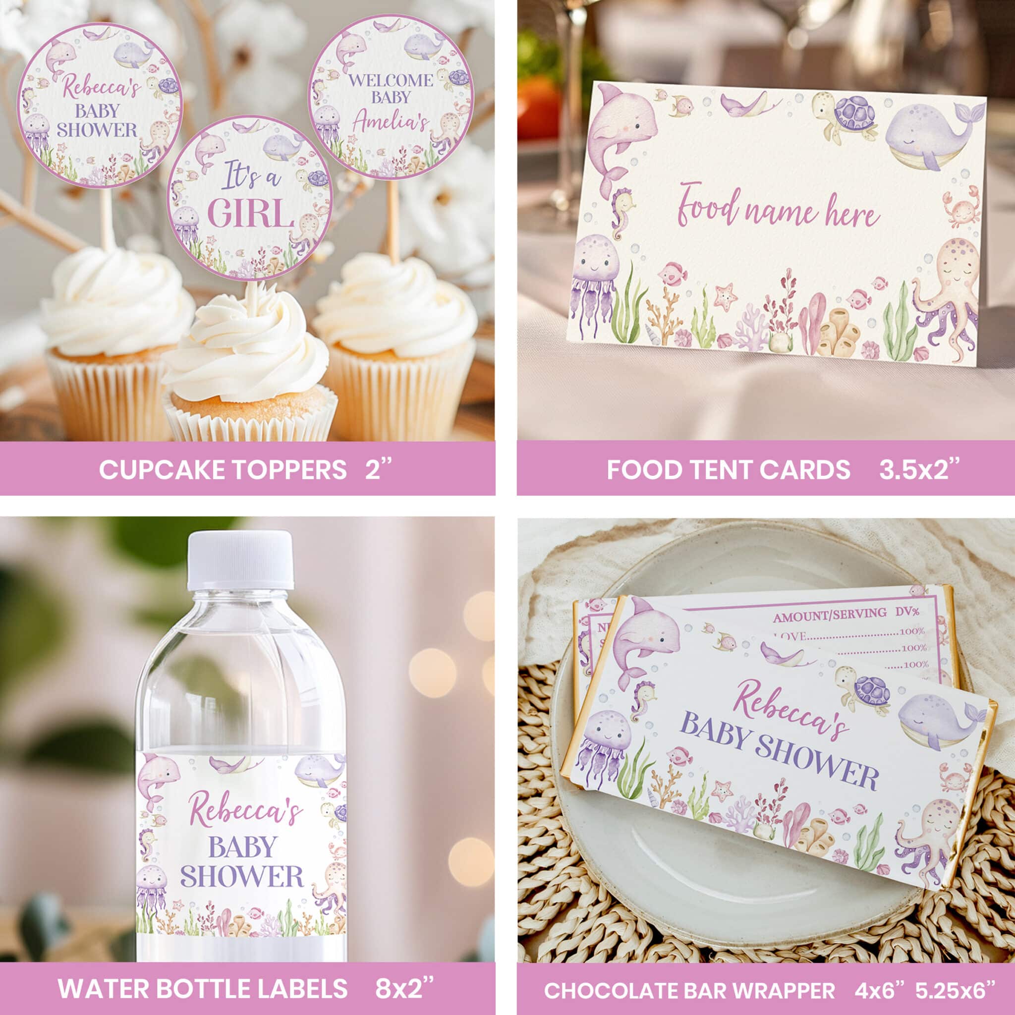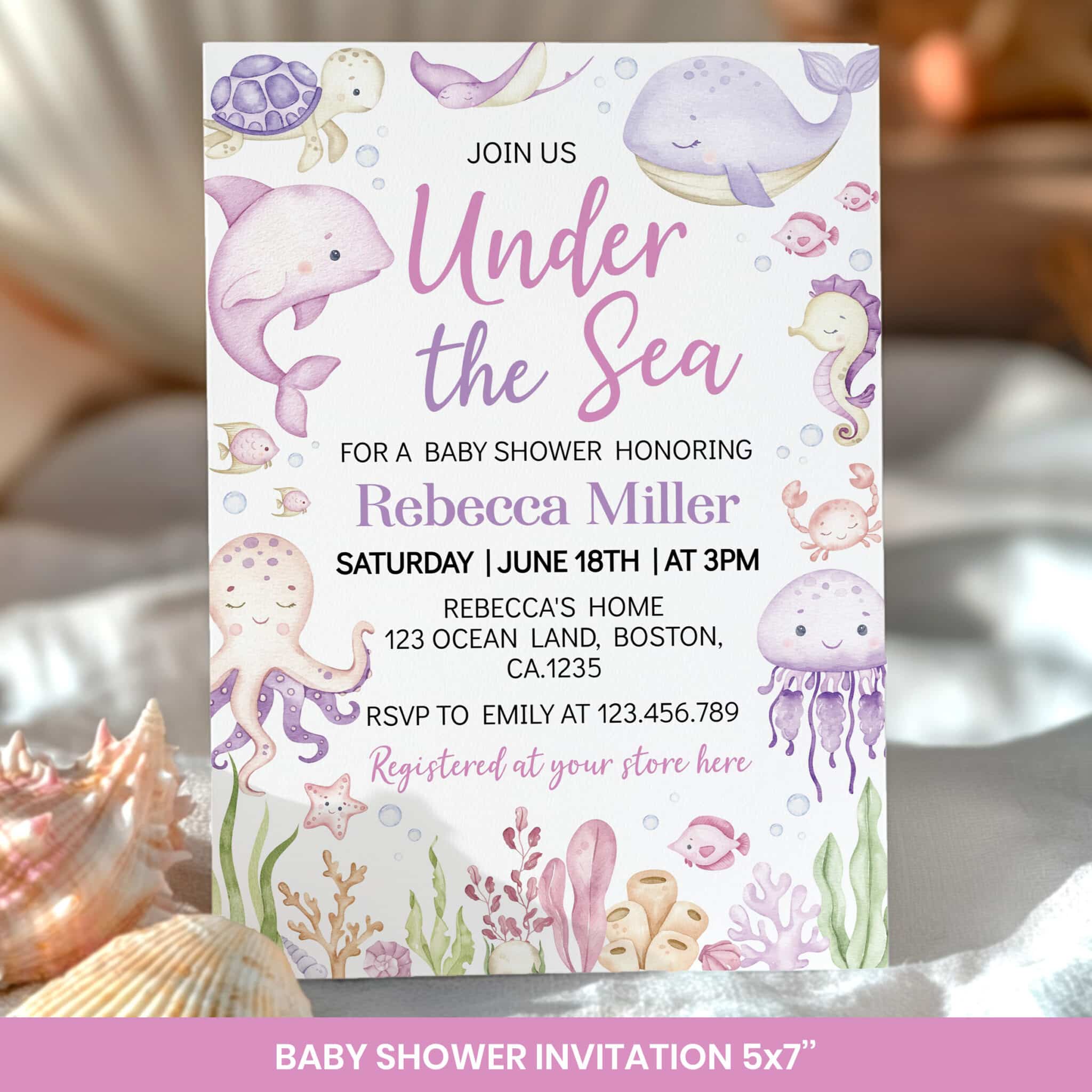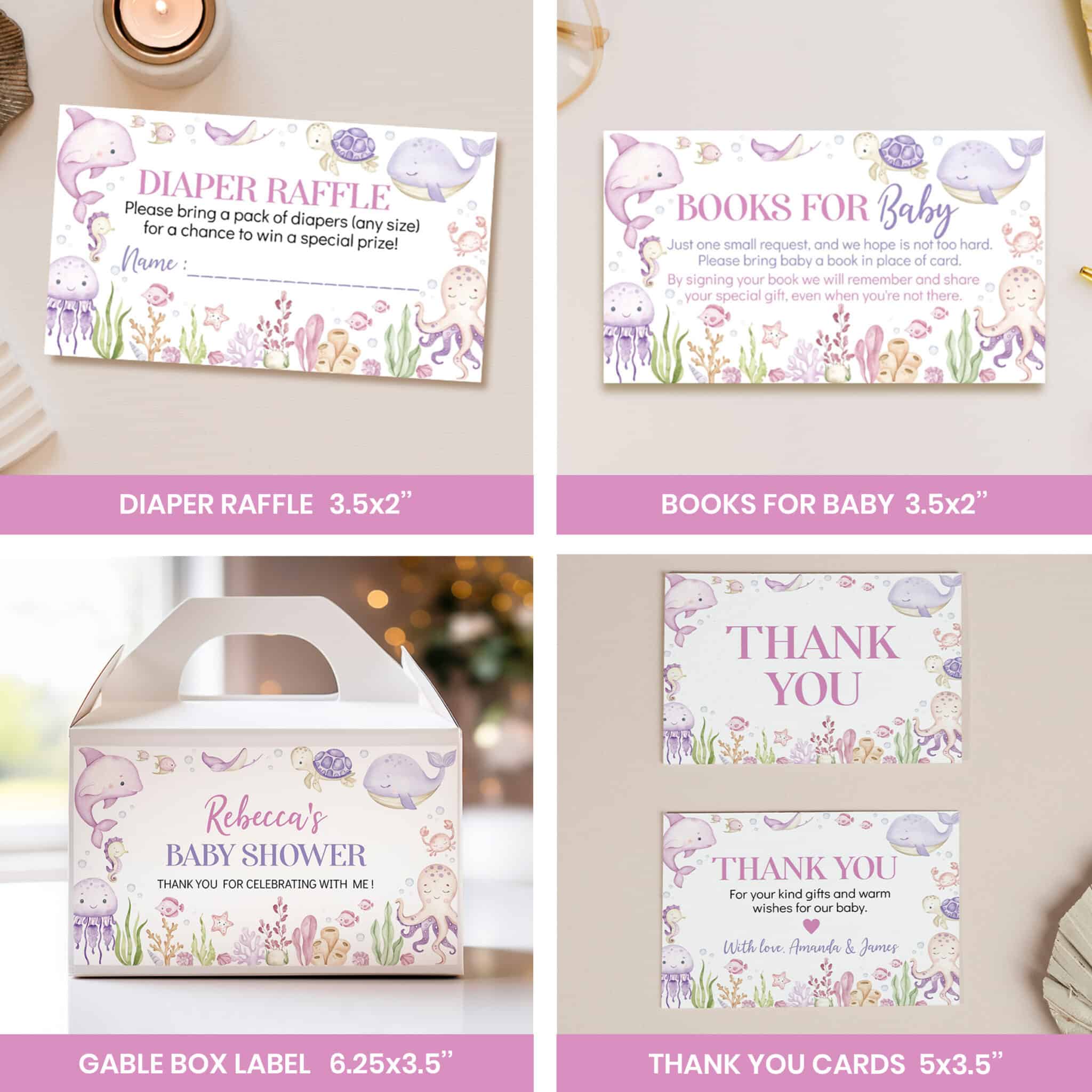 Host a memorable celebration with our pastel under the sea baby shower bundle, designed especially for welcoming your baby girl. Featuring adorable watercolor ocean animals and soft pastel accents, this all-in-one set is perfect for an ocean themed party. The bundle includes customizable invitations, thank you cards, 14 pre-made signs, 40 fun baby shower games with answers, and more—all personalized with your name and shower details. A complete and charming way to create an unforgettable under the sea celebration.