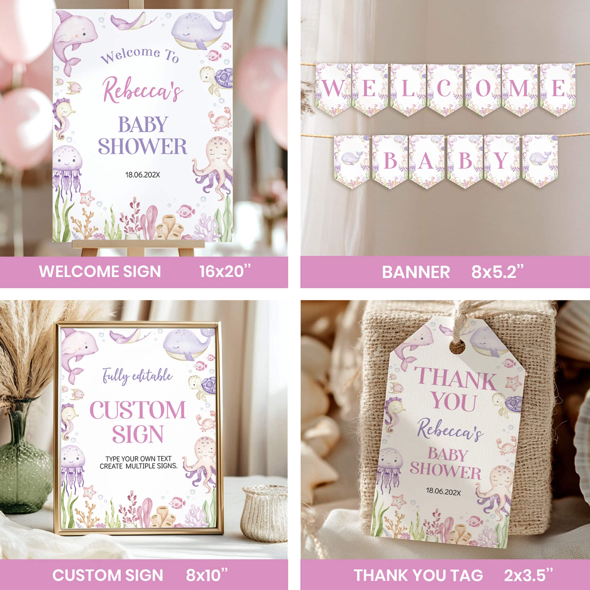 An access link to your editable ocean baby shower bundle set will be sent to your e-mail address. The link allows you to edit, save and download your designs as JPG or PDF files. All the included designs and their sizes are: