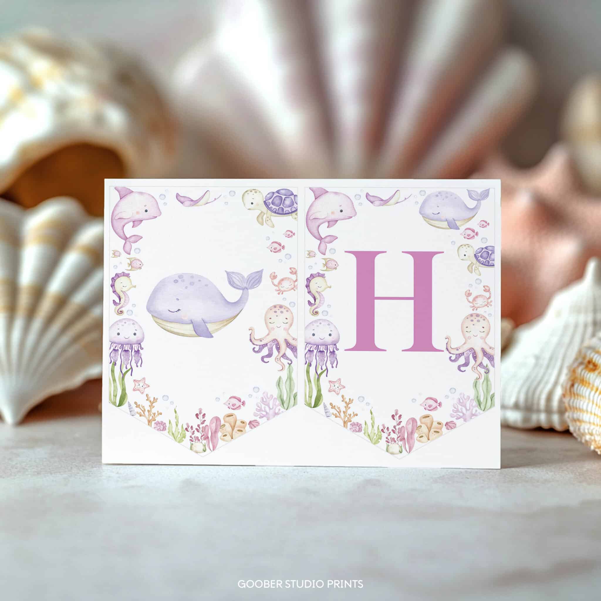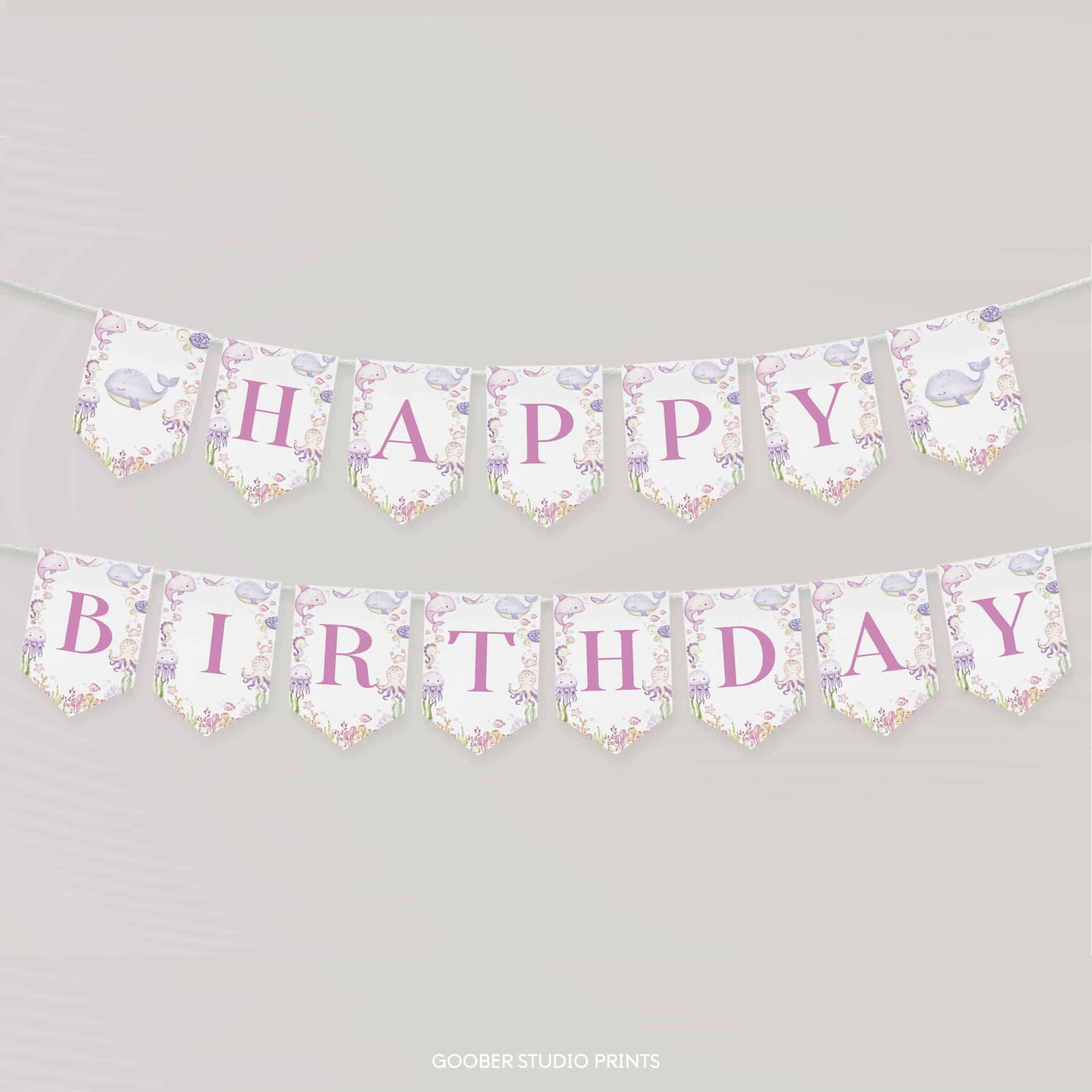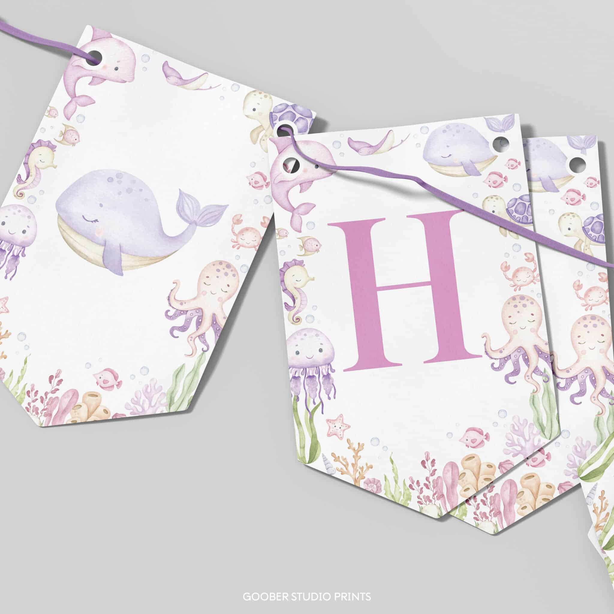Bring ocean magic to your little girl’s celebration with our watercolor under the sea birthday banner. Featuring adorable ocean animals in soft pastel tones, this charming decoration spells out “Happy Birthday” in a playful nautical style. Perfect for an ocean themed birthday party or girl birthday celebration, the banner can be personalized with your child’s name and age for a special touch. Simply print and hang to create a whimsical underwater wonderland. A must-have for your under the sea party décor!