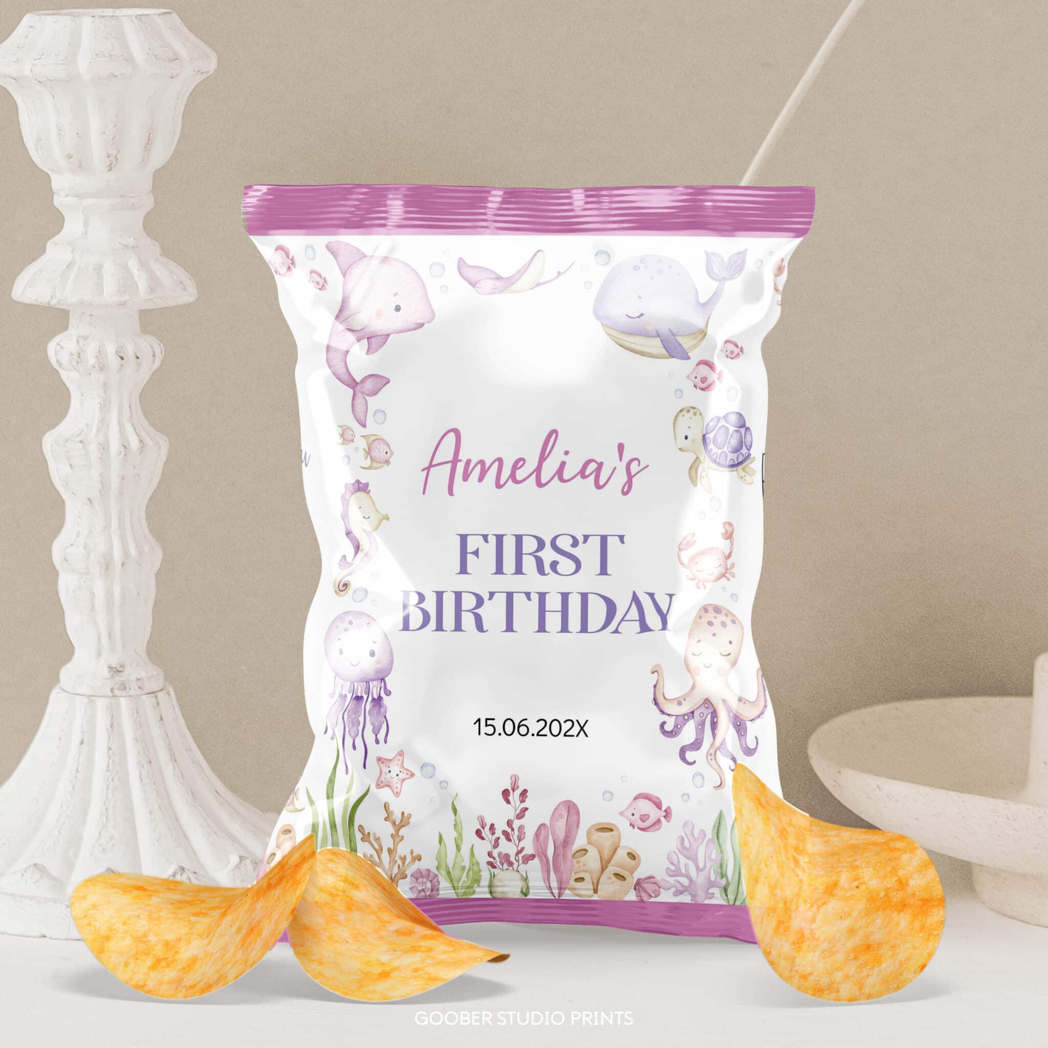 Bring under the sea magic to your girl’s birthday with our pastel ocean animals chip bag. Featuring a soft watercolor design with whales, turtles, and jellyfish, this printable is perfect for an ocean themed birthday party. Personalize with your child’s name and age for a sweet custom touch, then print and assemble at home for an easy party favor. A fun and festive addition to any girl birthday celebration.