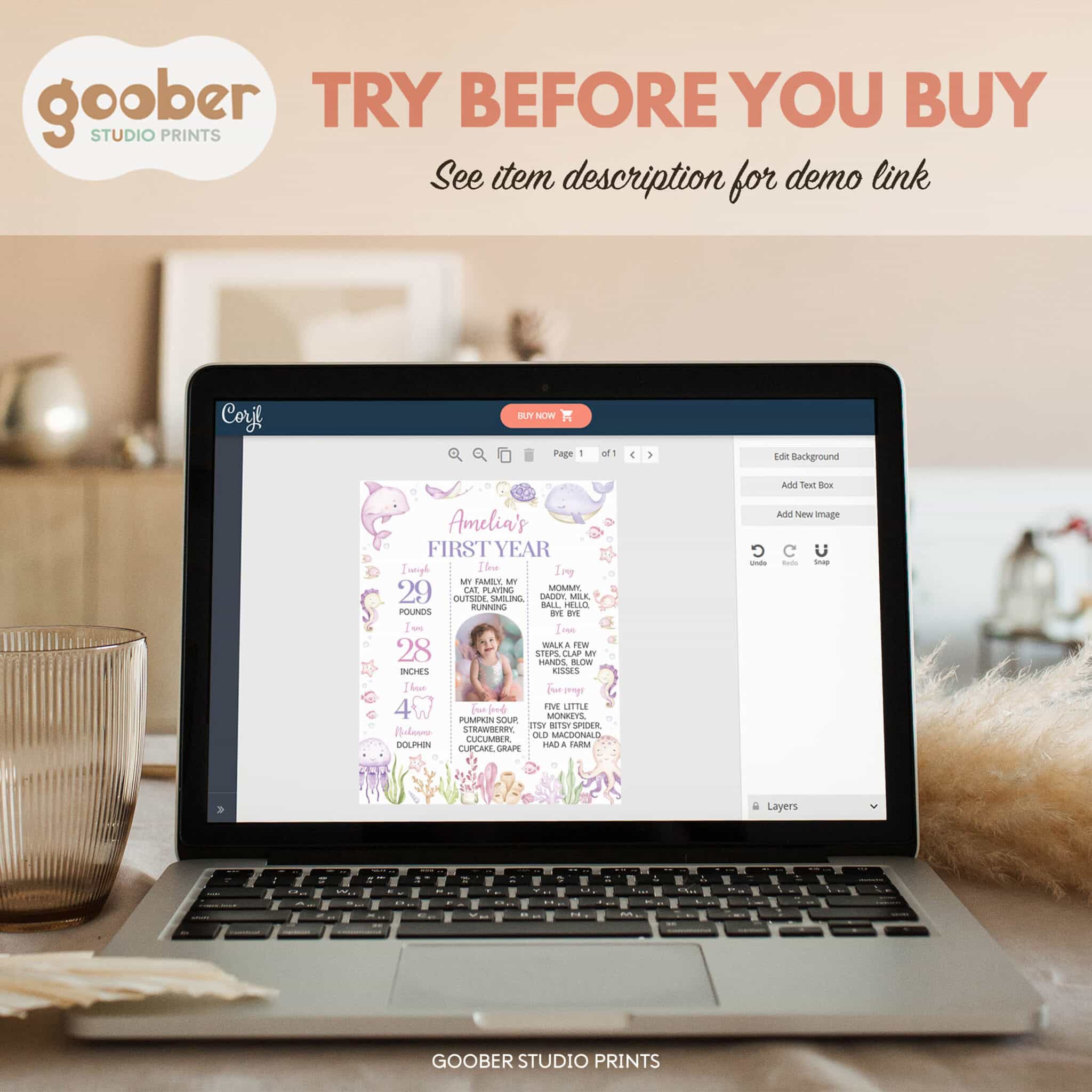 Celebrate your baby girl’s oneder the sea moment with our pastel under the sea milestone photo poster. Featuring adorable ocean animals in soft watercolor tones, this design is perfect for a girl birthday and an ocean themed birthday party. With space to showcase her name, milestones, and favorite memories, it’s a whimsical keepsake that adds charm to your under the sea celebration while creating a lasting memento of her first year.