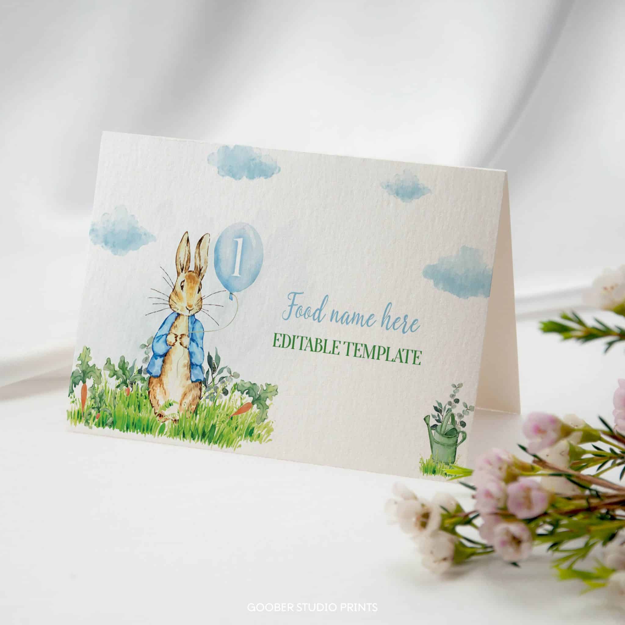 Label your party menu with a whimsical touch using our peter rabbit food tent cards! Featuring sweet bunny illustrations, and greenery accents, these cards offer space to write dish names and add a charming touch to your buffet or dessert table. Easily customizable and printable at home on standard cardstock, they’re perfect for organizing food at any bunny-themed boy birthday celebration.