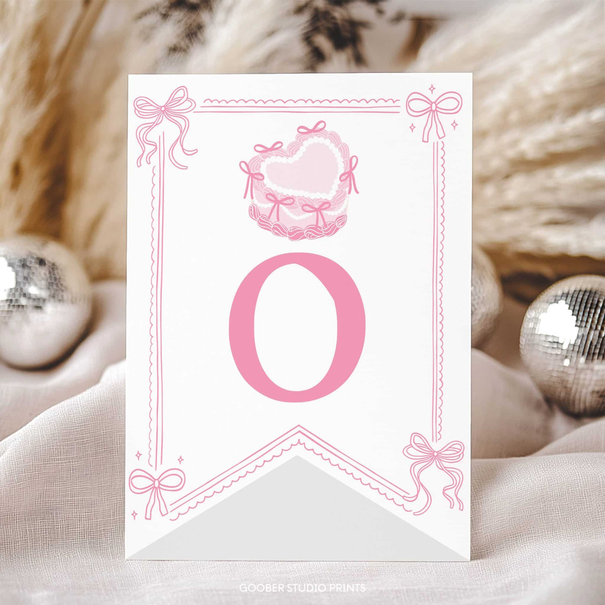 Make your little girl’s birthday extra sweet with our pink bow highchair banner! Featuring a charming heart-shaped cake adorned with a delicate pink bow and ribbon accents, this adorable design spells out ‘one’ in a whimsical style, making her highchair the centerpiece of the celebration. Easily printable at home, it’s perfect for creating a magical atmosphere for your pink bow-themed girl birthday party!