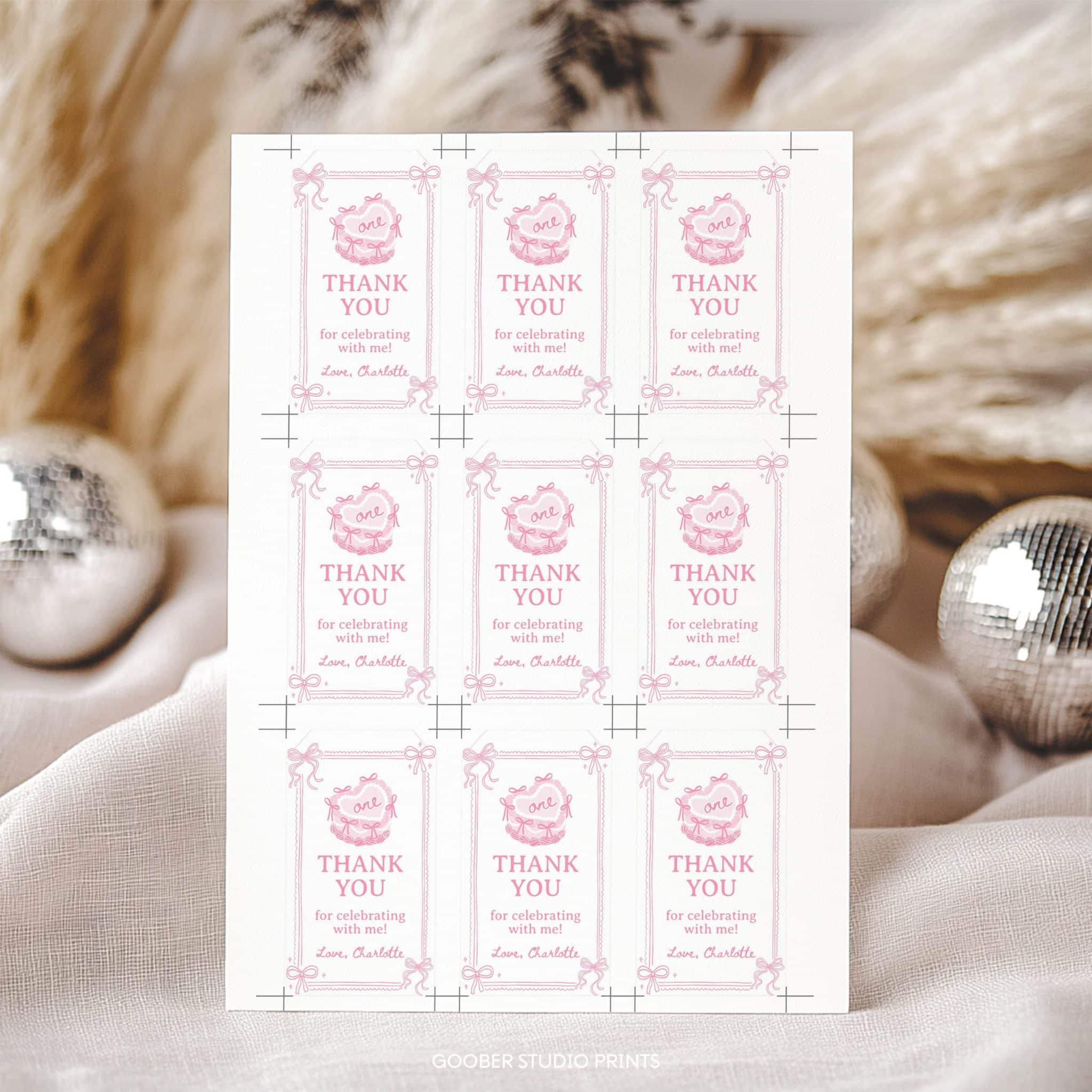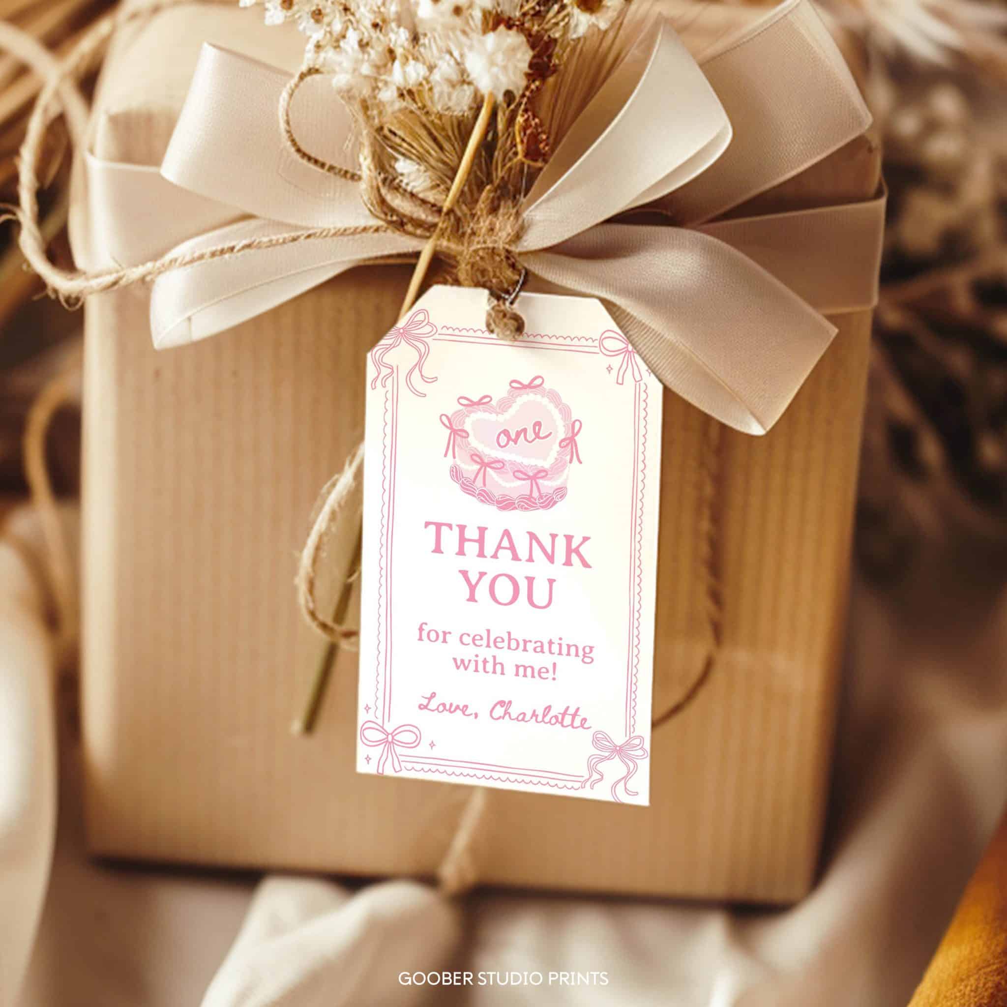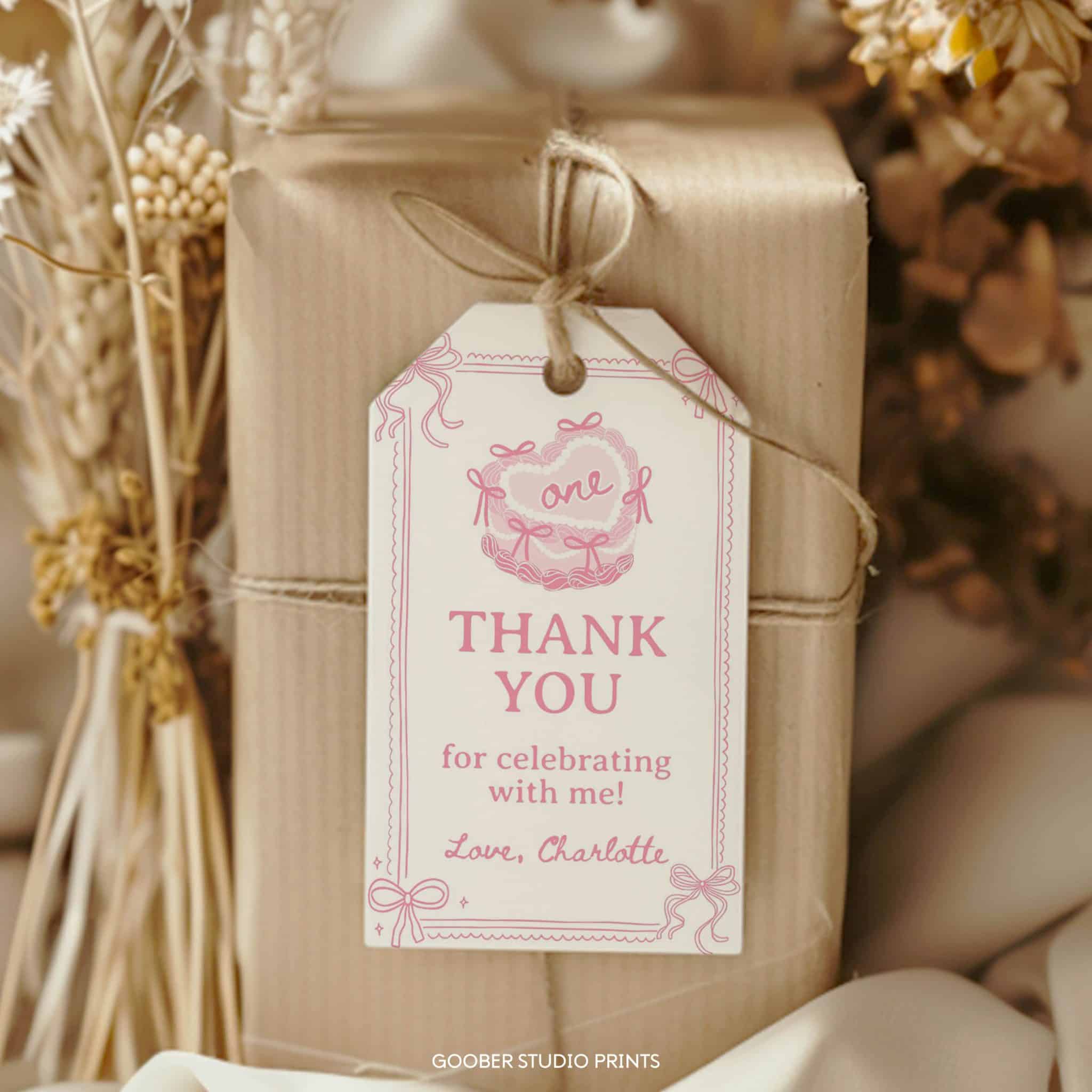 Show your gratitude with our pink bow birthday thank you tags! Featuring a charming heart-shaped cake adorned with a delicate pink bow and ribbon accents, these tags offer space for a personalized message or ‘thank you’ note. Easily customizable and printable at home on standard cardstock, they’re perfect for pink bow-themed girl birthday party celebration.