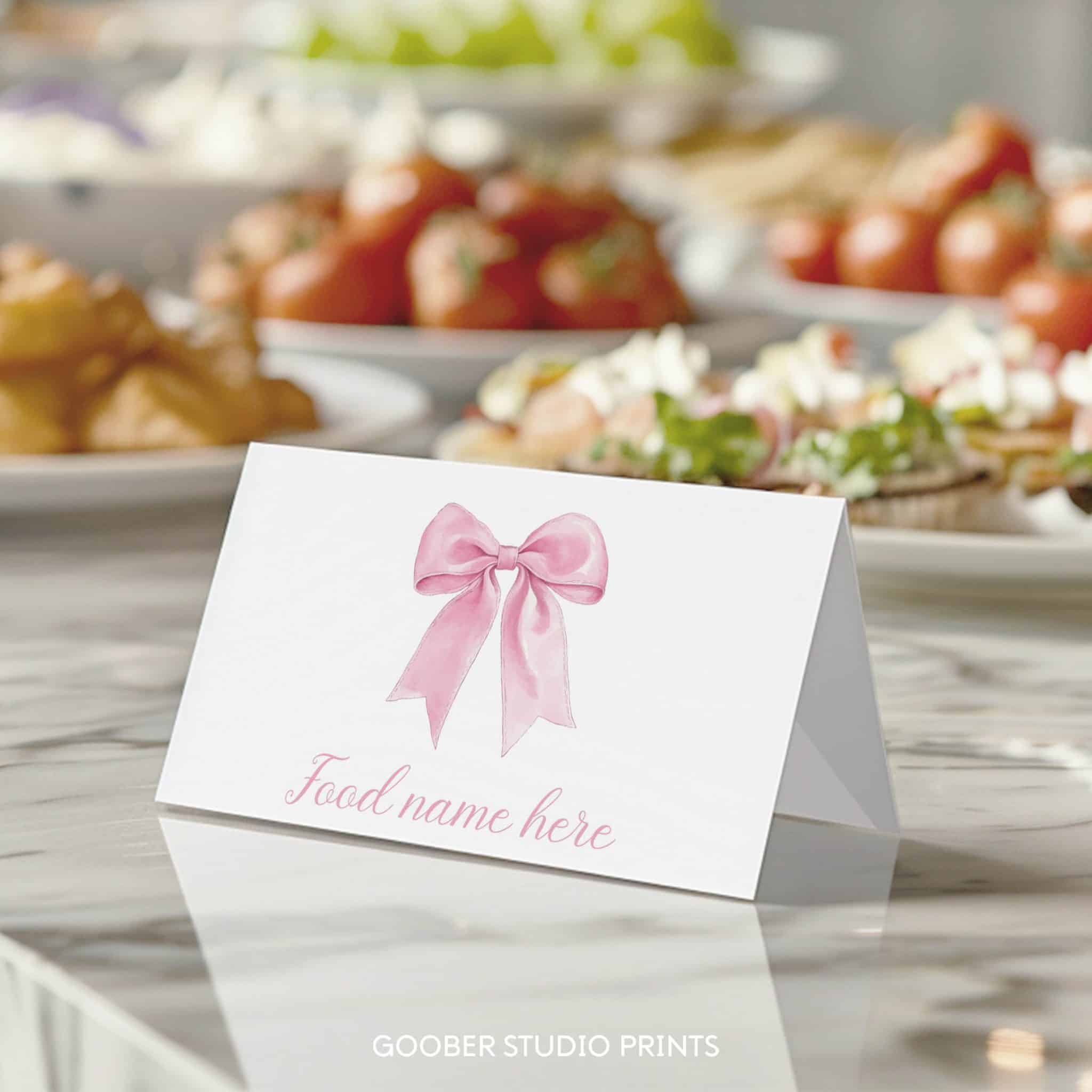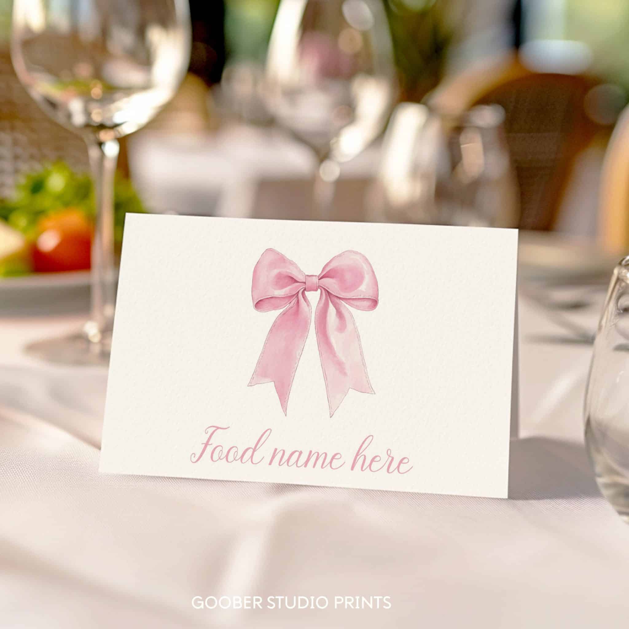 Add a sweet and stylish touch to your party menu with our pink bow food tent cards! Designed in a charming coquette style, these elegant cards feature a delicate pink bow and graceful ribbon accent, creating a sophisticated look. With space to write dish names, they’re perfect for enhancing your buffet or dessert table. Easily customizable and printable at home on standard cardstock, they’re a must-have for any pink bow-themed girl birthday celebration!