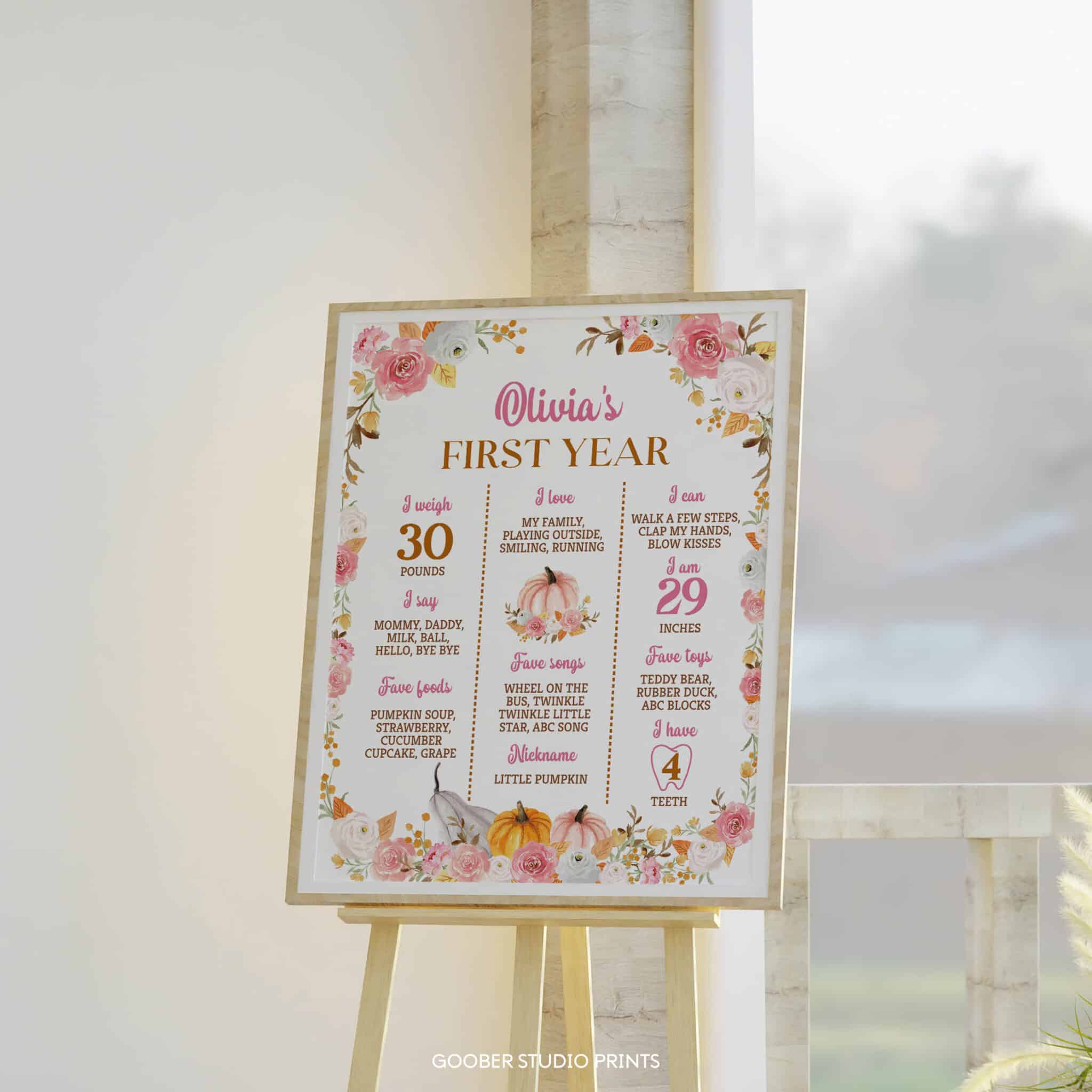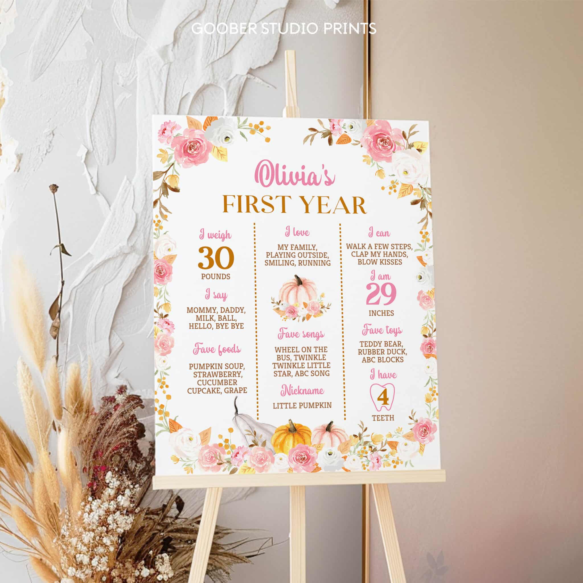 Celebrate your little pumpkin’s first year with our pink pumpkin milestone poster! Adorned with watercolor pumpkins, autumn fall florals, and soft pink accents, this keepsake is the perfect addition to a girl birthday celebration. Personalize with your baby girl’s name, milestones, favorites, and special memories to create a unique design. Both a charming party decoration and a treasured keepsake, this floral and pumpkin-inspired poster brings cozy autumn fall charm to your celebration.