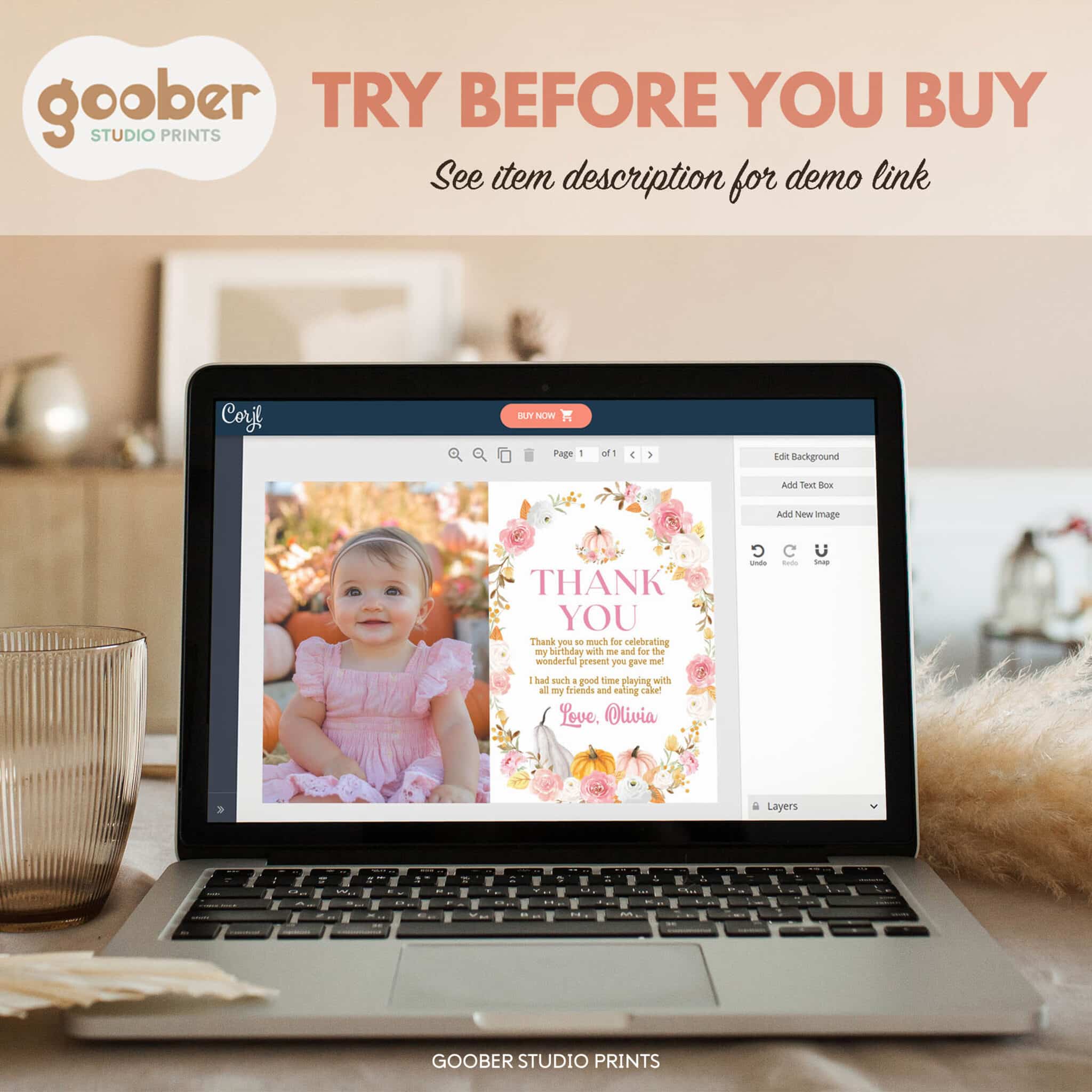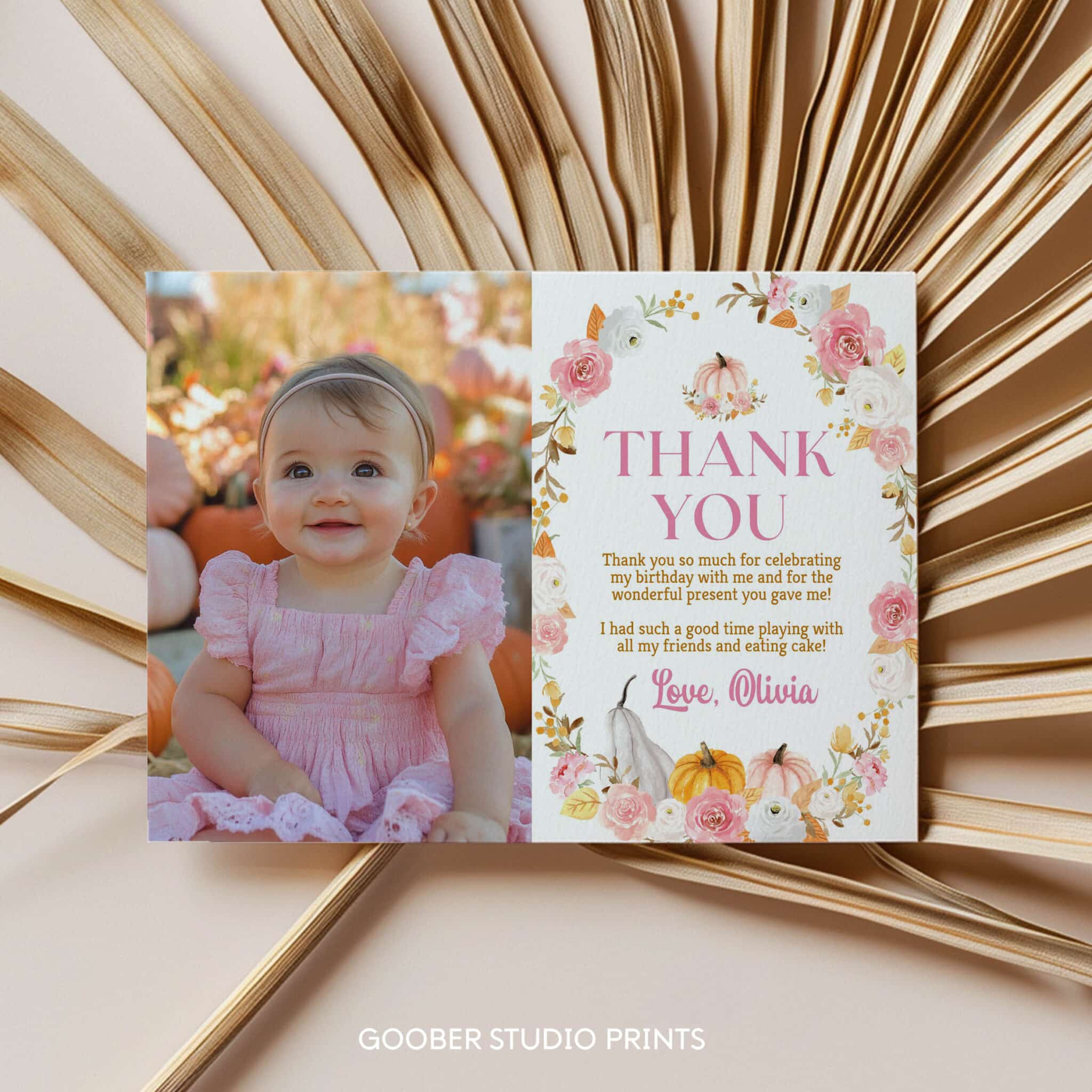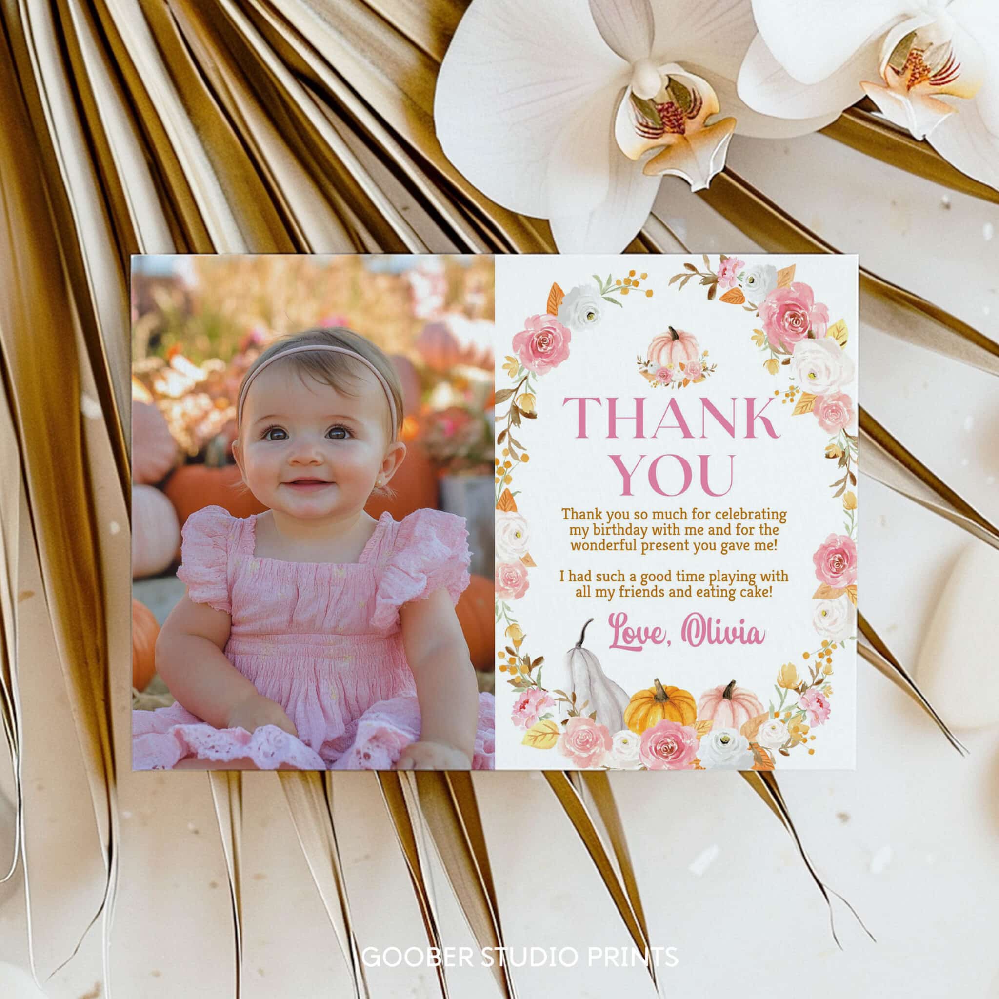 Send gratitude in style with our pink pumpkin birthday thank you cards! Adorned with watercolor pumpkins, autumn fall florals, and soft pink accents, these cards are perfect for a girl birthday celebration. Personalize with your own message to thank loved ones for sharing in your little pumpkin’s special day. A floral and pumpkin-inspired detail, they’re a charming way to complete your autumn fall party stationery.