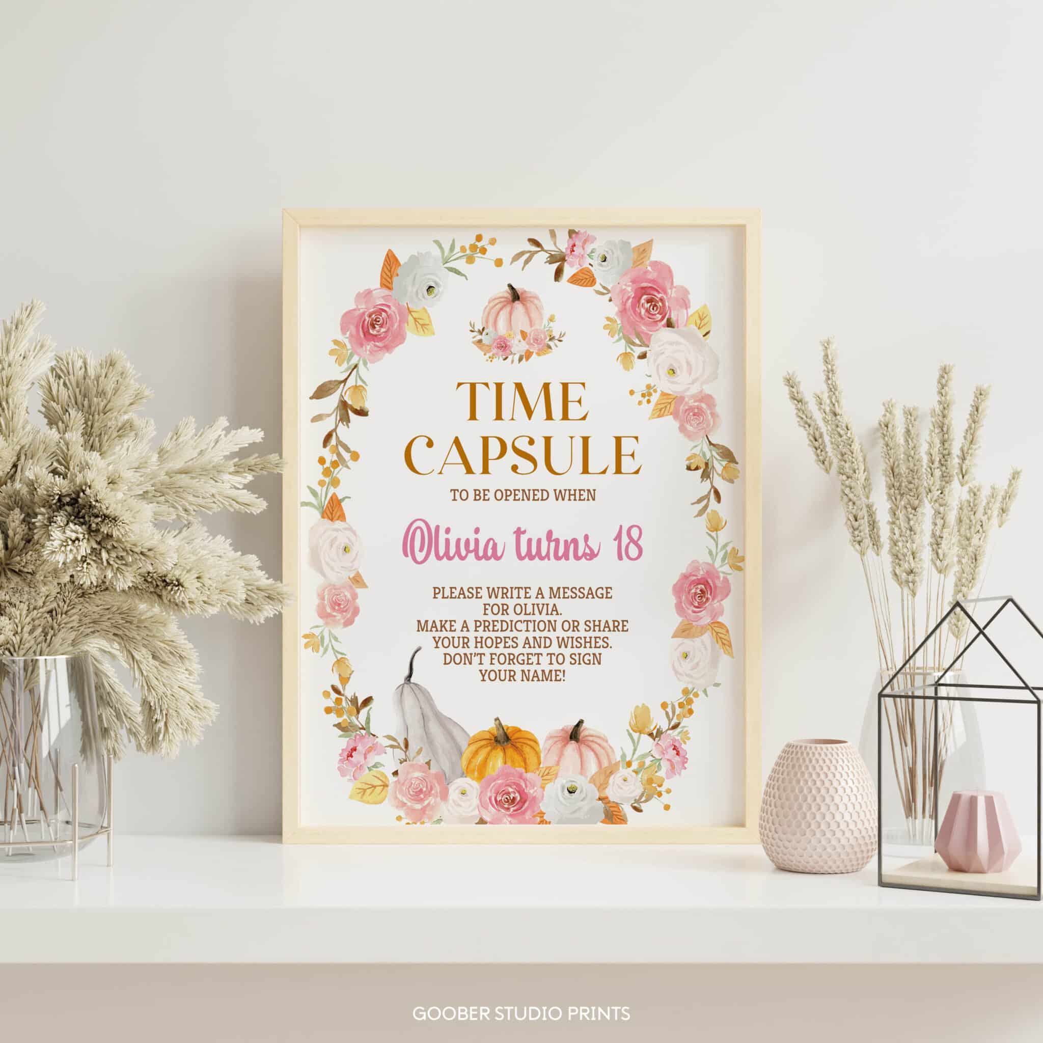 Celebrate your little pumpkin’s milestones with our pink pumpkin birthday time capsule set! Featuring watercolor pumpkins, autumn fall florals, and delicate pink accents, this set includes a time capsule sign and matching cards for guests to write heartfelt wishes, memories, and predictions for your baby girl’s future. Perfect for a girl birthday celebration, it adds a floral and pumpkin-inspired touch to your autumn fall party while creating a keepsake to treasure for years to come.