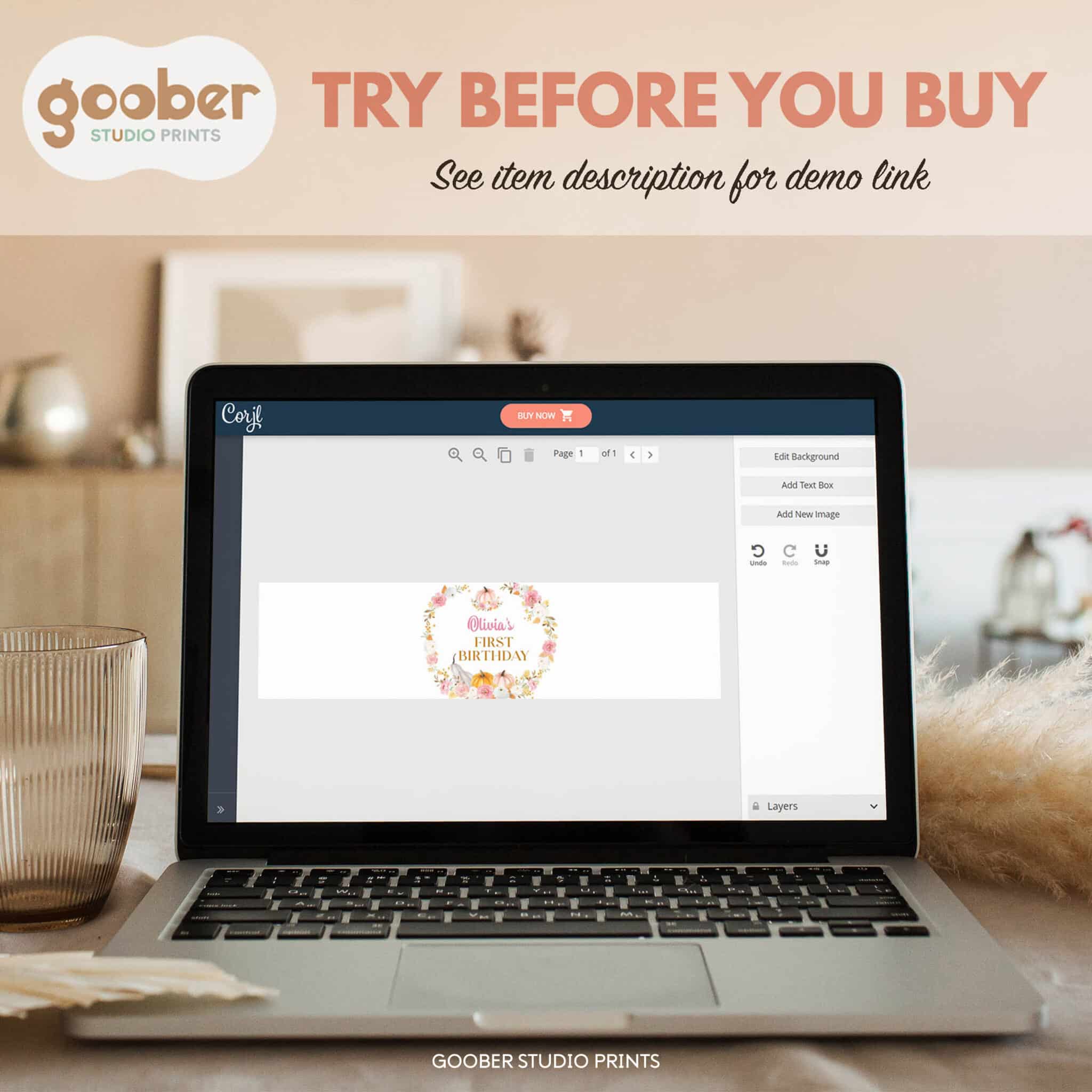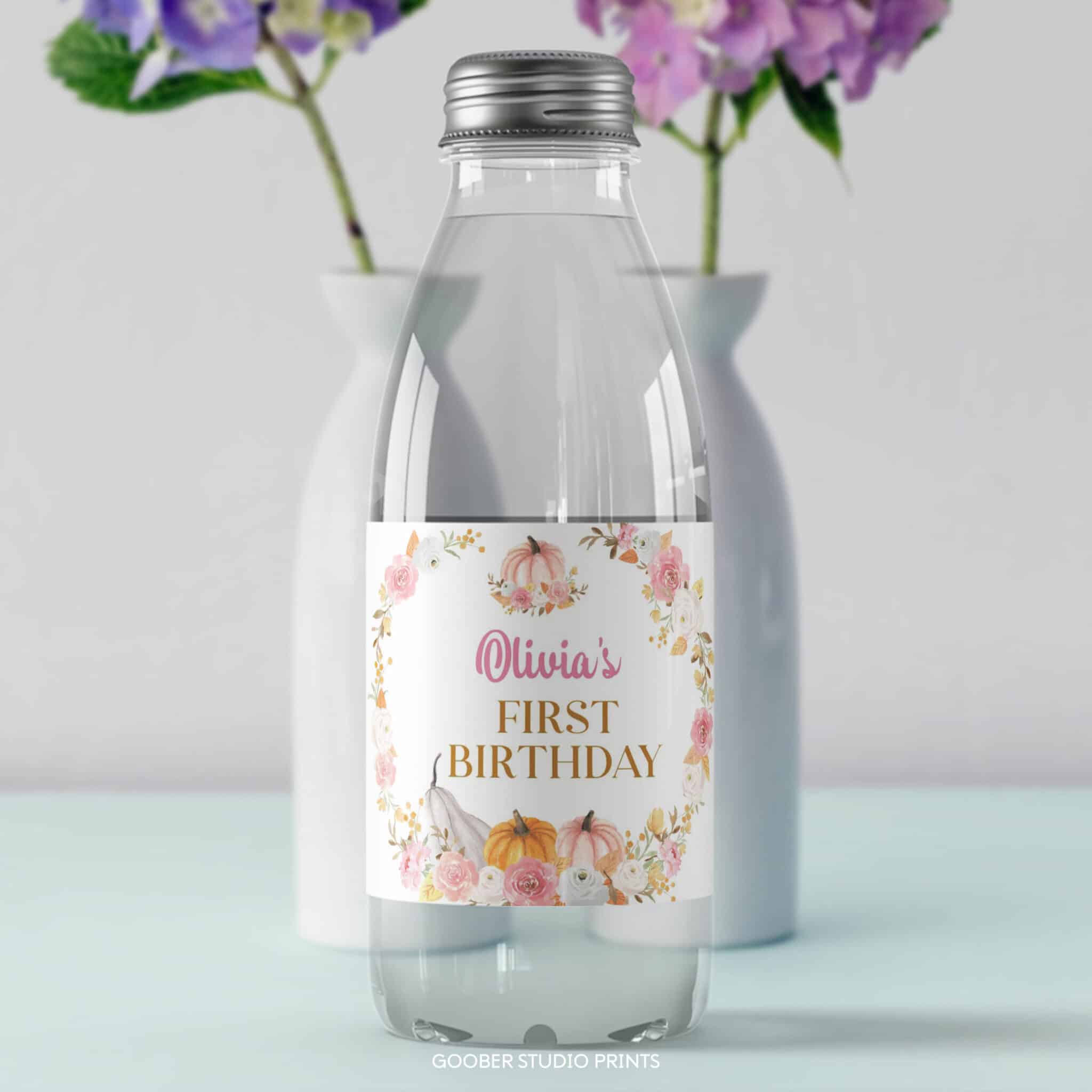 Dress up your drinks with our pink pumpkin water bottle labels! Featuring watercolor pumpkins, autumn fall florals, and soft pink accents, these labels are perfect for your little pumpkin’s girl birthday celebration. Personalize with your child’s name and age, then print at home to fit standard 8.5”x2” bottles. A simple and stylish way to add floral and pumpkin-inspired charm to your autumn fall party décor.