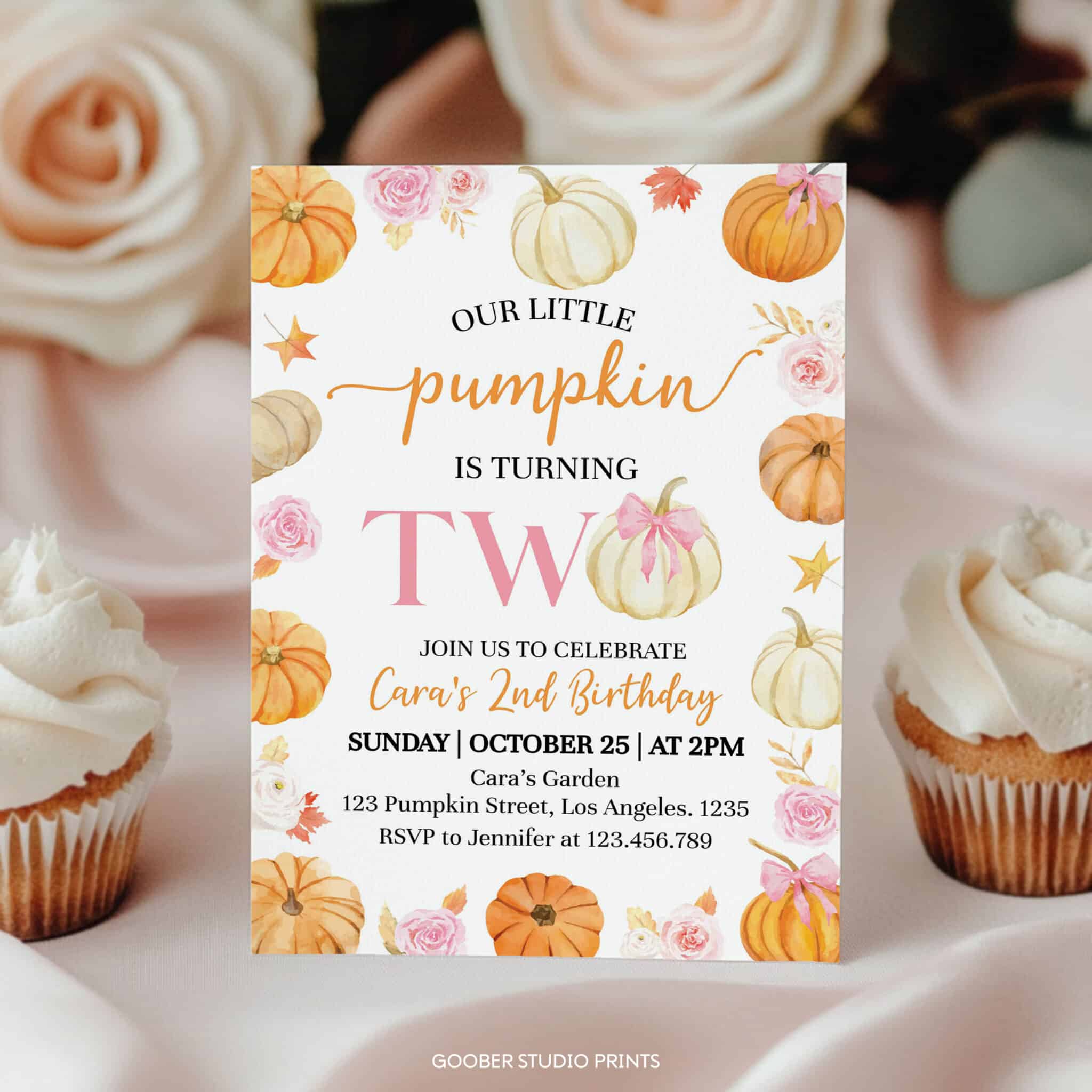 Invite friends and family to a cozy autumn fall celebration with our little pumpkin 2nd birthday invitation! Featuring charming pumpkins, soft floral accents, and a sweet pink bow detail in a watercolor design, this invite is perfect for a girl birthday party. Personalize with all the important details—date, time, and location—and easily print at home for a convenient and delightful touch. Celebrate your little pumpkin in style with this beautifully crafted floral and pumpkin design!