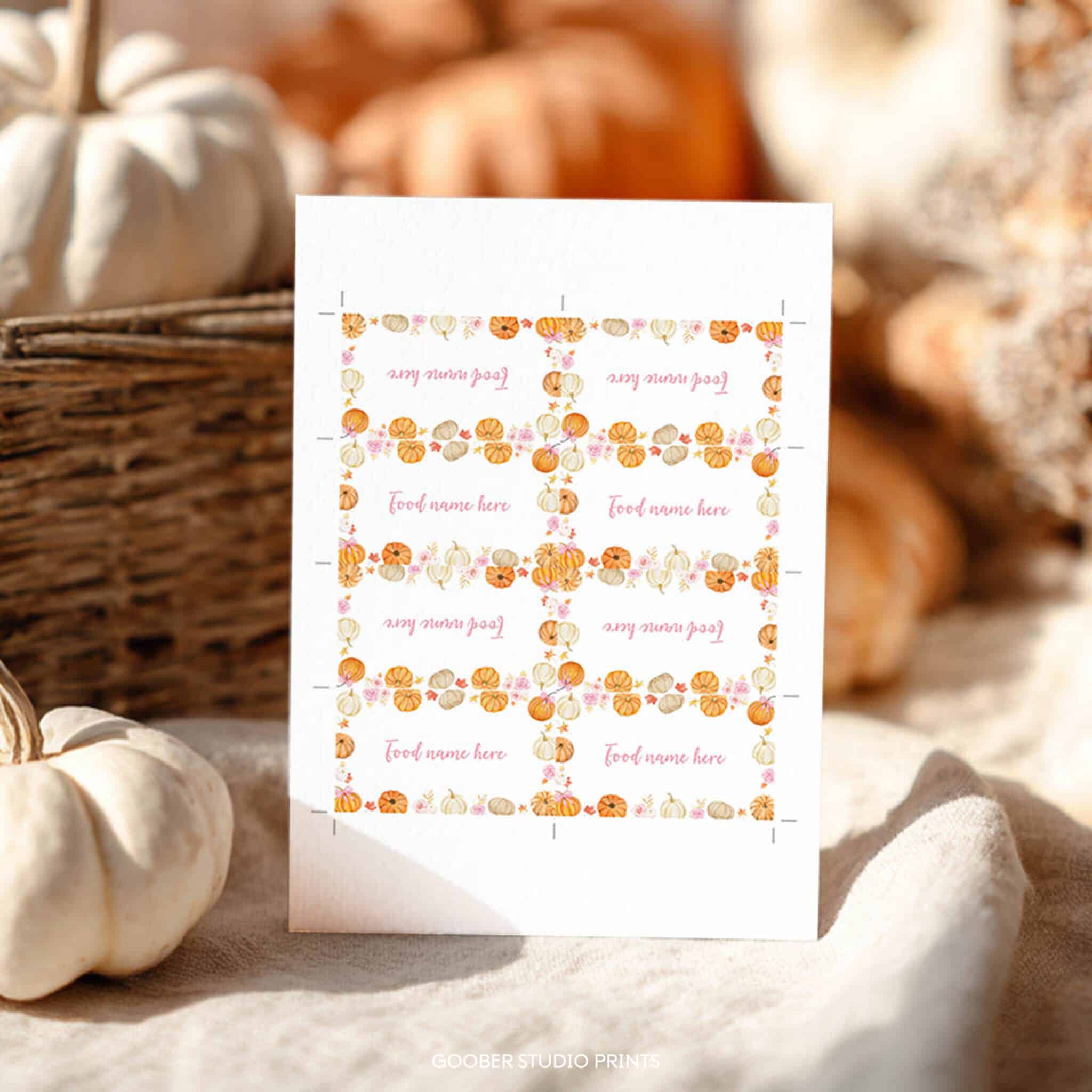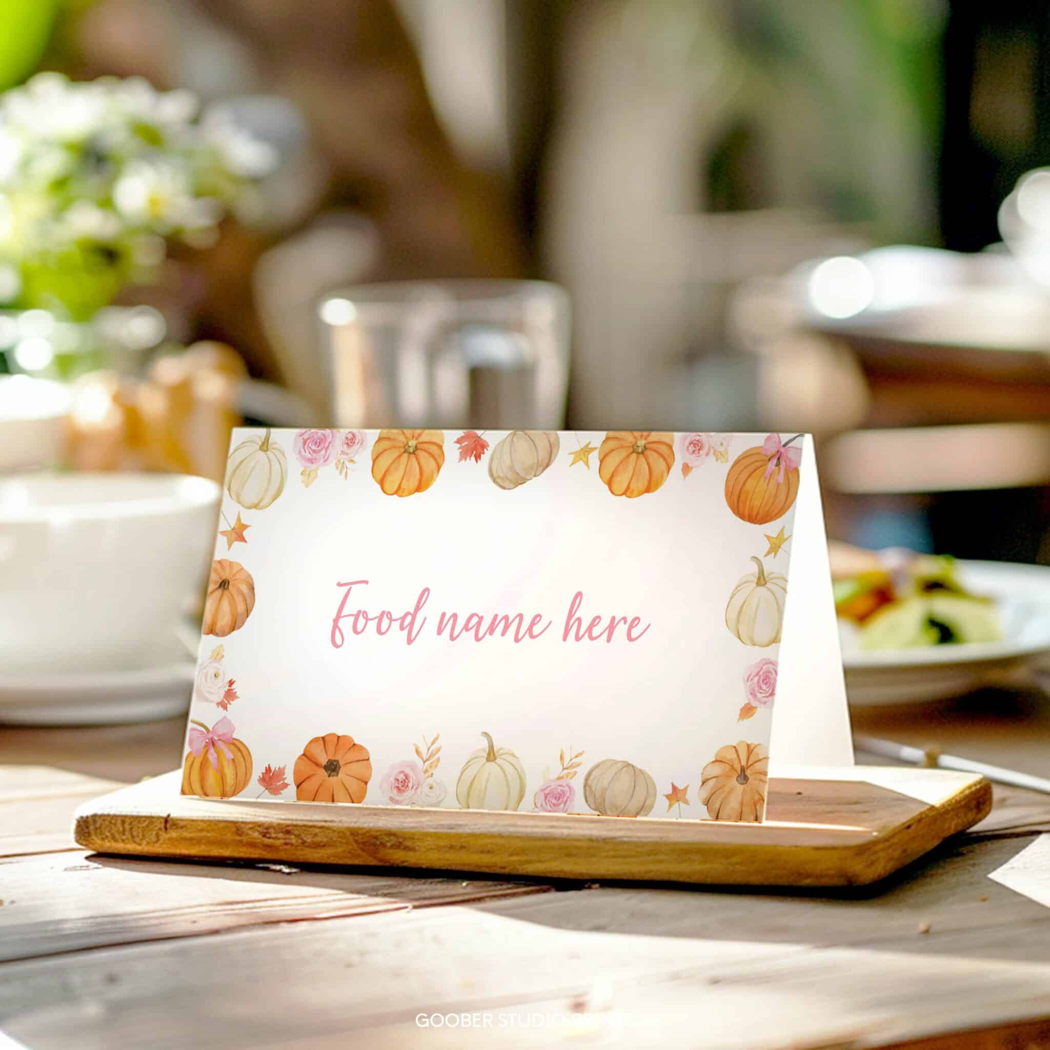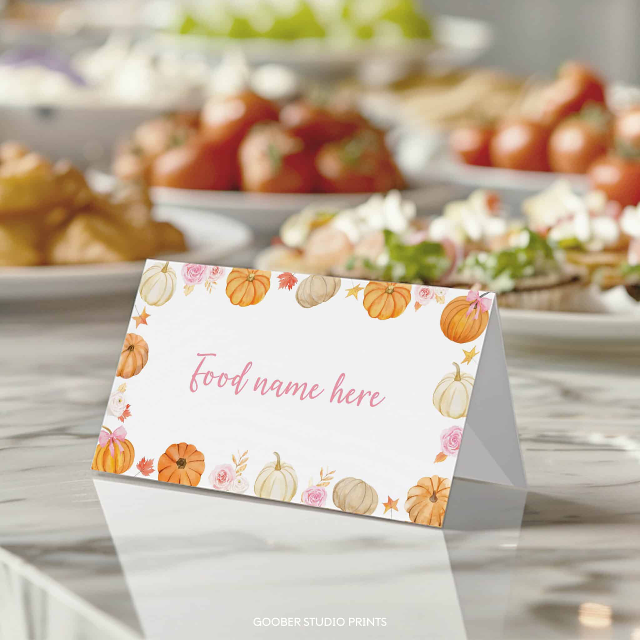 Label your party menu in style with our little pumpkin food tent cards! Featuring sweet pumpkins, autumn fall florals, and a darling pink bow accent in a soft watercolor design, these cards are perfect for a girl birthday celebration. Each card offers space to write dish names, adding a charming and organized touch to your buffet or dessert table. Easily customizable and printable at home on standard cardstock, they’re the perfect detail to complement your floral and pumpkin-themed party decorations.