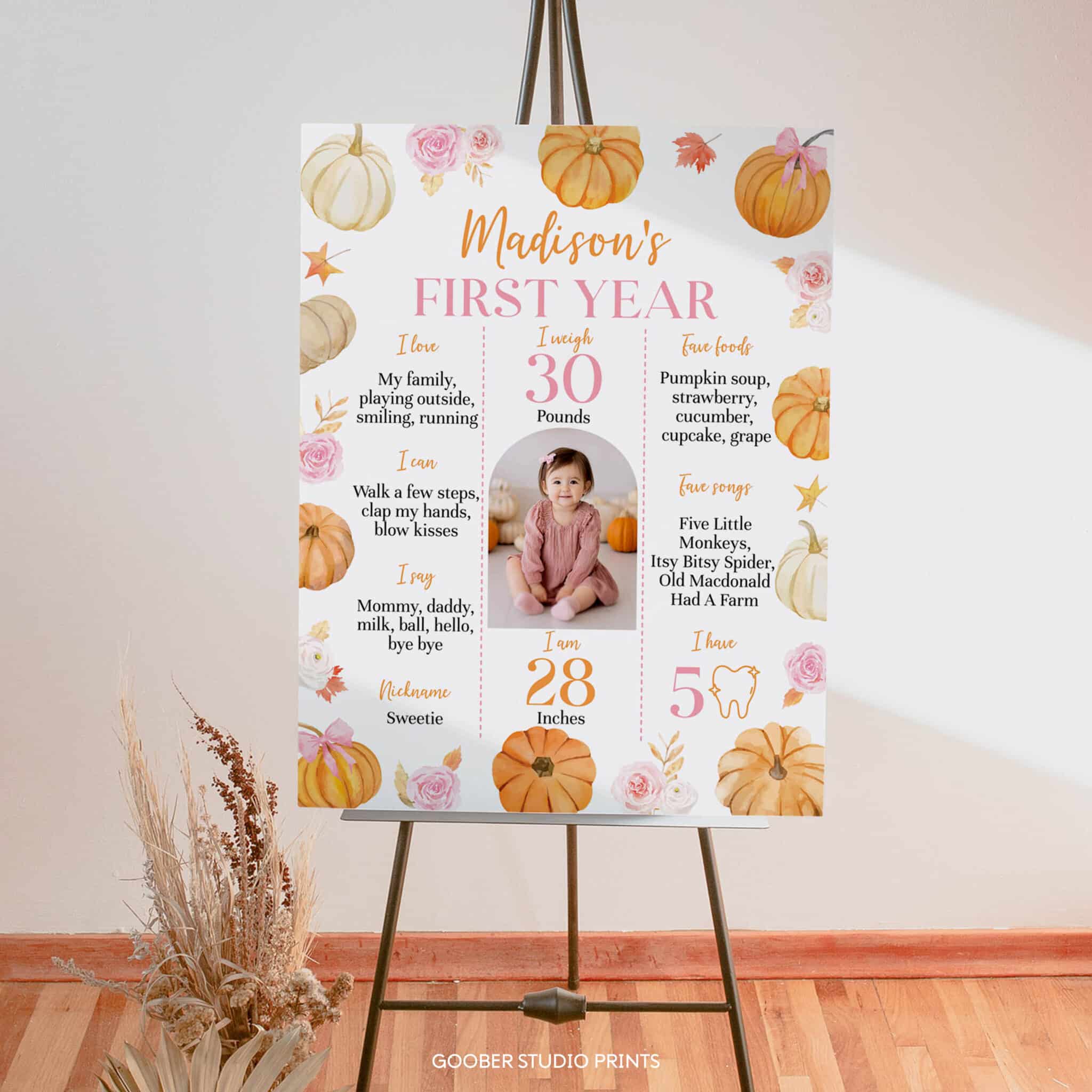 Celebrate your little pumpkin’s first year with our adorable pumpkin-themed milestone photo poster! Featuring sweet pumpkins, autumn fall florals, and a darling pink bow accent in a soft watercolor design, this charming poster is perfect for a girl birthday celebration. Customize it with your baby girl’s name, milestones, favorite moments, and treasured memories to create a unique keepsake. A beautiful way to commemorate her first year, this floral and pumpkin-inspired photo poster adds a cozy autumn touch to your celebration.