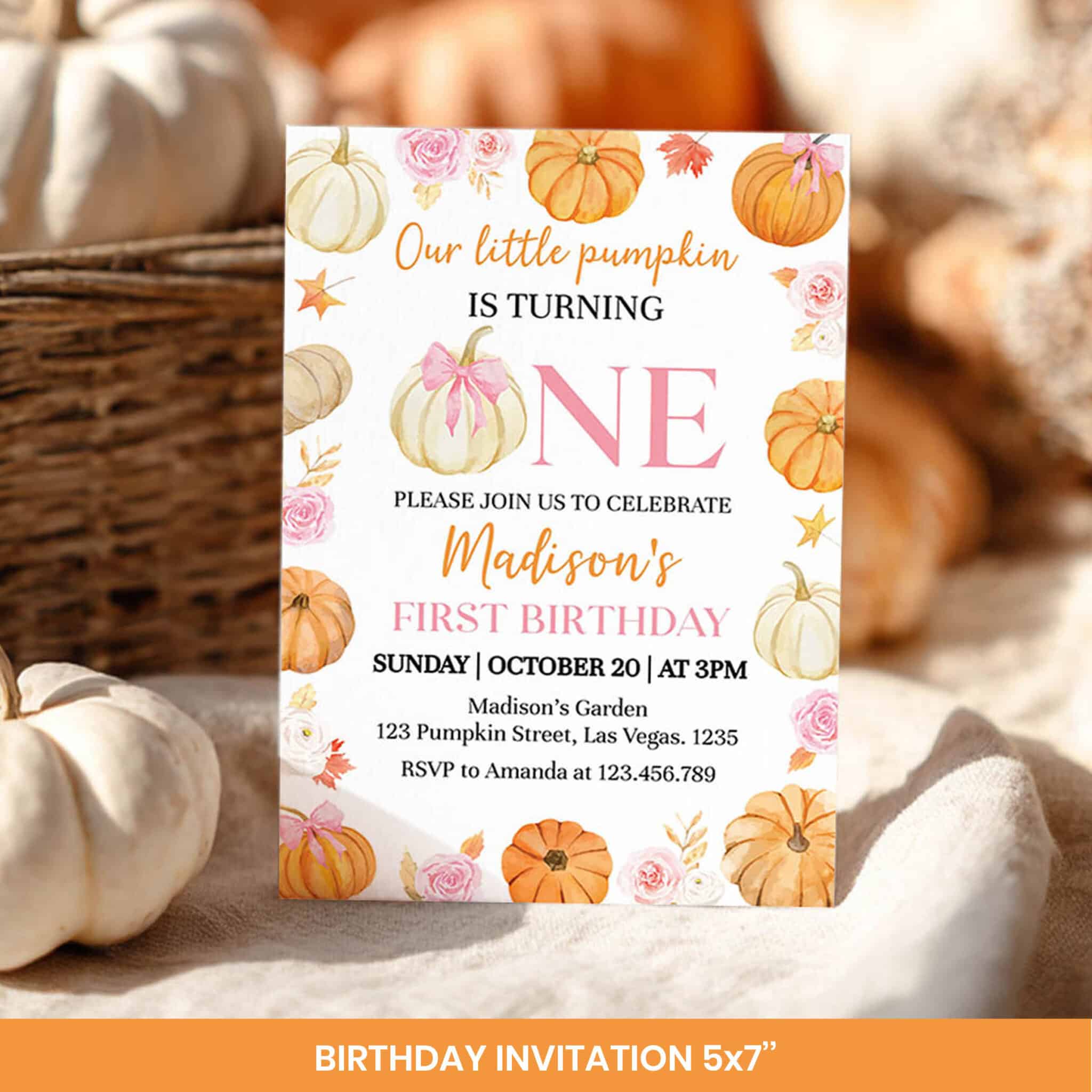 Celebrate in style with our little pumpkin birthday bundle! Perfect for your baby girl’s special day, this all-in-one package features sweet pumpkins, autumn fall florals, and a darling pink bow accent in a soft watercolor design to match your pumpkin-themed party supplies. The bundle includes invitations, banners, cupcake toppers, favor tags, and more—all customizable with your little pumpkin’s name, date, and party details. A beautiful floral and pumpkin set to make your girl birthday celebration unforgettable!