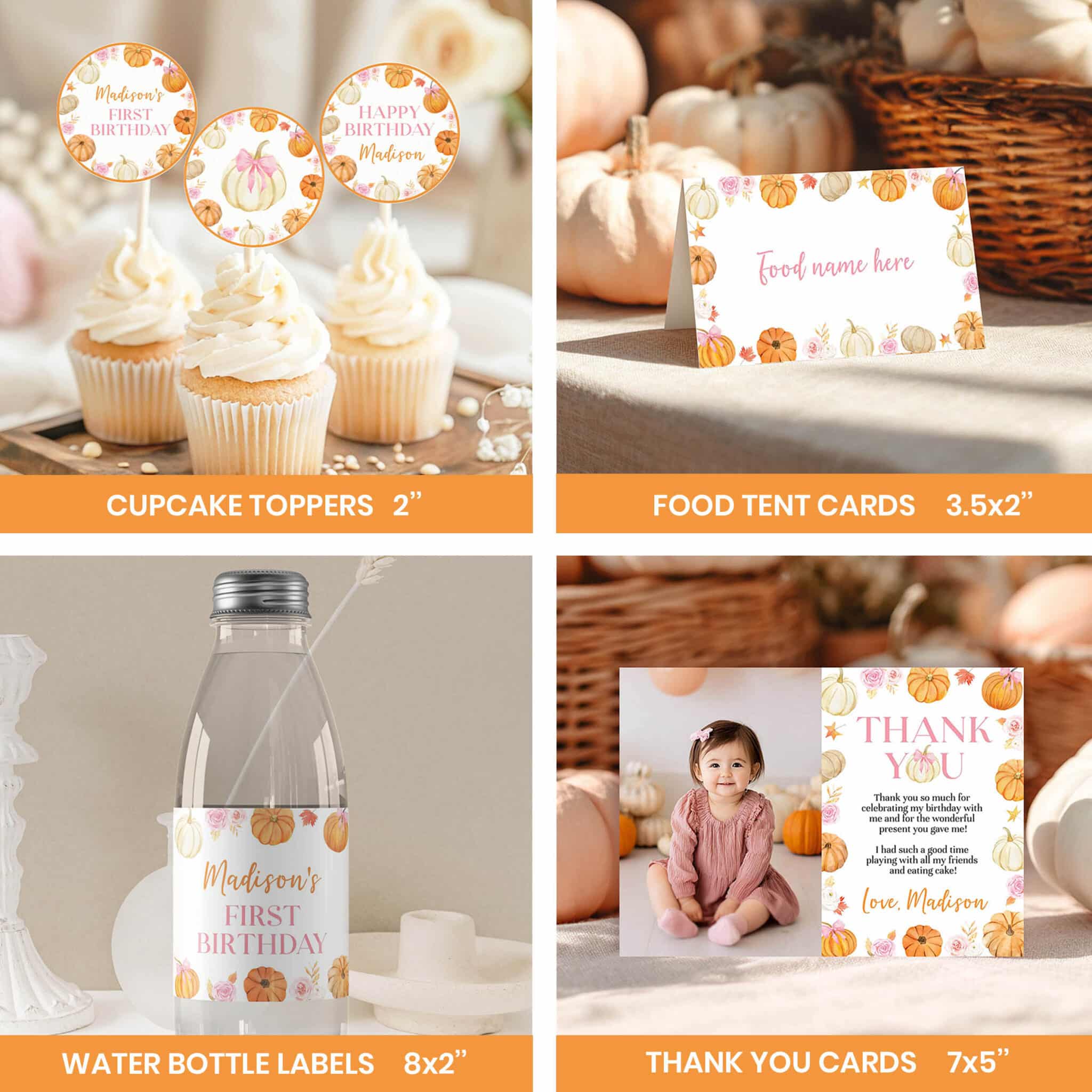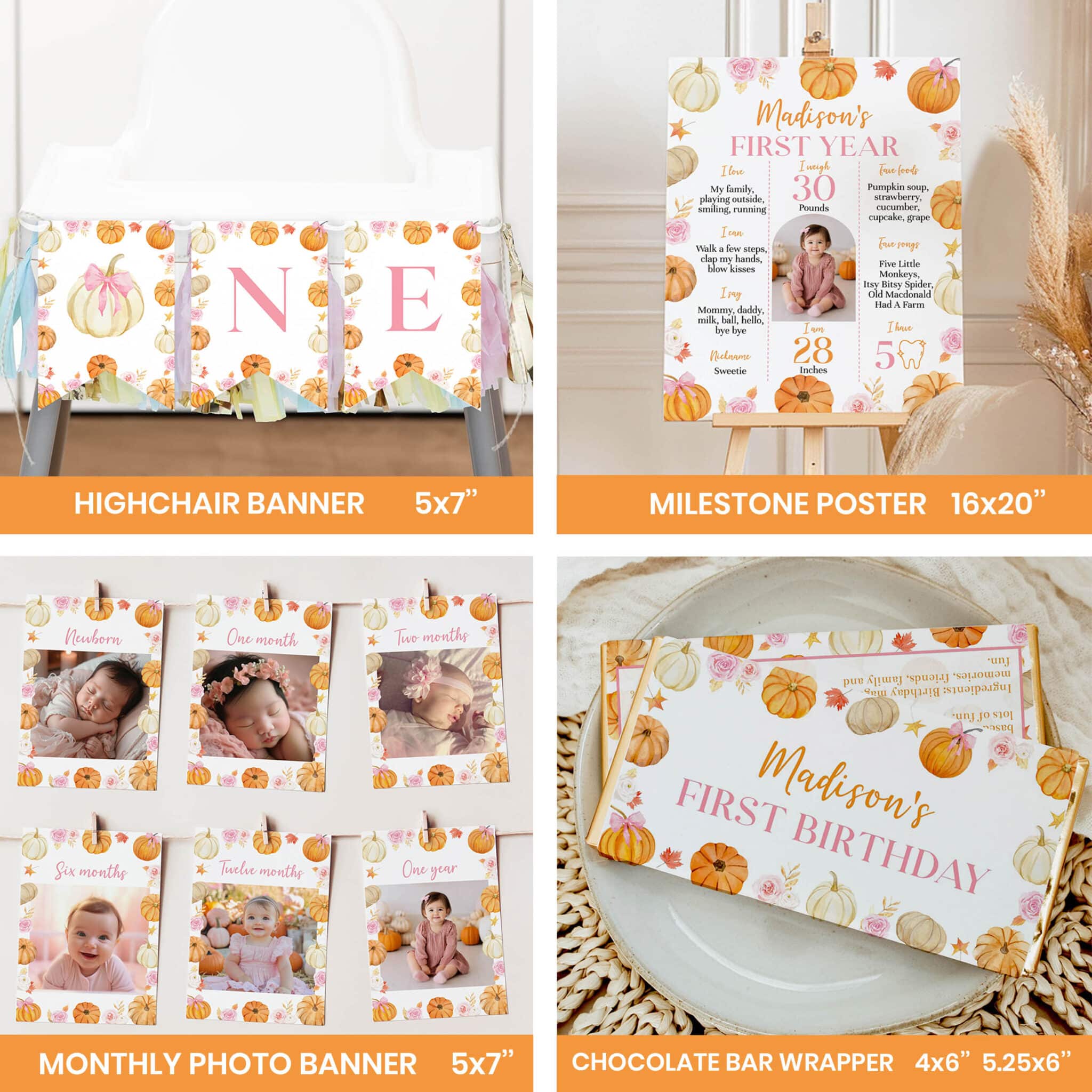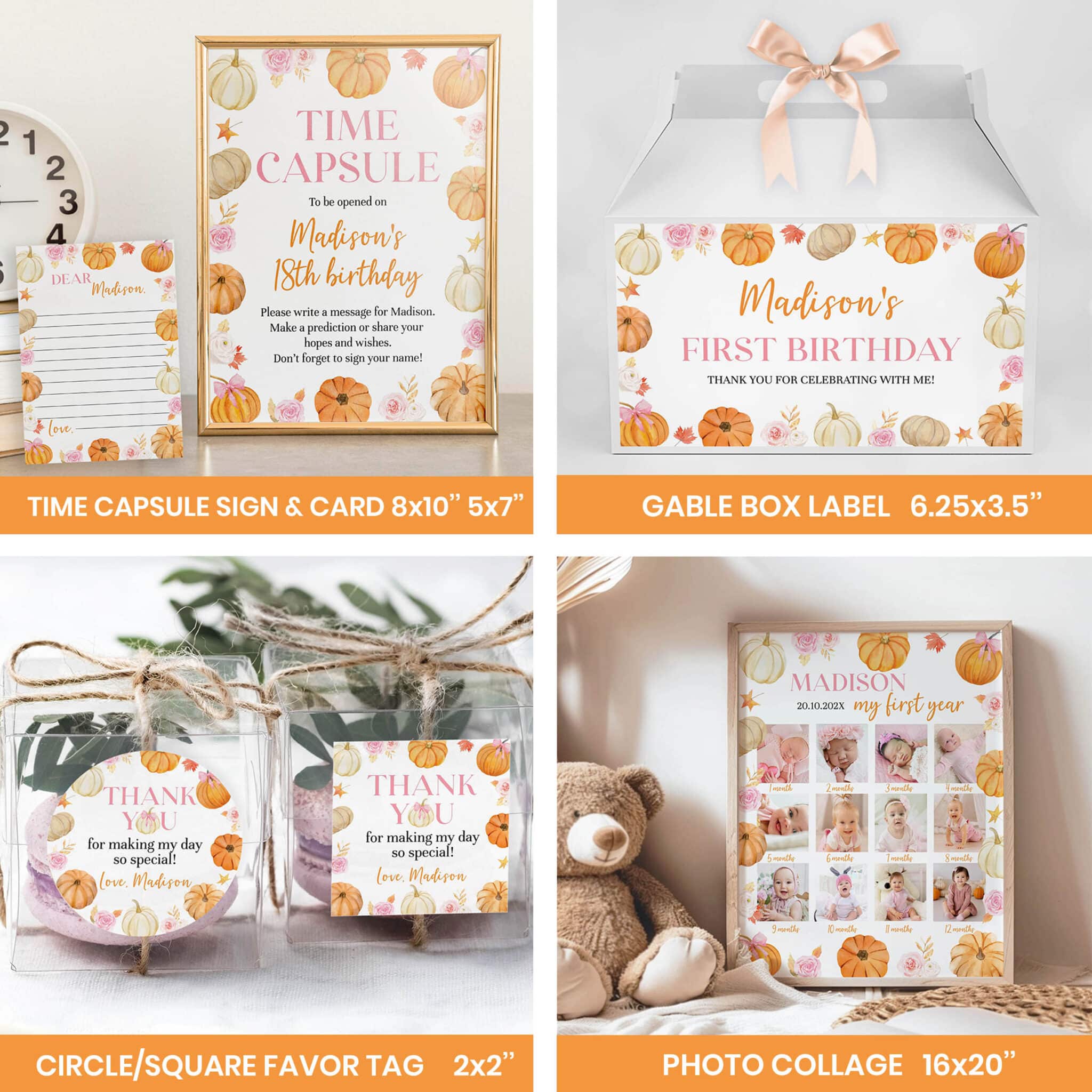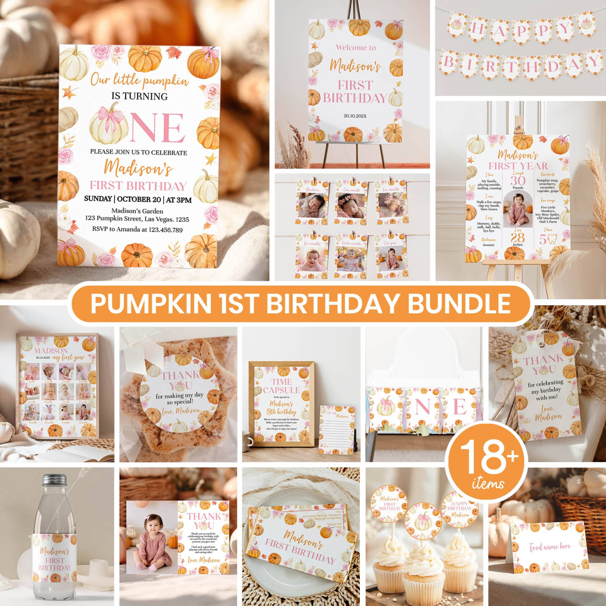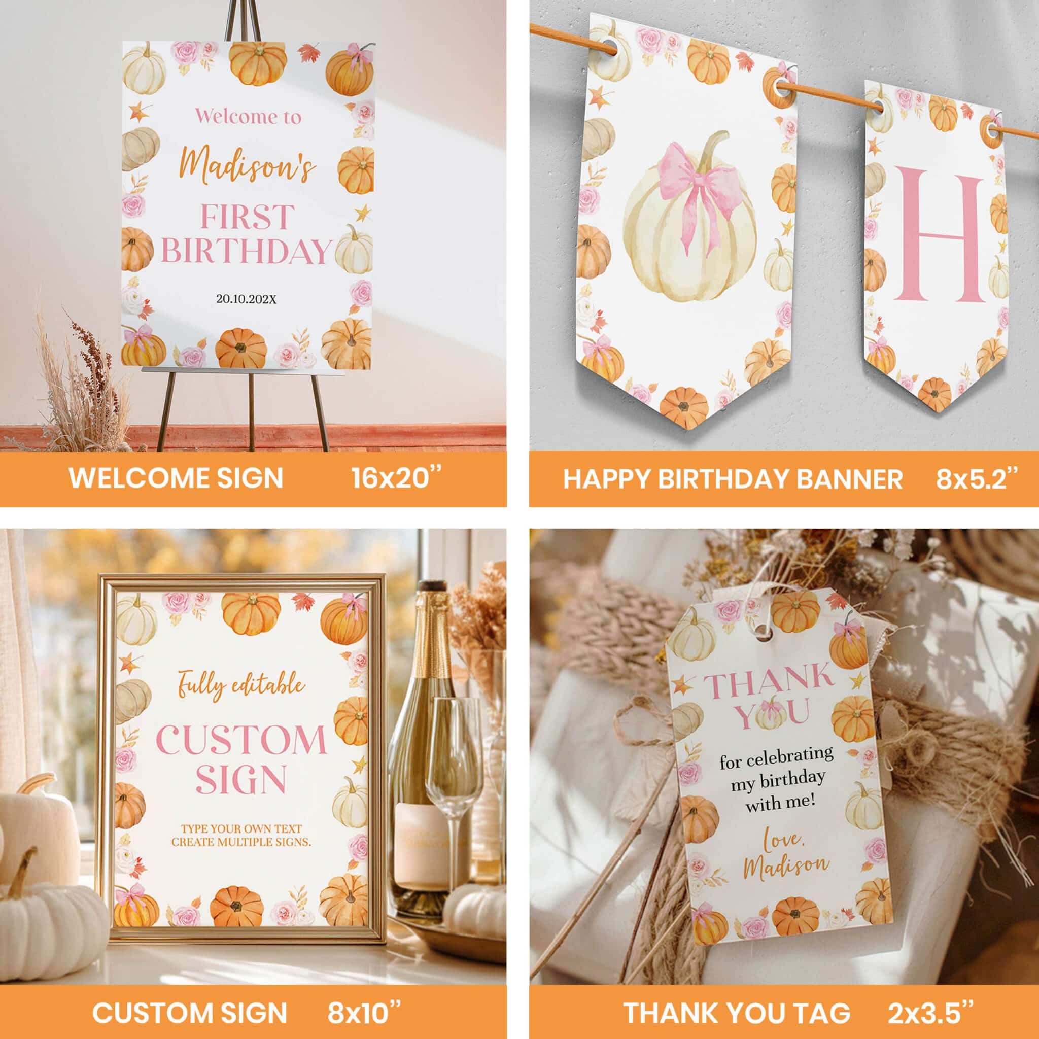 An access link to your editable pumpkin first birthday bundle set will be sent to your e-mail address. The link allows you to edit, save and download your designs as JPG or PDF files. All the included designs and their sizes are: