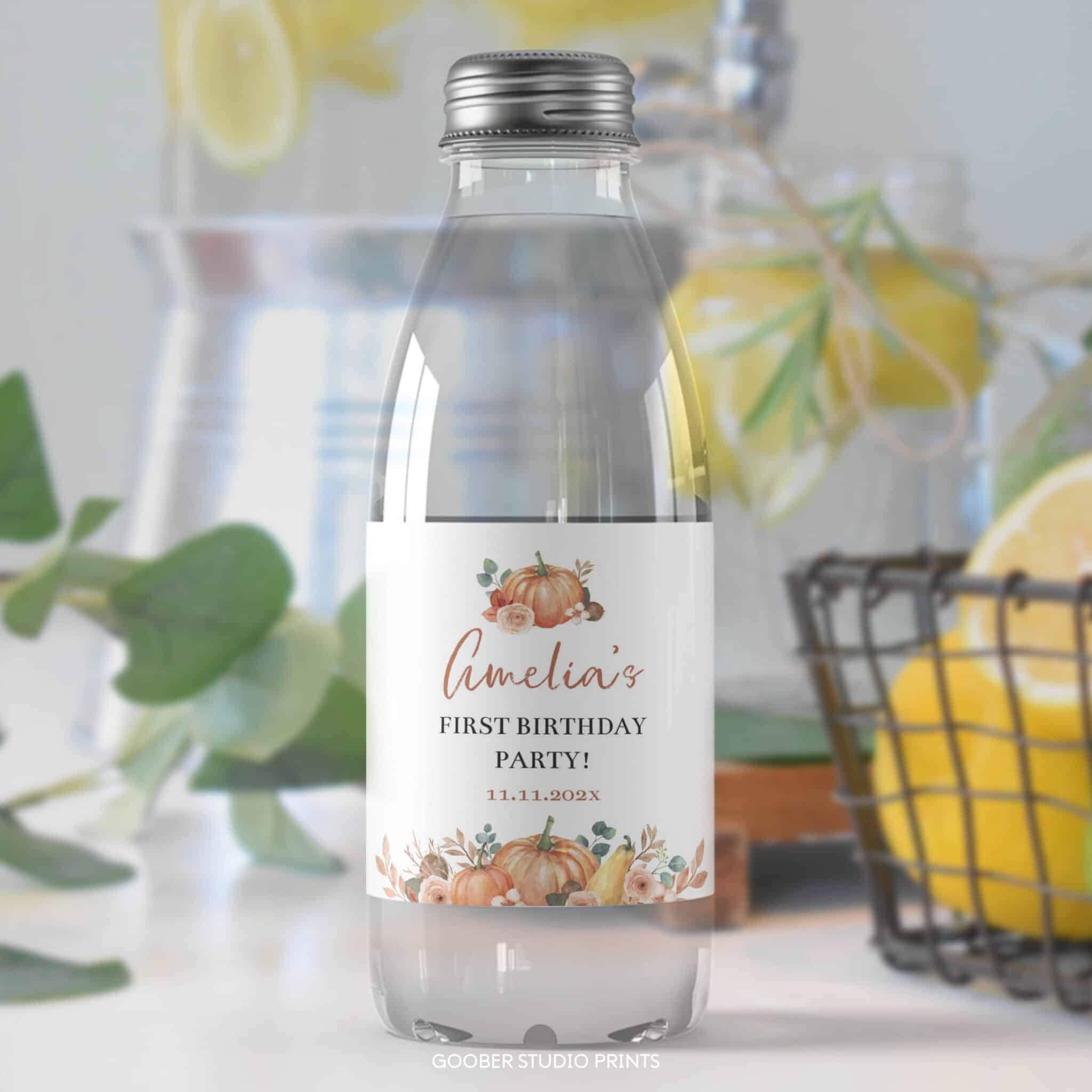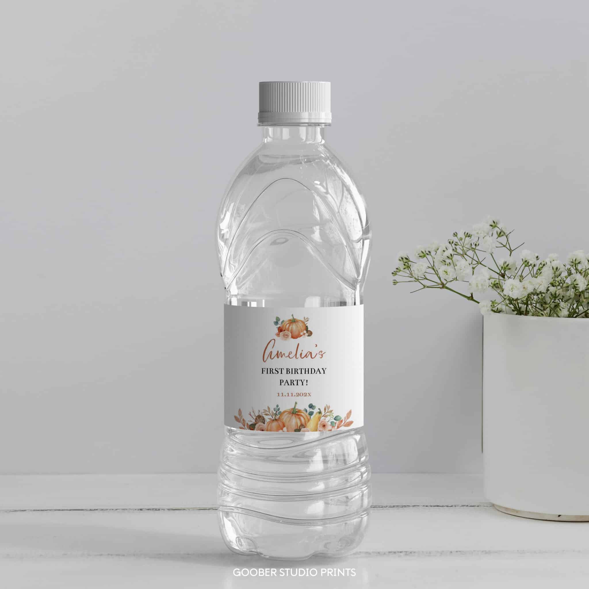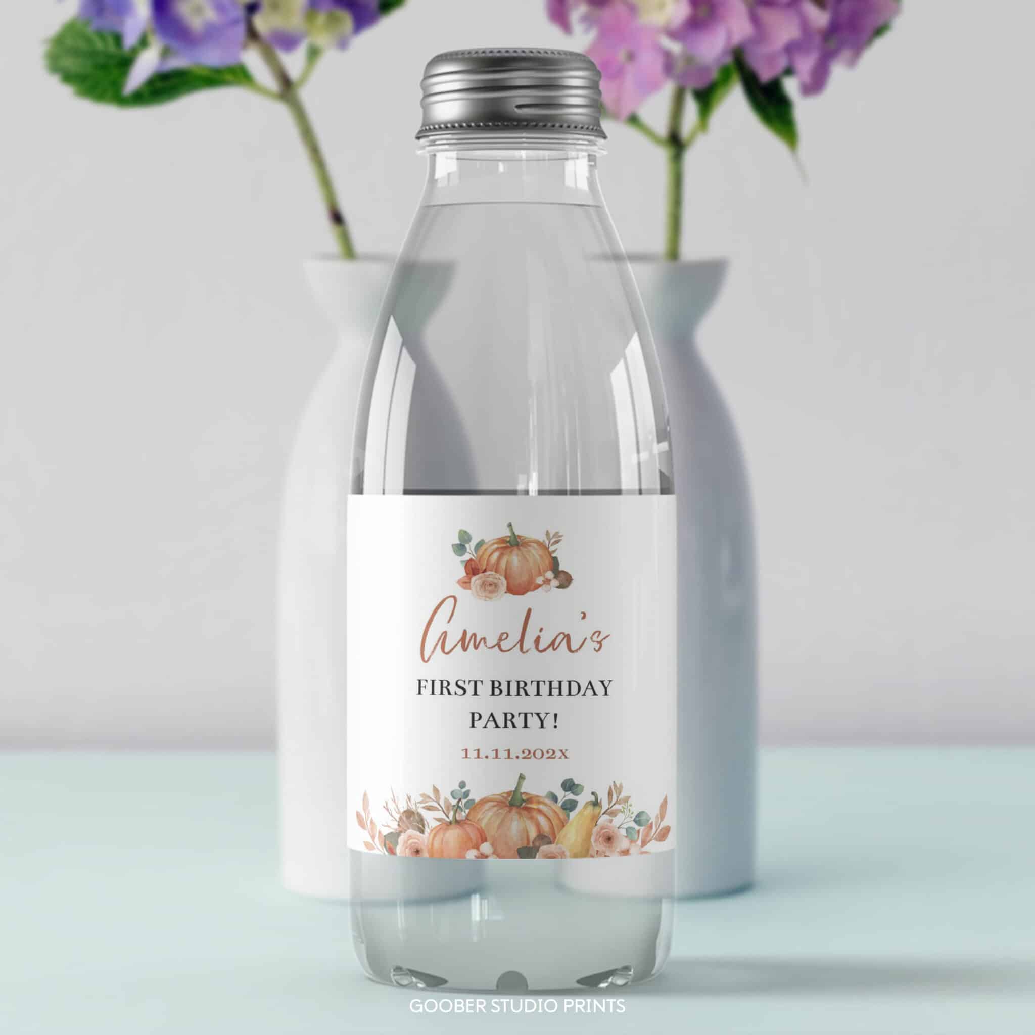 Dress up your party drinks with our charming little pumpkin water bottle labels! Adorned with sweet pumpkins and autumn fall florals in a soft watercolor design, these labels can be personalized with your baby girl’s name and age. Sized to fit standard 8.5”x2” bottles, they’re easy to print at home and add the perfect floral and pumpkin-inspired touch to your girl birthday celebration décor.