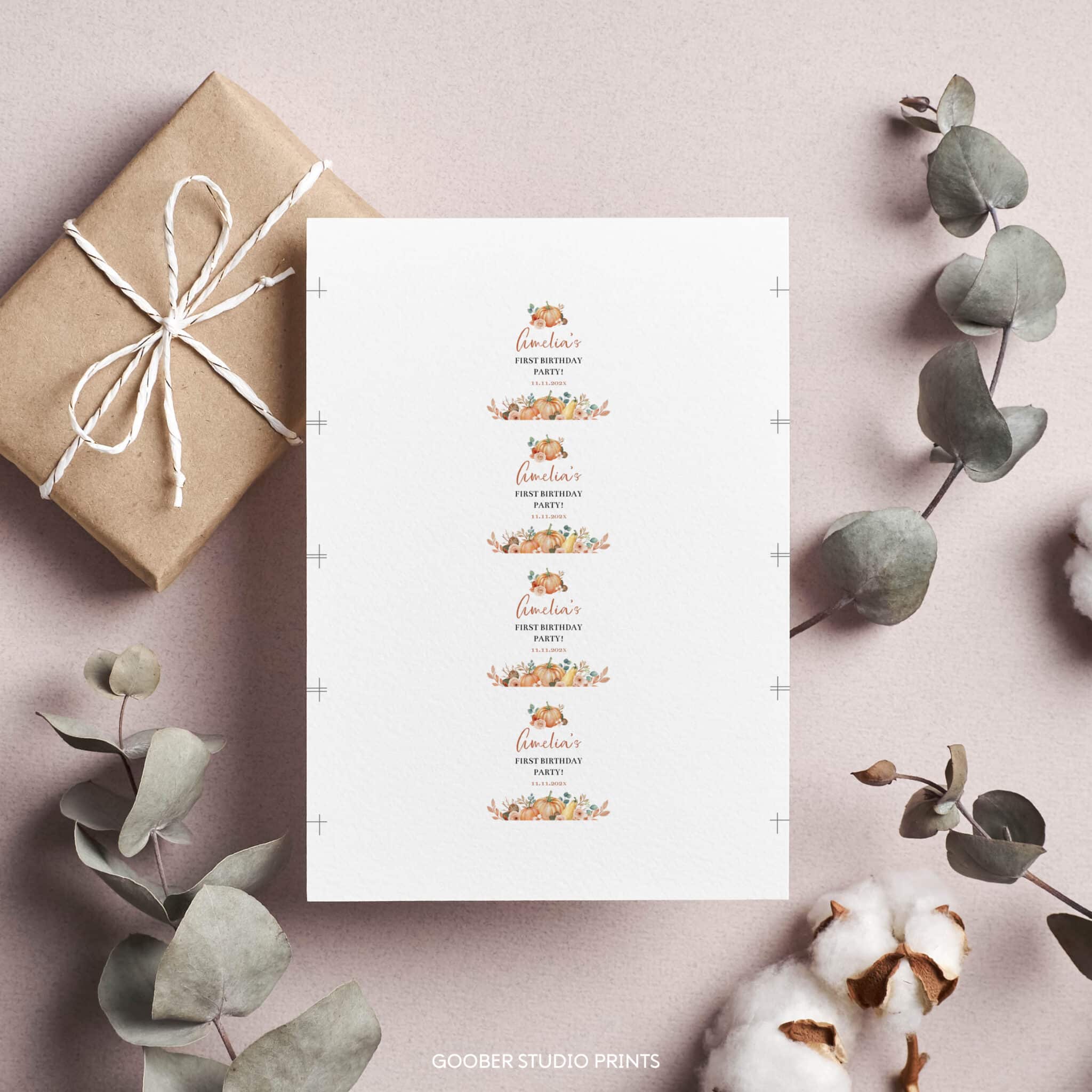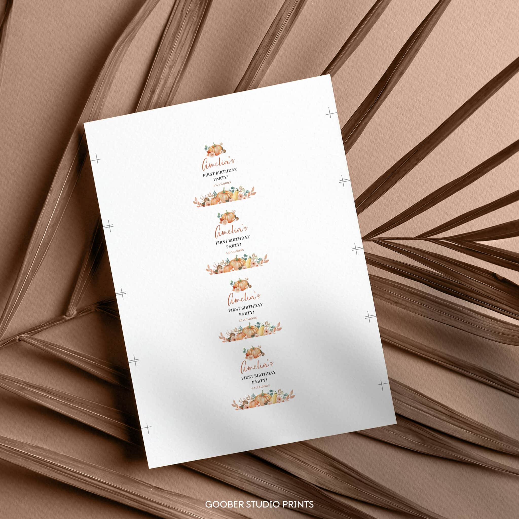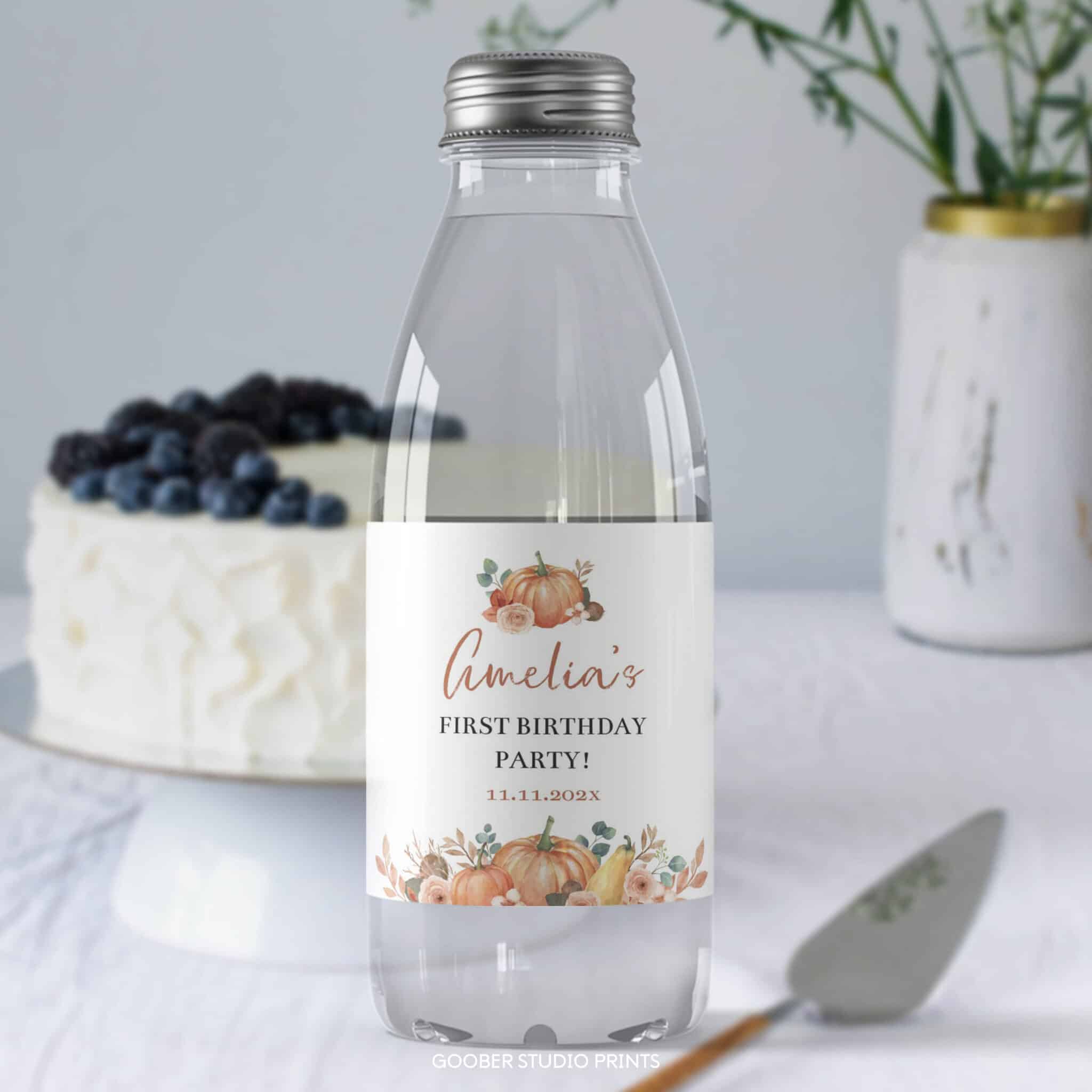 Dress up your party drinks with our charming little pumpkin water bottle labels! Adorned with sweet pumpkins and autumn fall florals in a soft watercolor design, these labels can be personalized with your baby girl’s name and age. Sized to fit standard 8.5”x2” bottles, they’re easy to print at home and add the perfect floral and pumpkin-inspired touch to your girl birthday celebration décor.