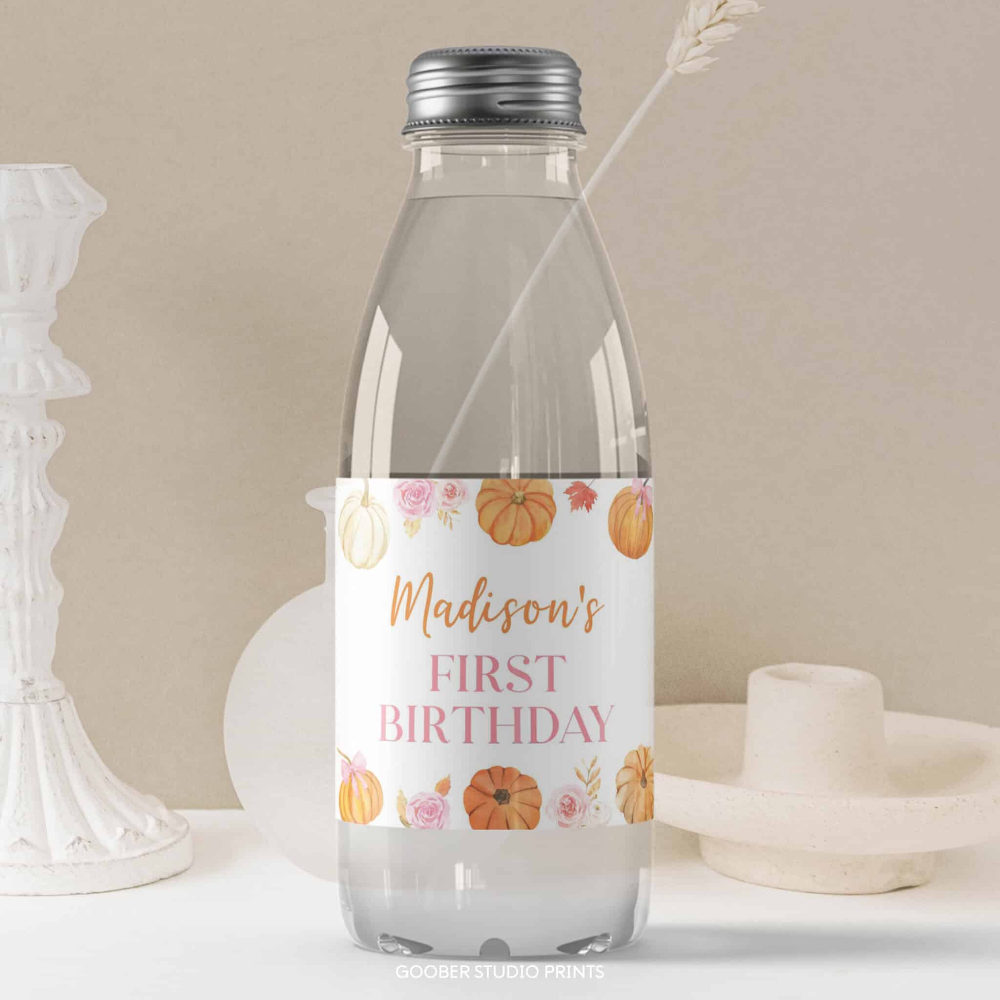Add a festive touch to your party drinks with our little pumpkin-themed water bottle labels! Featuring sweet pumpkins, autumn fall florals, and a darling pink bow accent in a soft watercolor design, these labels can be personalized with your baby girl’s name and age. Sized to fit standard 8.5”x2” bottles, they’re easy to print at home and the perfect detail to complete your floral and pumpkin girl birthday celebration décor.