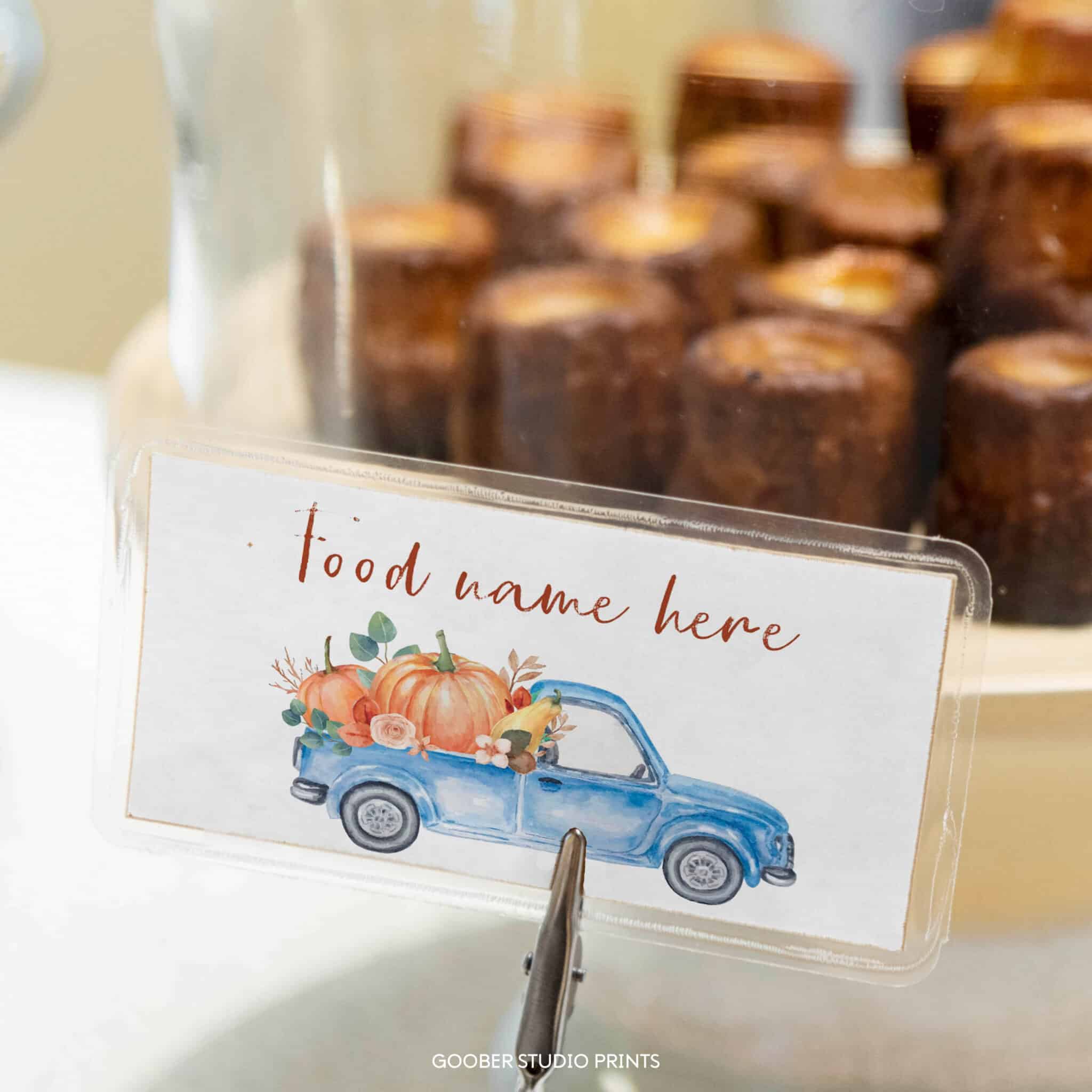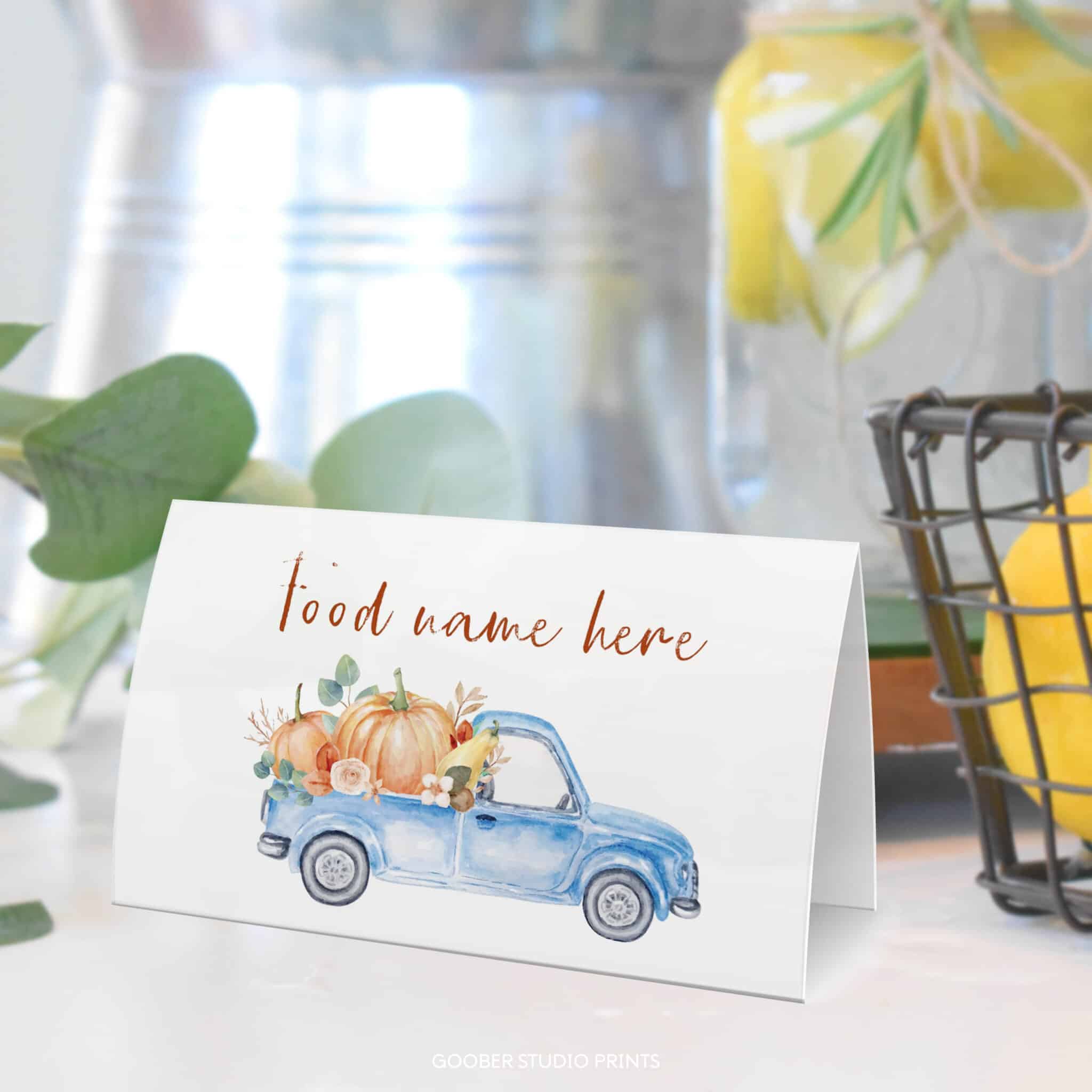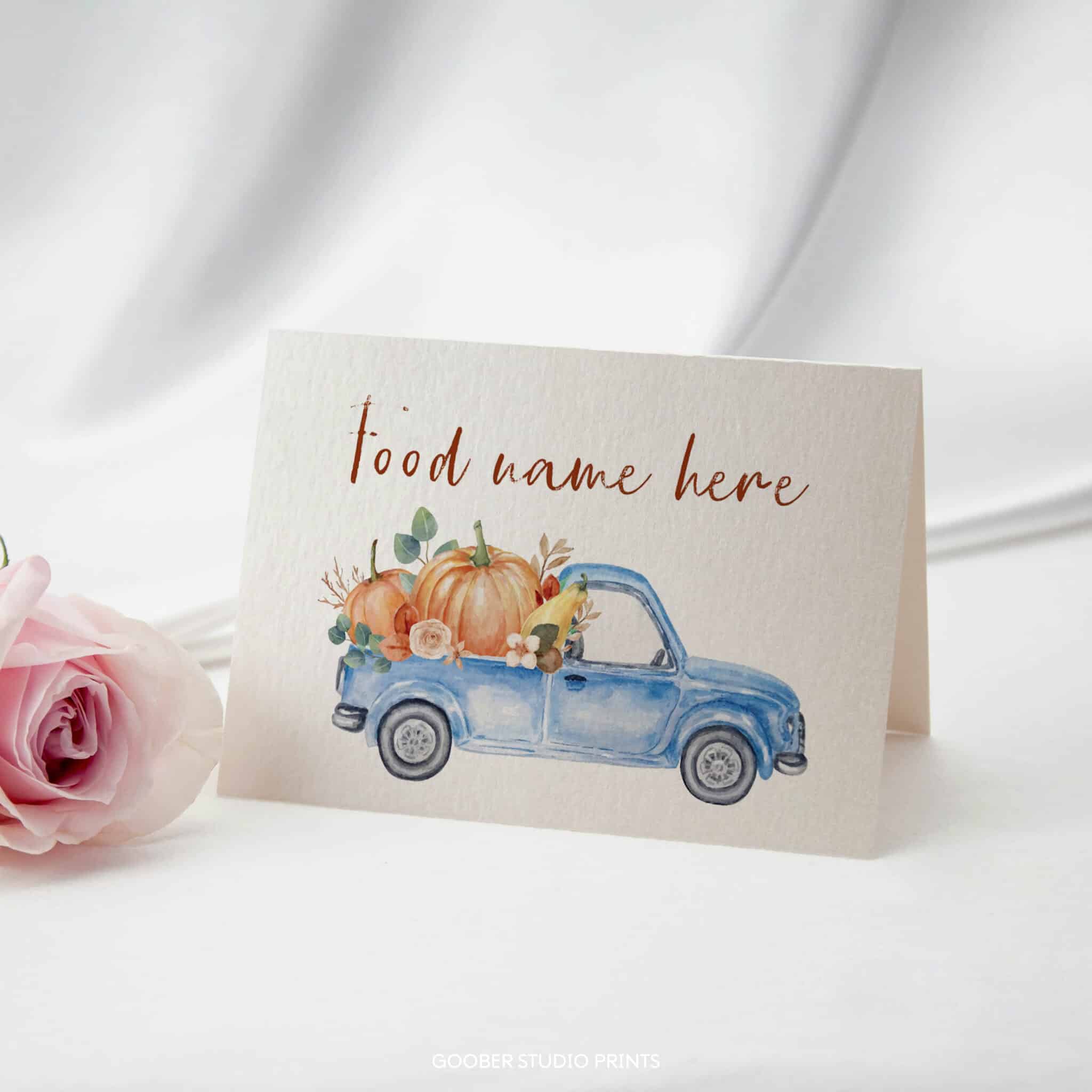 Add festive charm to your autumn fall celebration with our pumpkin truck food tent cards! Featuring a playful pumpkin truck, watercolor pumpkins, and soft floral accents, these cards are perfect for a boy birthday party. Each card includes space to write dish names, making your buffet or dessert table both organized and stylish. Easily customizable and printable at home, they’re the perfect detail to complement your little pumpkin’s pumpkin truck–themed celebration.