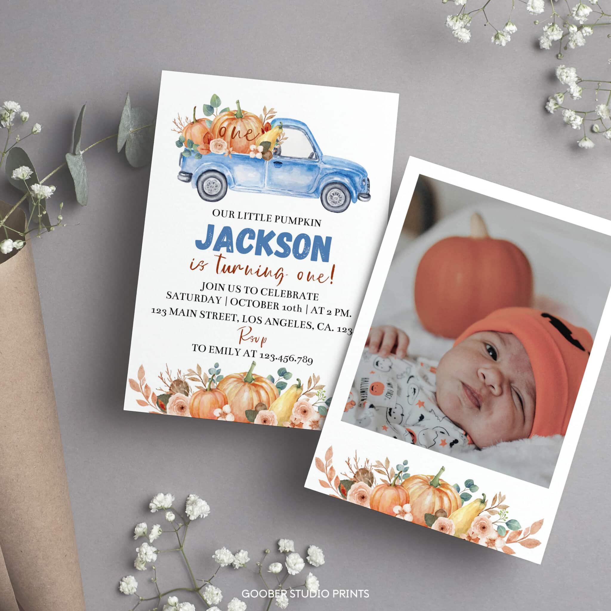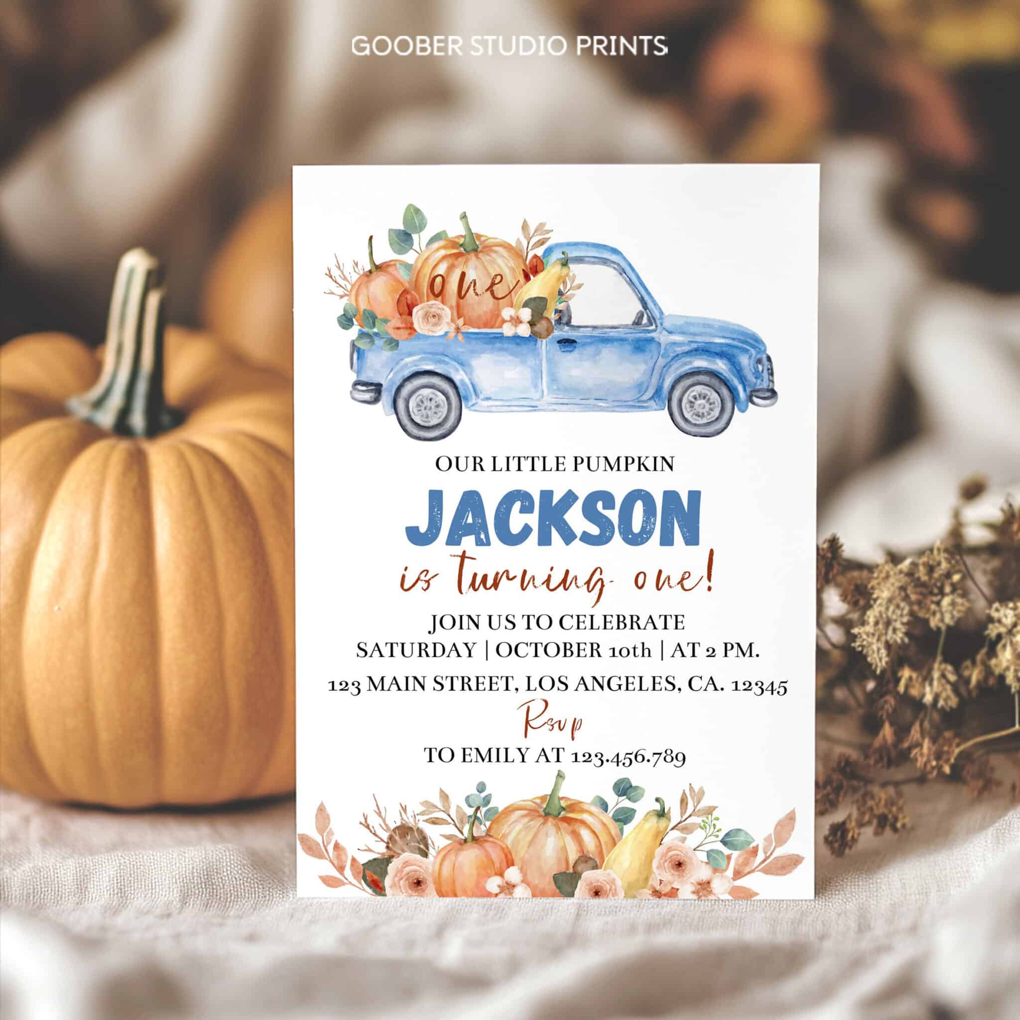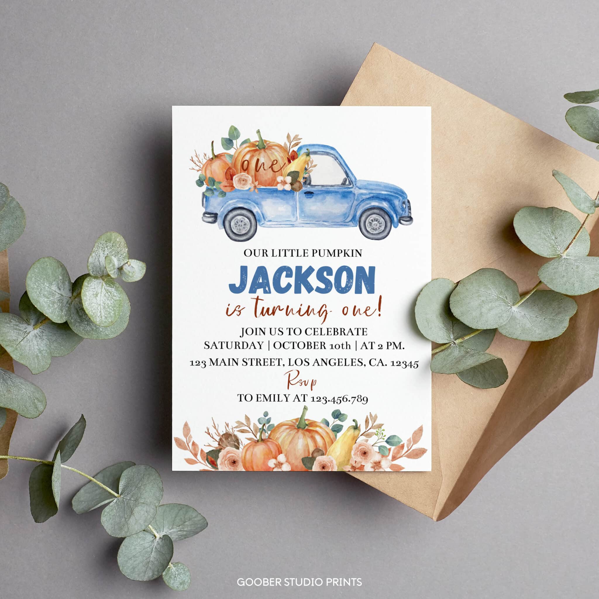 Start the celebration with our pumpkin truck birthday invitation! Designed with a charming pumpkin truck, autumn fall accents, and subtle floral details, this watercolor-style invite is perfect for a boy birthday party. Personalize with your little pumpkin’s name, age, date, time, and location to create a unique keepsake for his big day. Easy to print at home, this floral and pumpkin truck-themed invitation sets the perfect tone for a festive and unforgettable gathering!