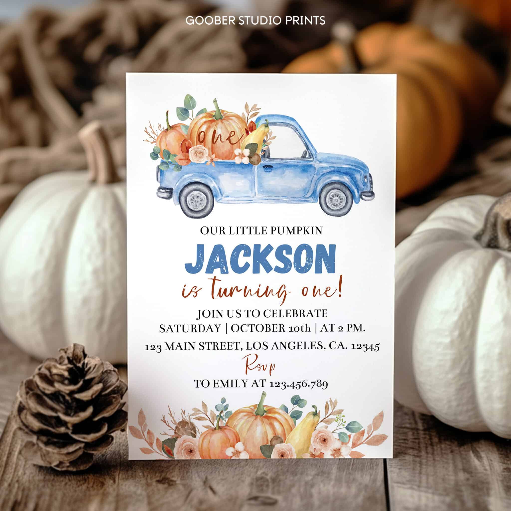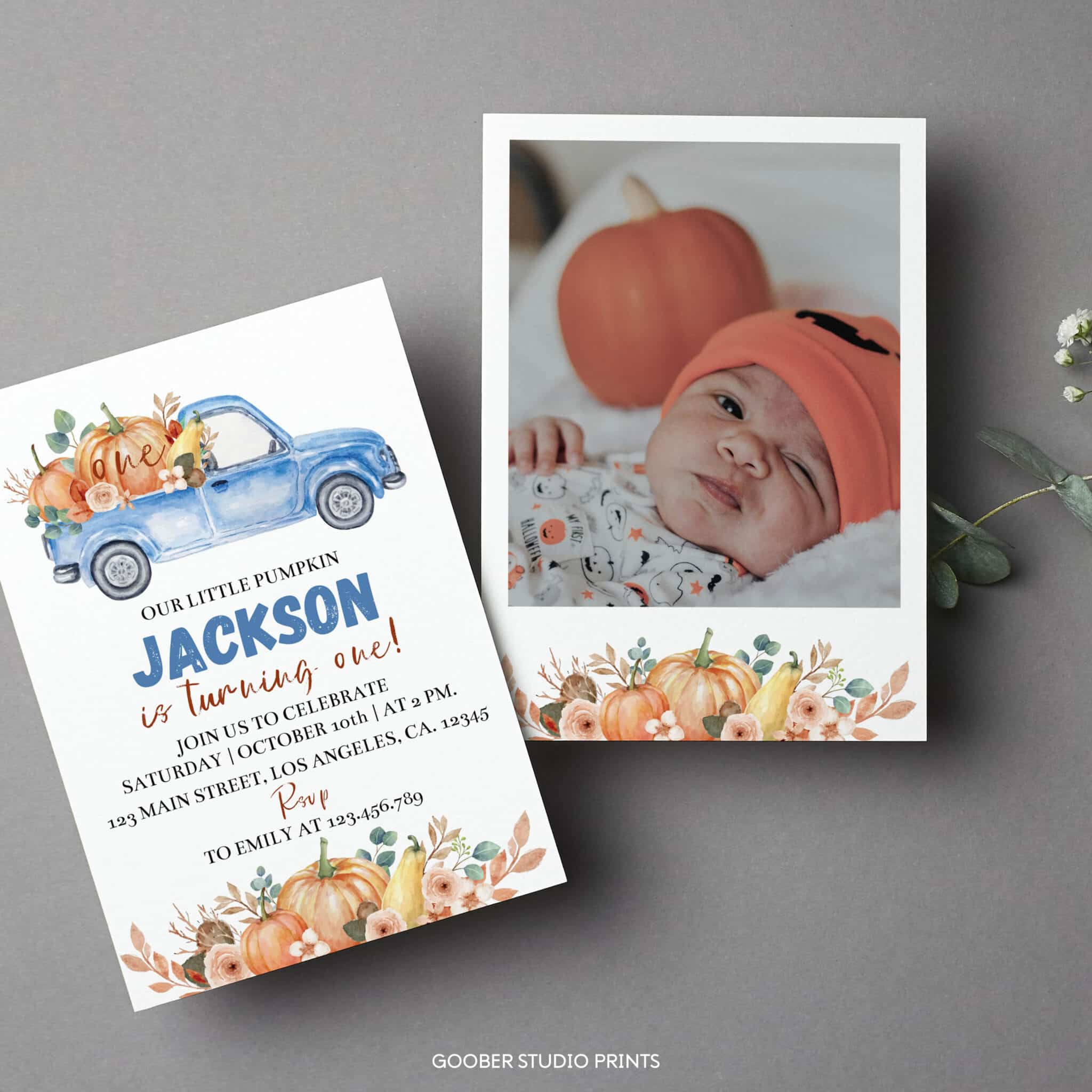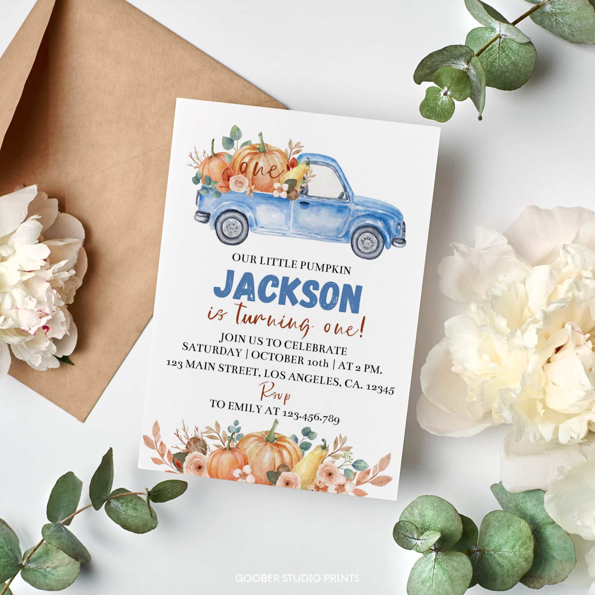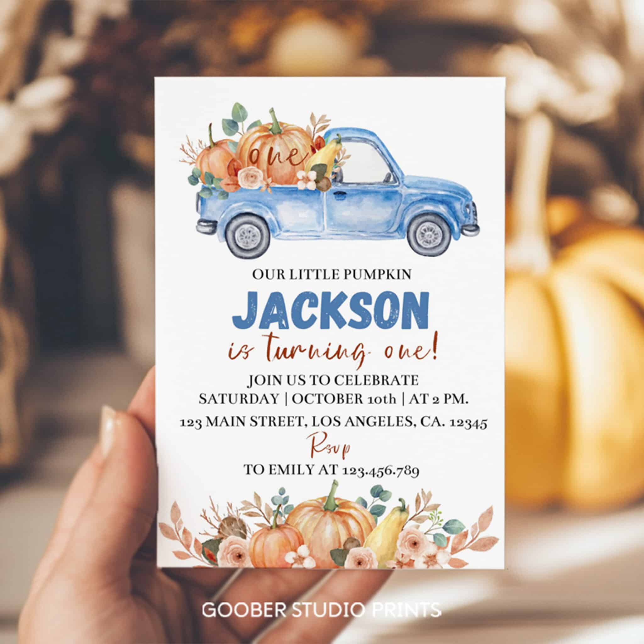 Start the celebration with our pumpkin truck birthday invitation! Designed with a charming pumpkin truck, autumn fall accents, and subtle floral details, this watercolor-style invite is perfect for a boy birthday party. Personalize with your little pumpkin’s name, age, date, time, and location to create a unique keepsake for his big day. Easy to print at home, this floral and pumpkin truck-themed invitation sets the perfect tone for a festive and unforgettable gathering!