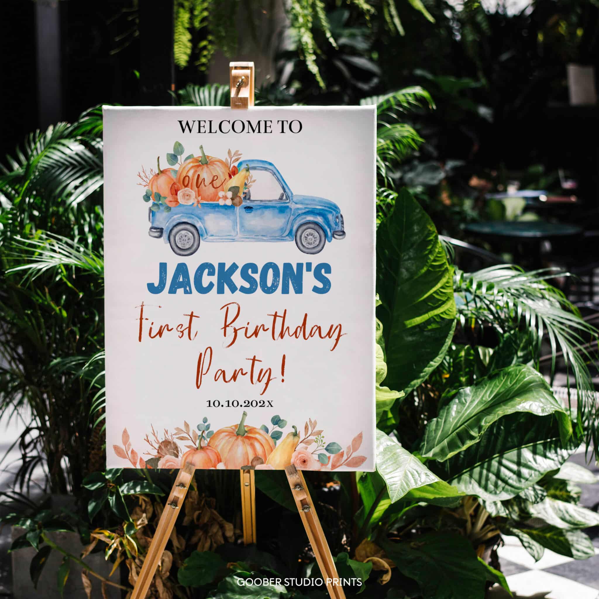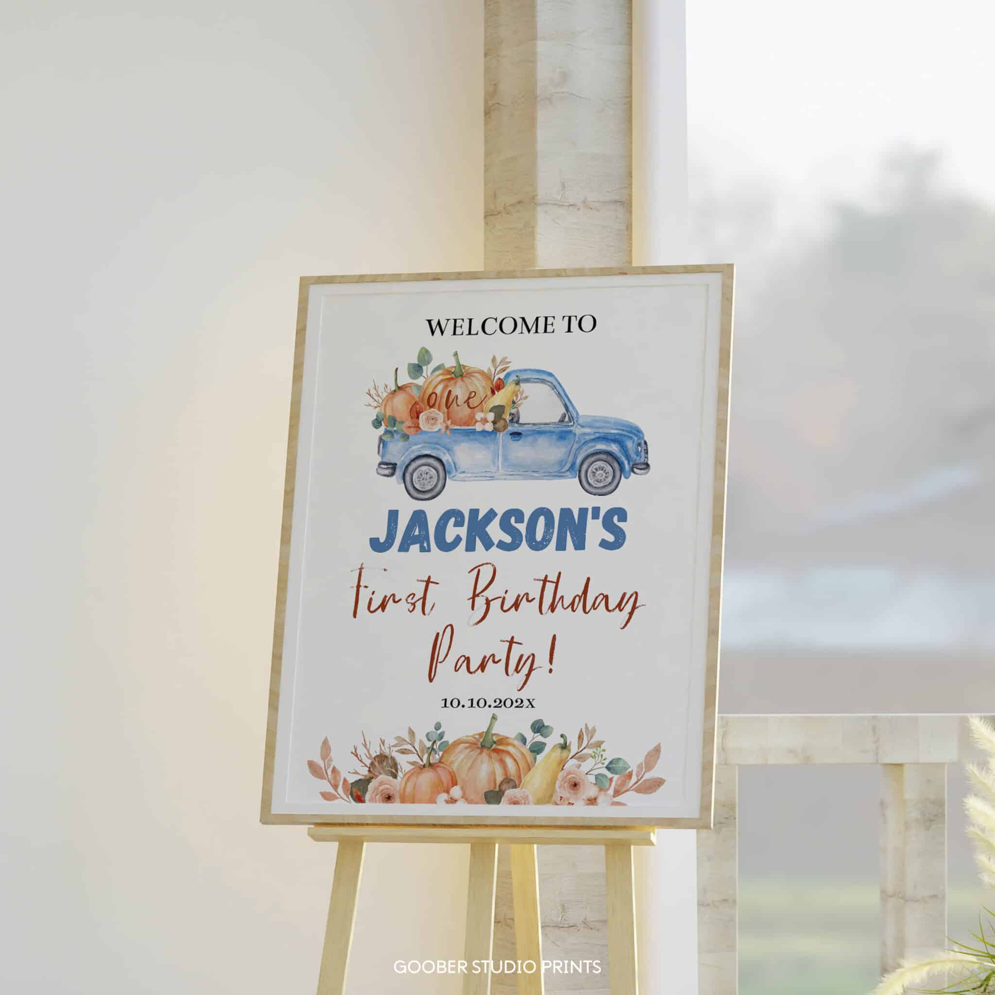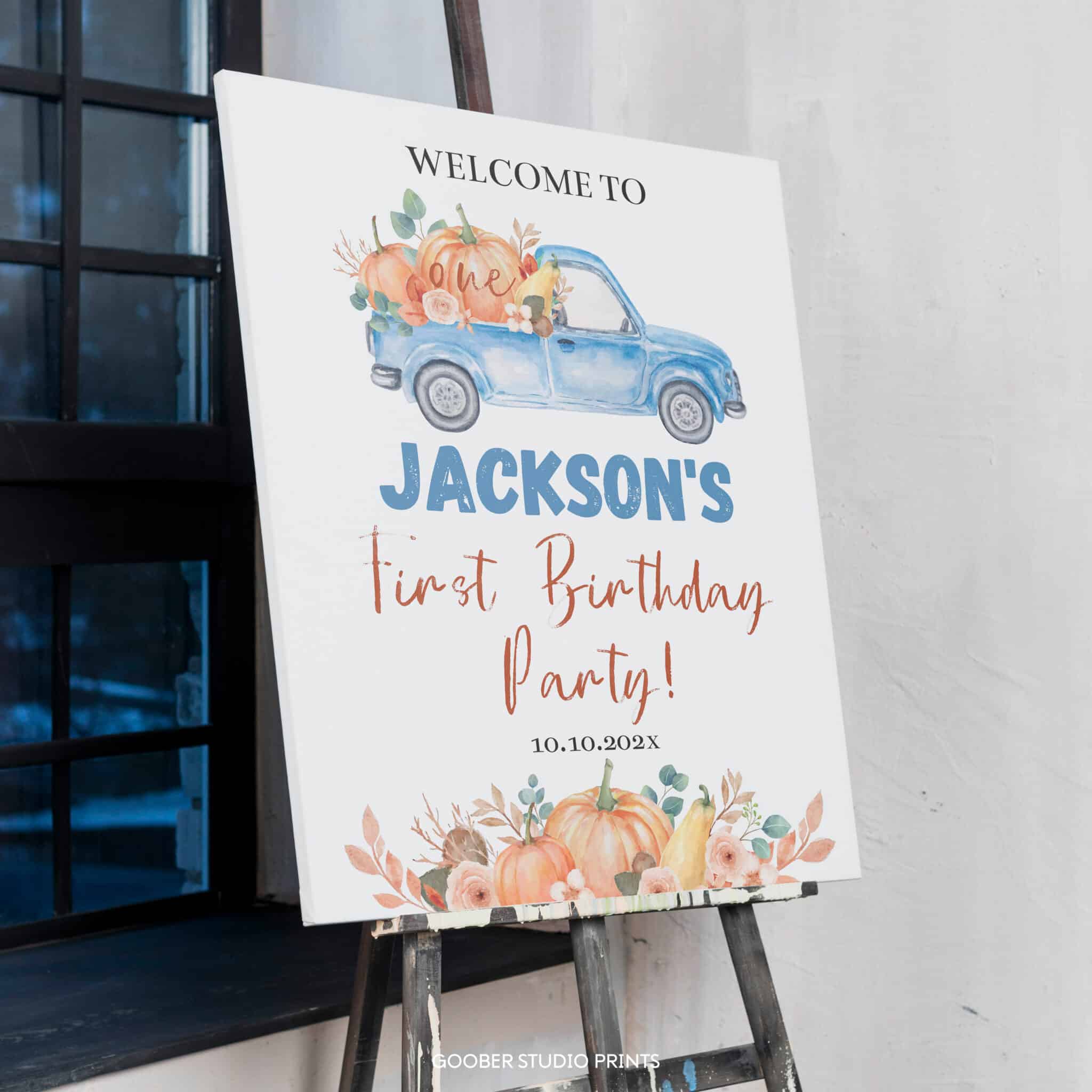 Welcome friends and family to your little pumpkin’s big day with our festive pumpkin truck welcome sign! Featuring rustic watercolor pumpkins, autumn fall florals, and a playful pumpkin truck design, this sign is the perfect accent for a boy birthday celebration. Personalize with your child’s name and age to create a warm entrance or backdrop that ties together your floral and pumpkin-inspired party décor.