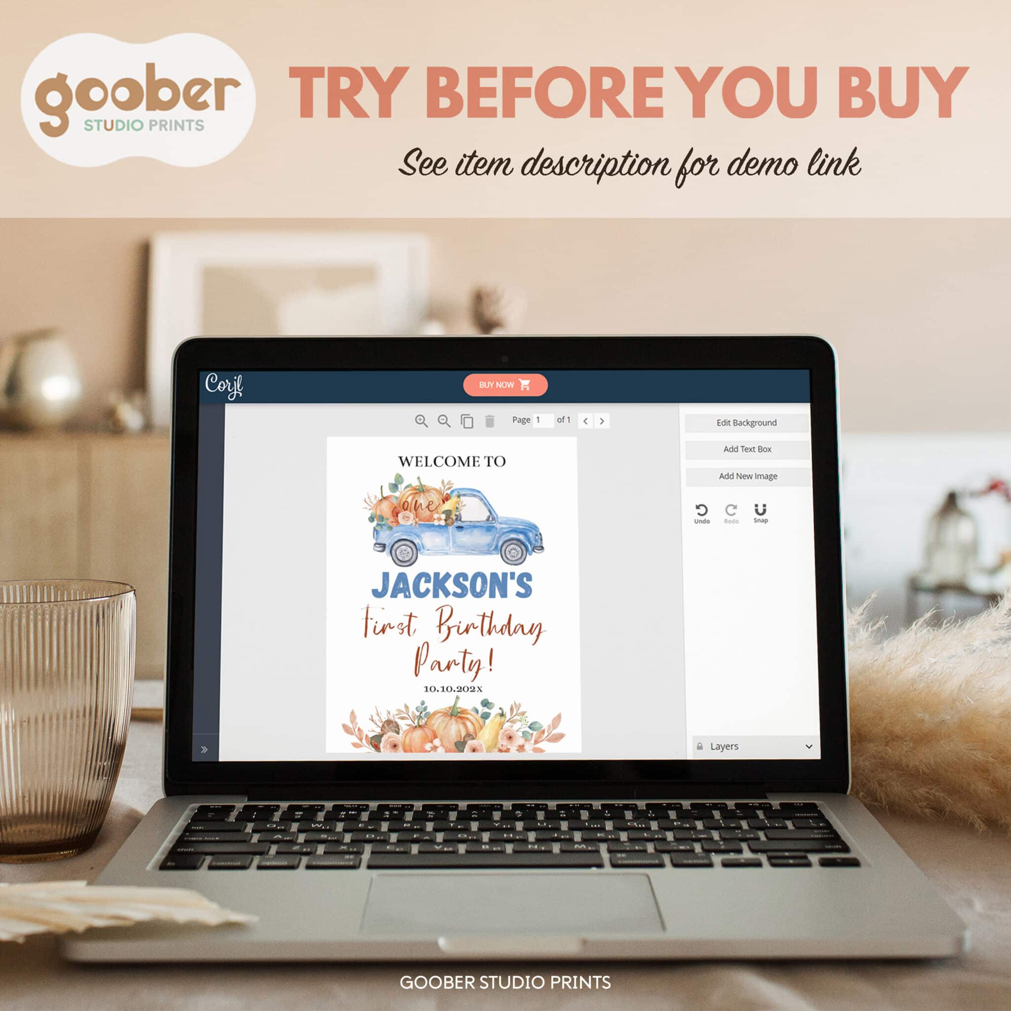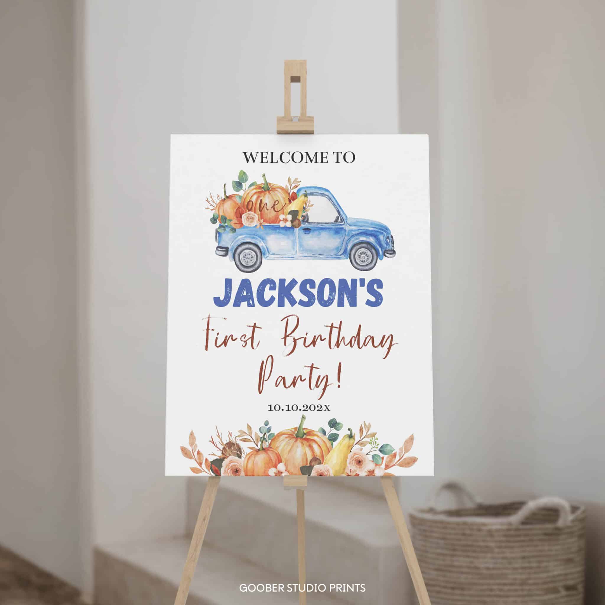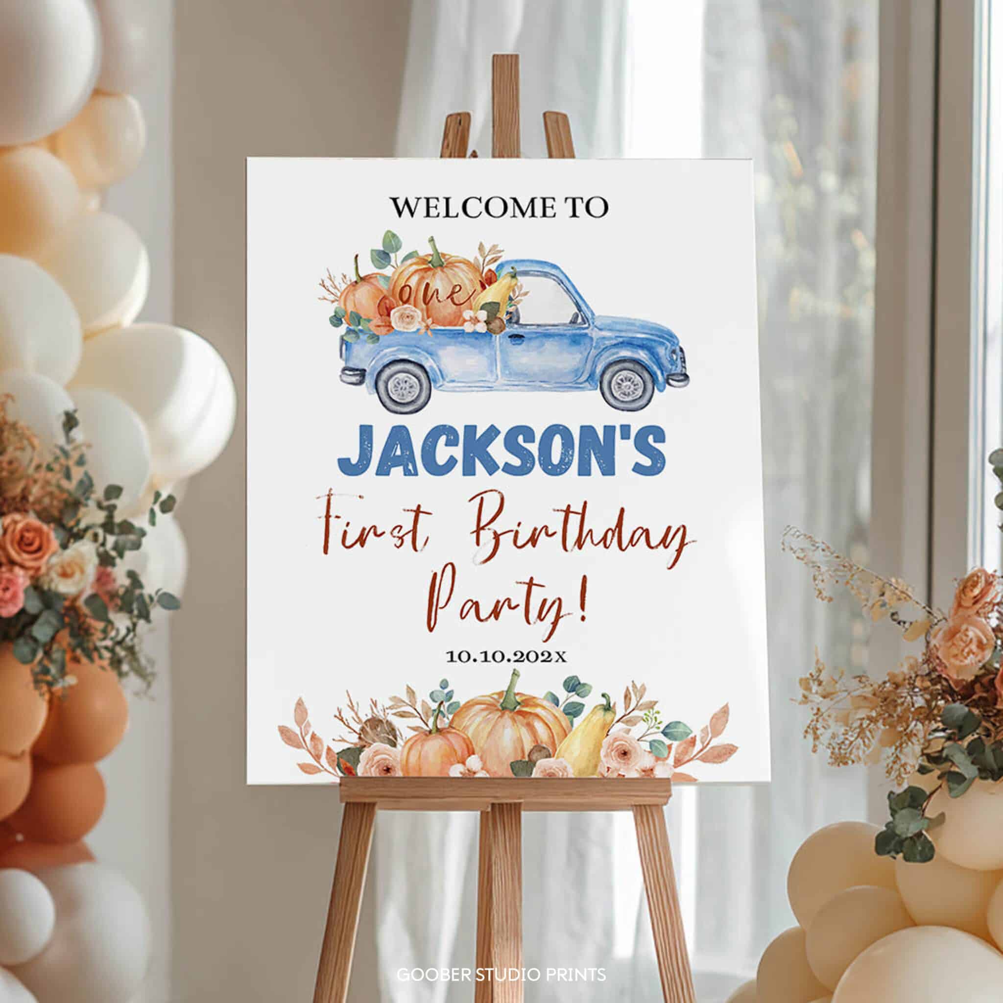 Welcome friends and family to your little pumpkin’s big day with our festive pumpkin truck welcome sign! Featuring rustic watercolor pumpkins, autumn fall florals, and a playful pumpkin truck design, this sign is the perfect accent for a boy birthday celebration. Personalize with your child’s name and age to create a warm entrance or backdrop that ties together your floral and pumpkin-inspired party décor.