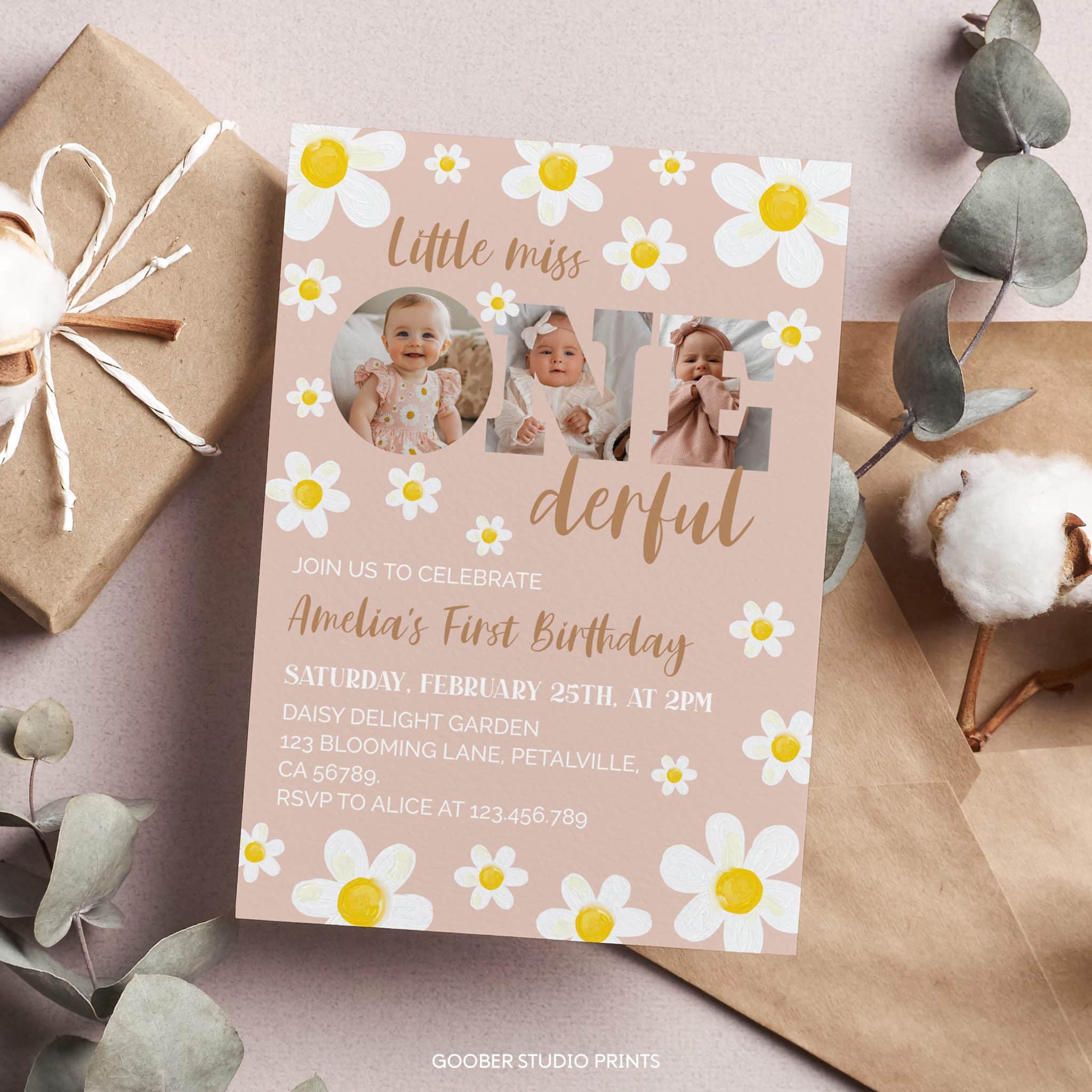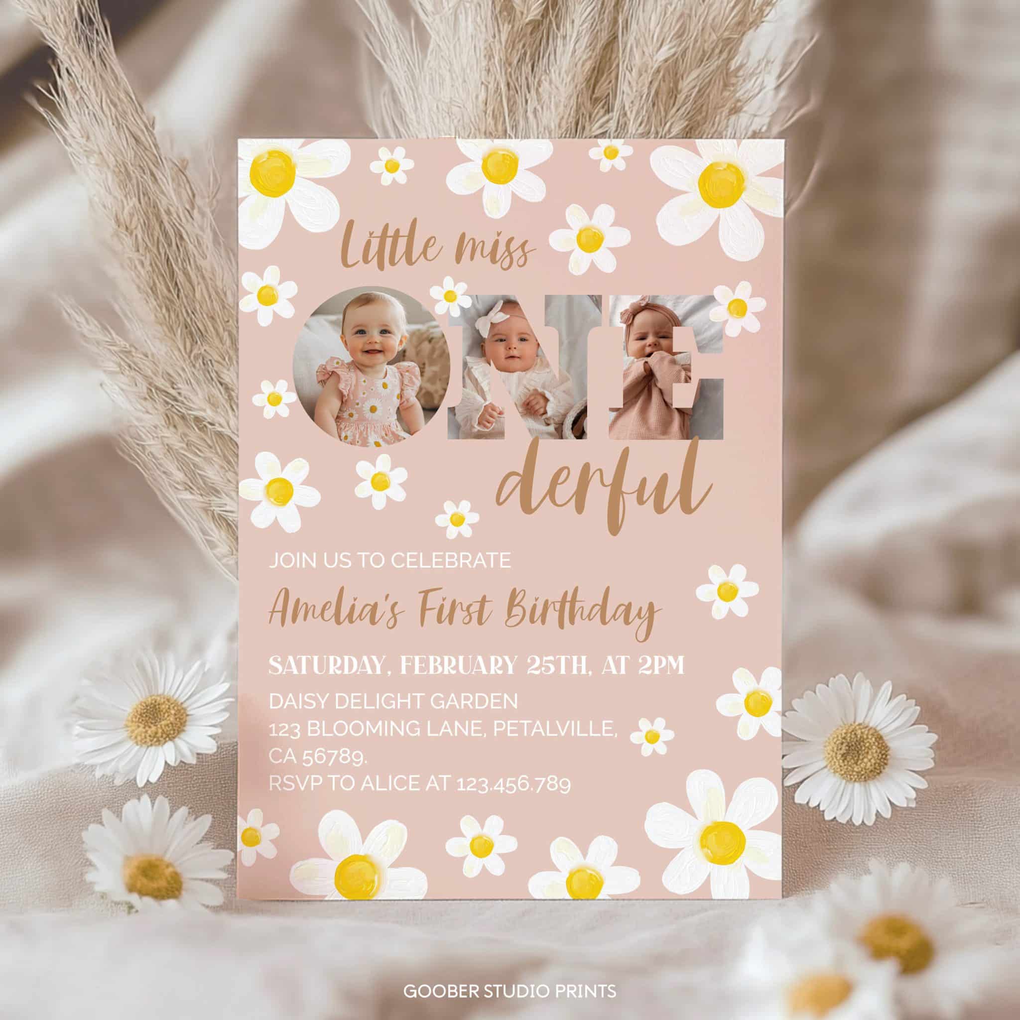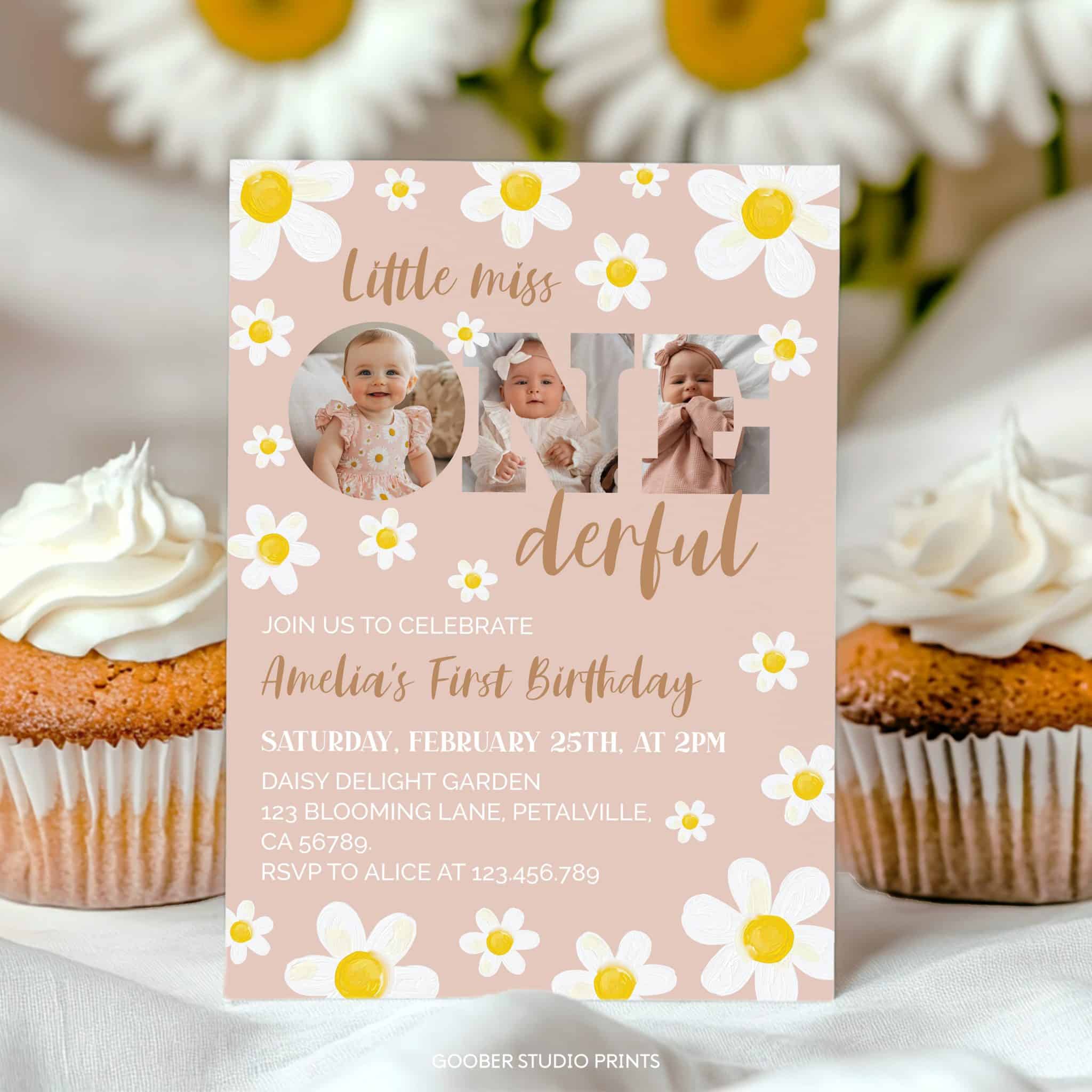 Capture the charm of a vintage floral celebration with our daisy first birthday party photo invitation! Featuring delicate daisy illustrations and timeless details, this beautifully designed invite sets the perfect tone for your little one’s special day. Easily personalize it with your party details to set the stage for a beautiful birthday celebration. Pair it with matching daisy party decorations to make your event bloom with charm and create an unforgettable day!