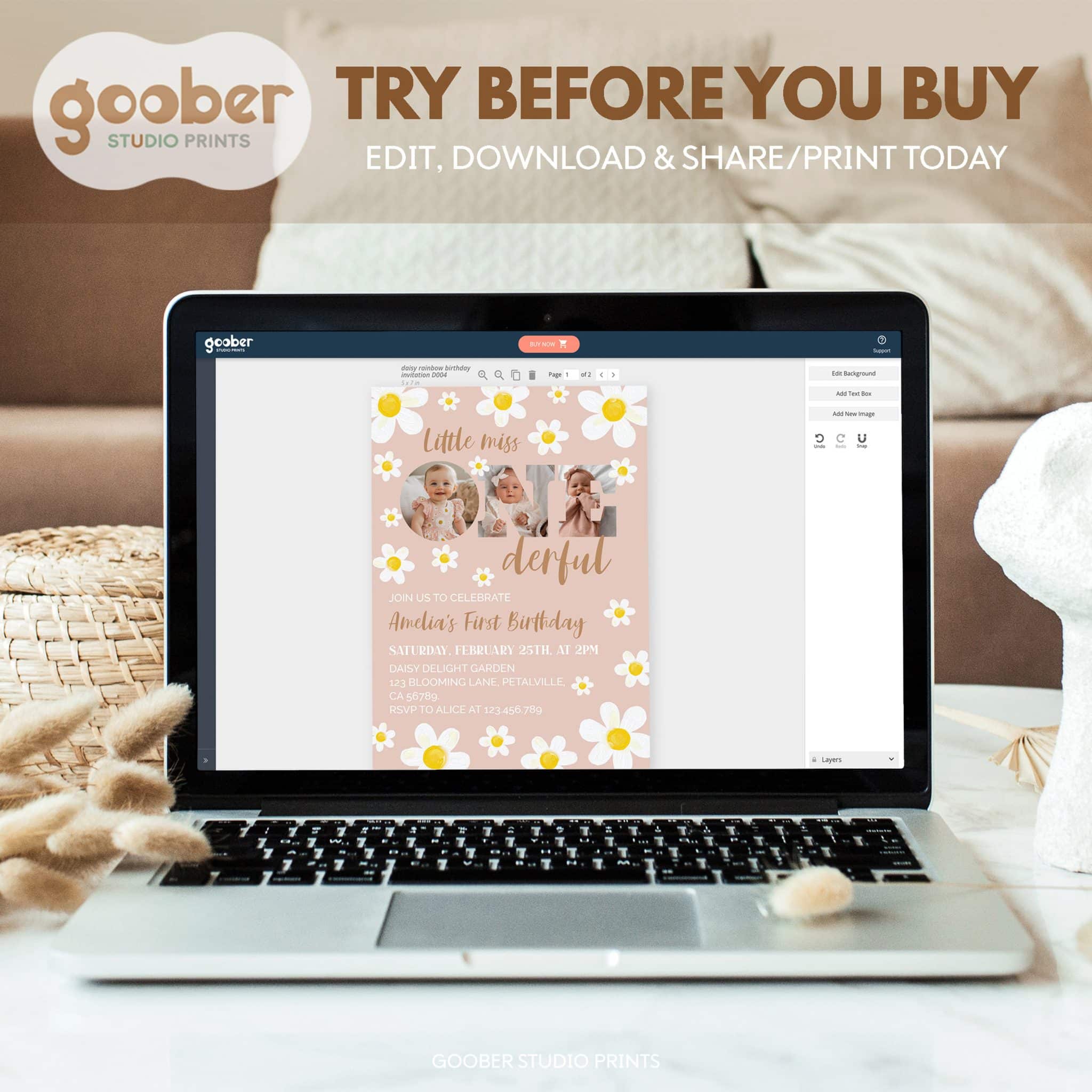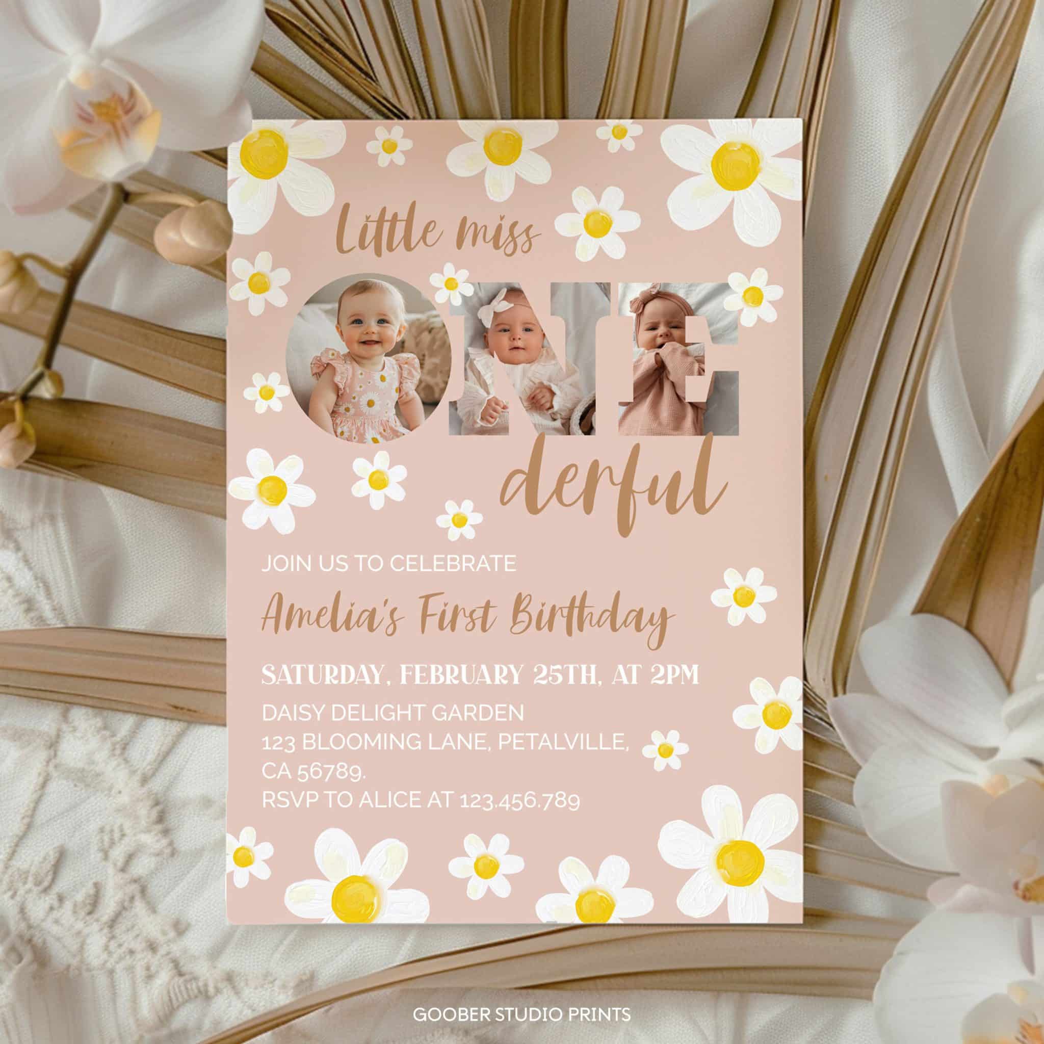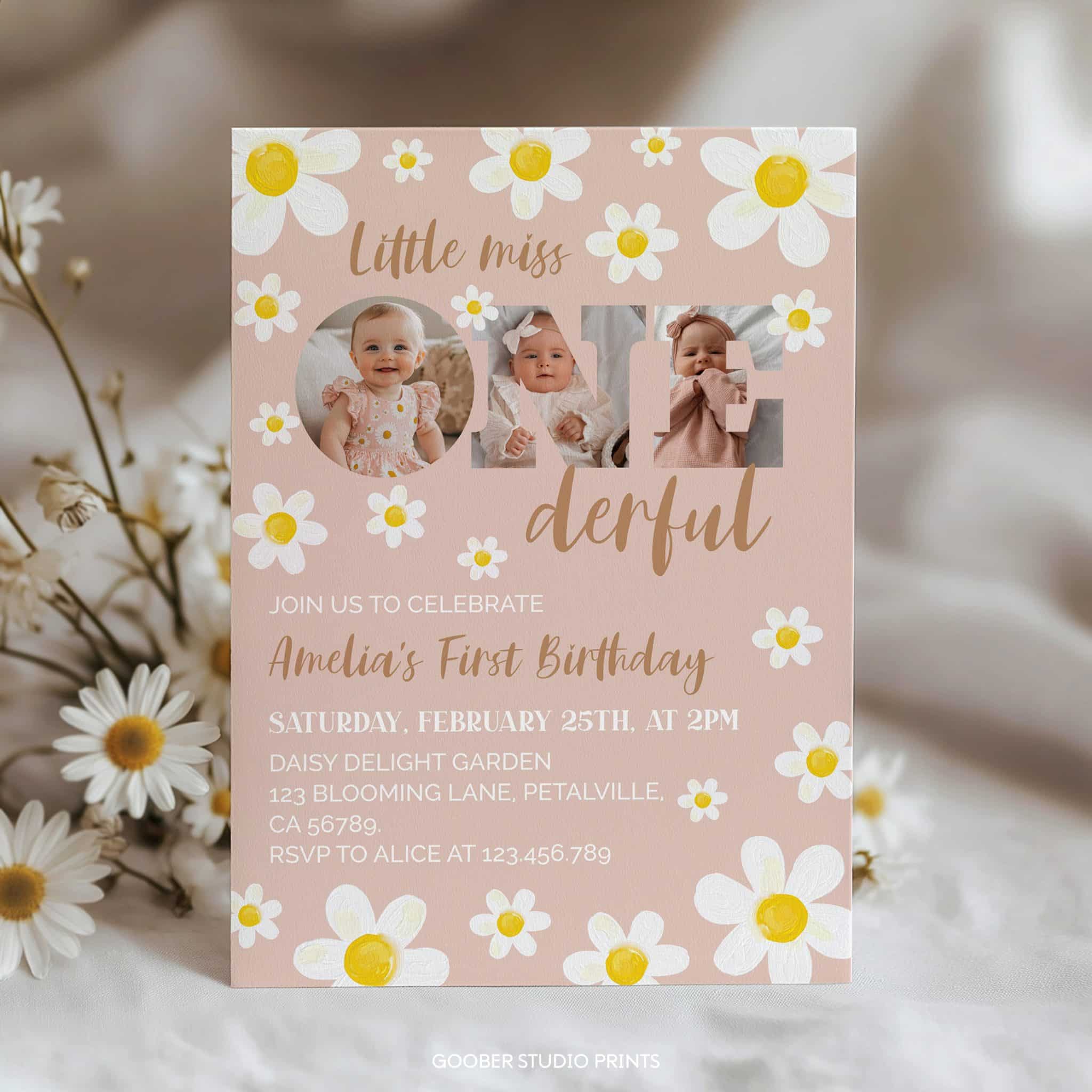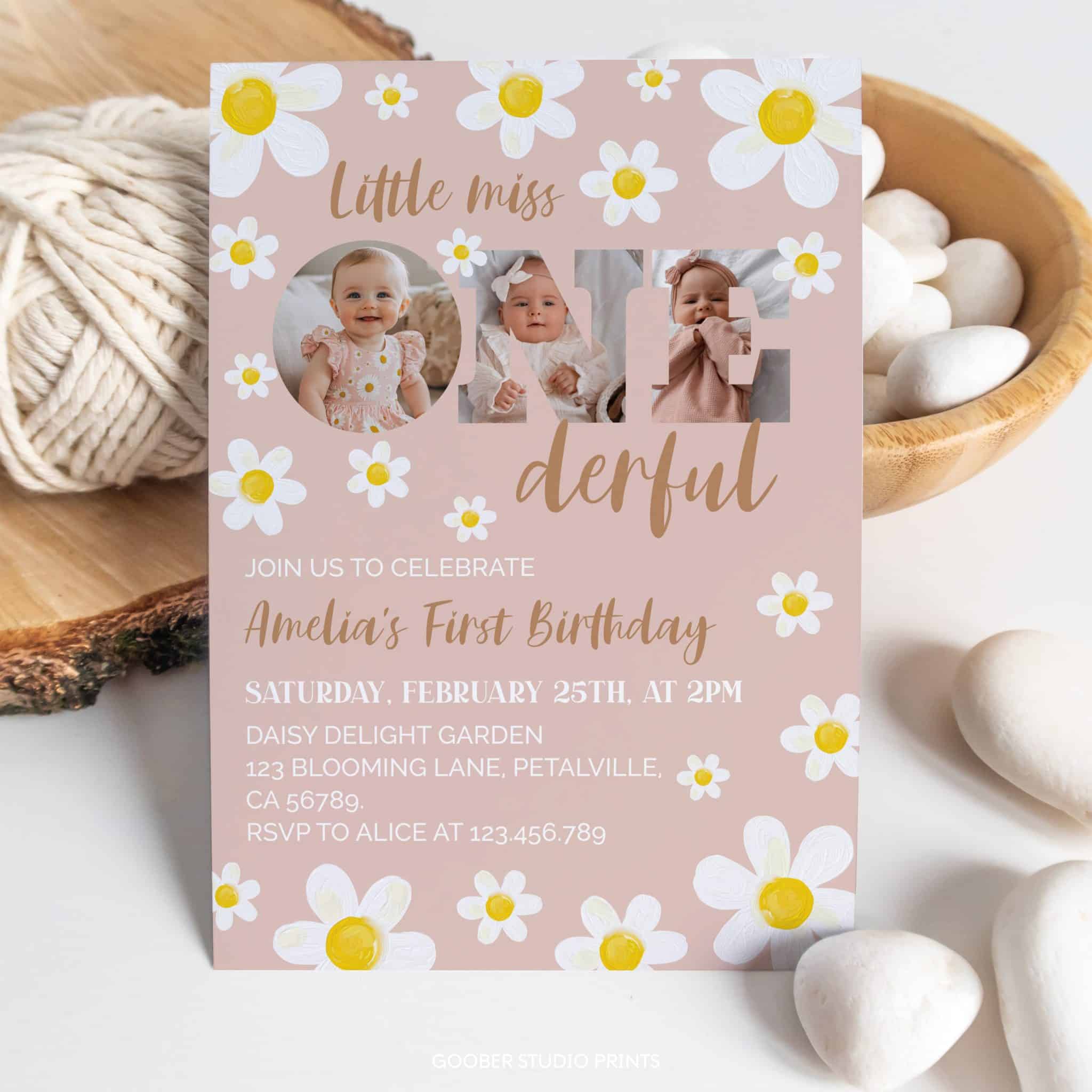 Capture the charm of a vintage floral celebration with our daisy first birthday party photo invitation! Featuring delicate daisy illustrations and timeless details, this beautifully designed invite sets the perfect tone for your little one’s special day. Easily personalize it with your party details to set the stage for a beautiful birthday celebration. Pair it with matching daisy party decorations to make your event bloom with charm and create an unforgettable day!