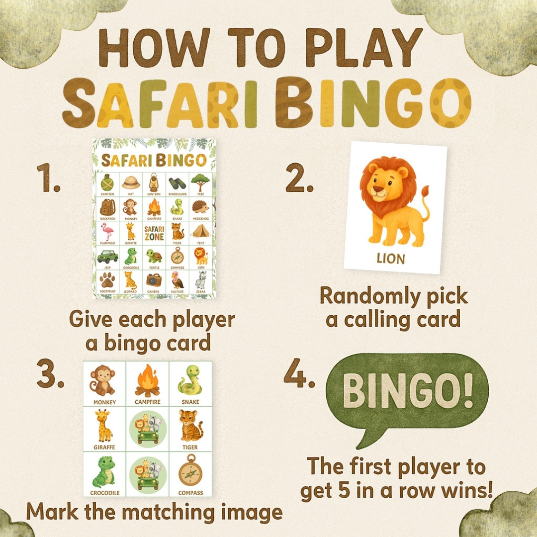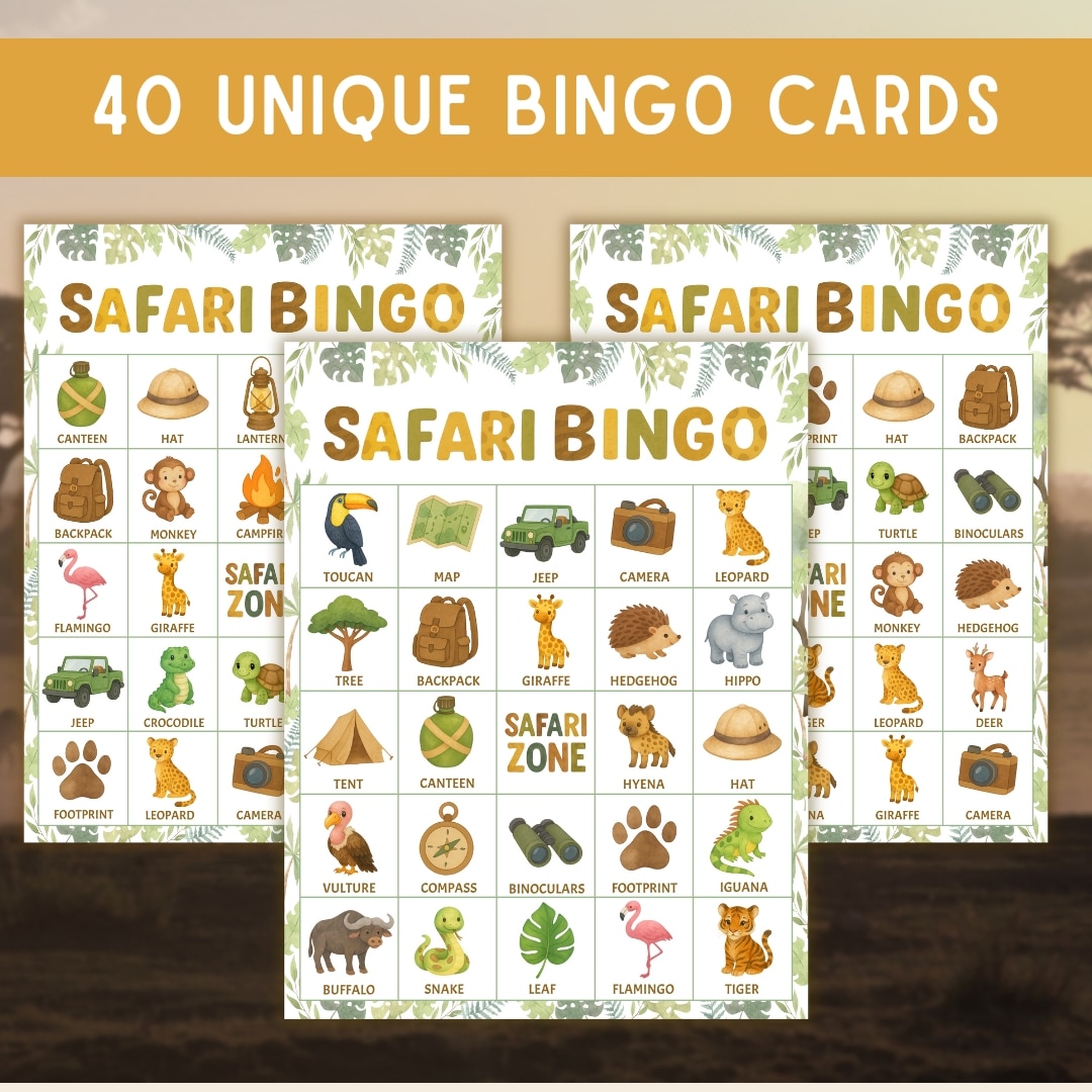 🦁 Complete set included – 40 unique bingo cards, 35 calling cards & themed tokens.