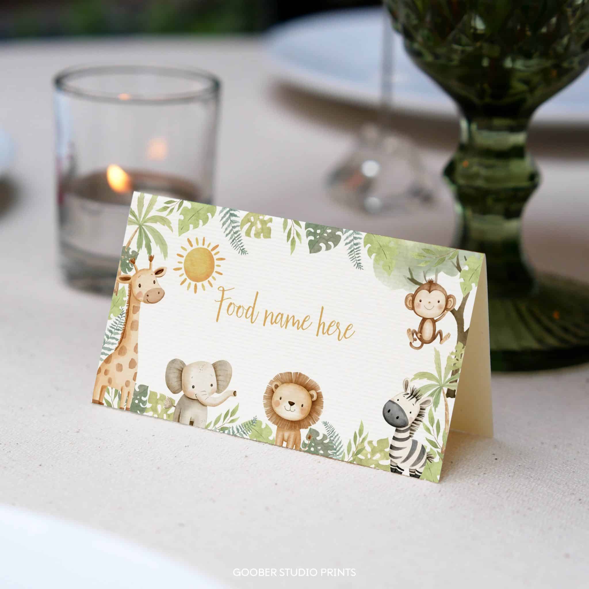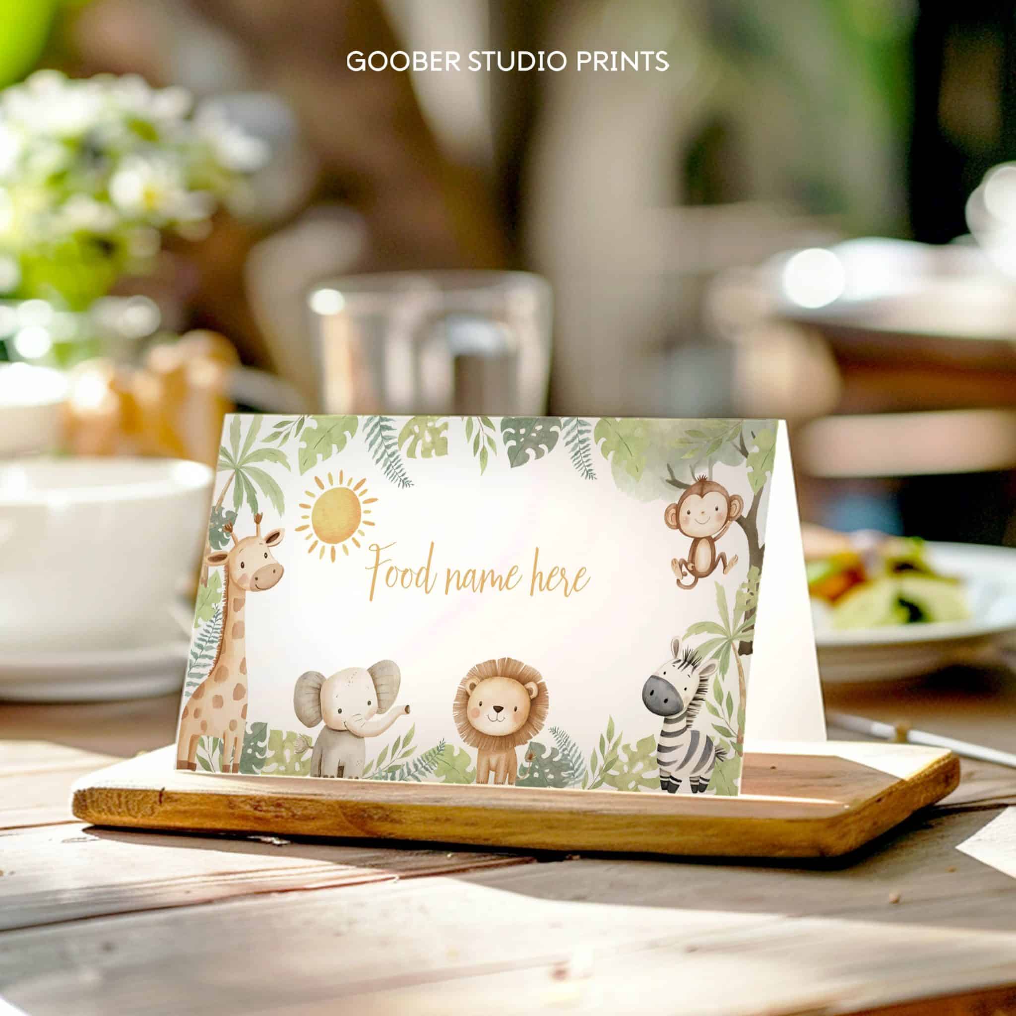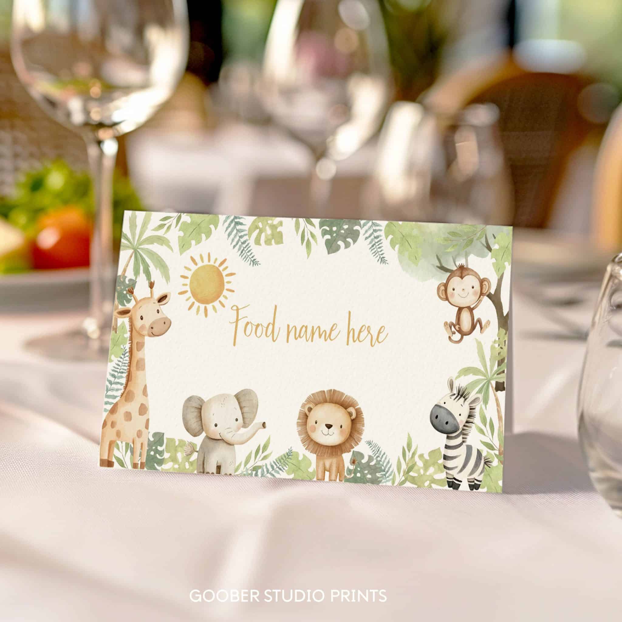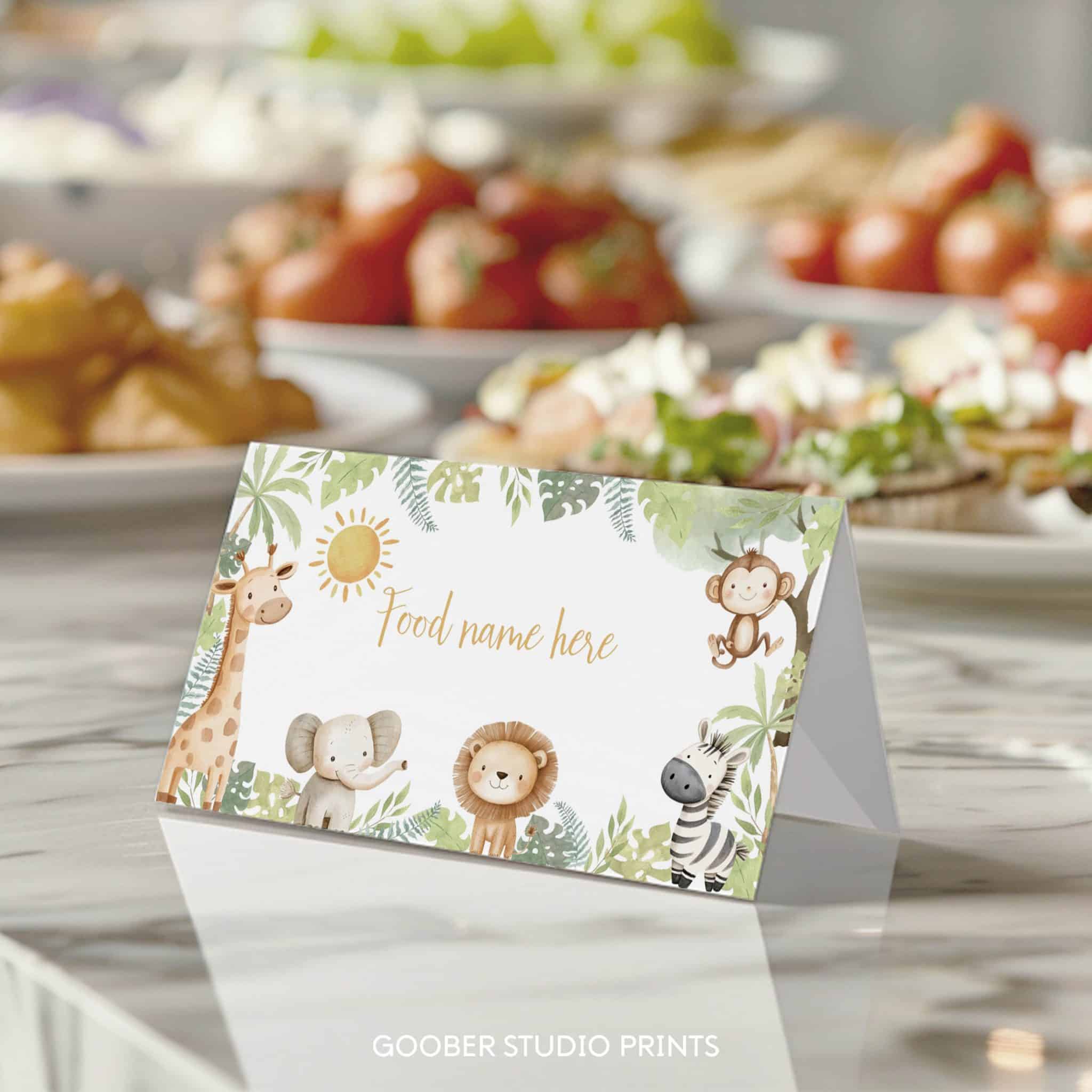Label your party menu in style with our safari wild one jungle animal food tent cards! Featuring adorable jungle animals and vibrant safari-themed accents, these cards provide space to write dish names and add a playful touch to your buffet or dessert table. Easily customizable and printable at home on standard cardstock, they’re perfect for organizing food at your little boy’s adventurous wild one birthday celebration!