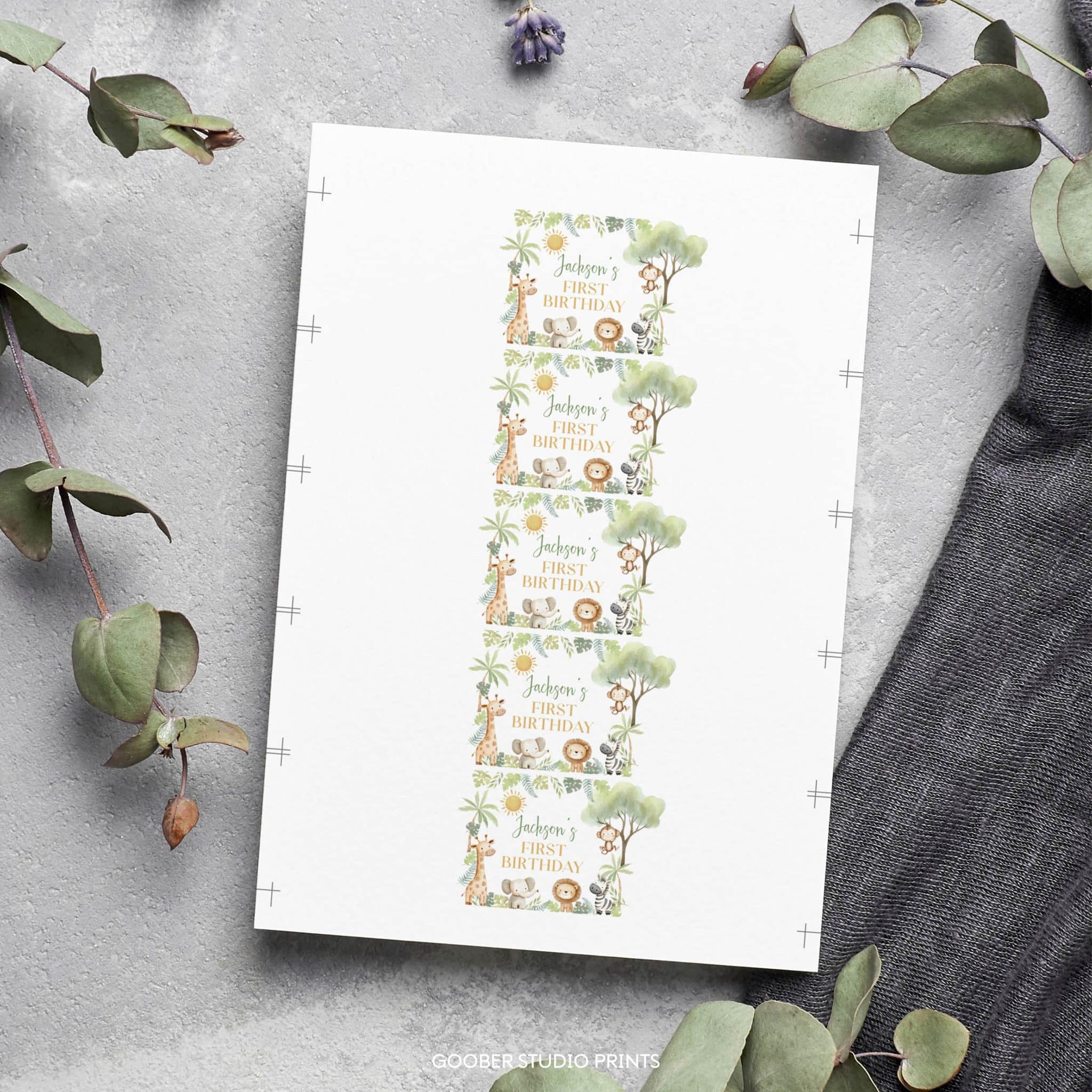 Add a wild touch to your party drinks with our safari wild one watercolor jungle animals water bottle labels! Featuring adorable jungle creatures and vibrant natural tones, these labels can be customized with the birthday boy’s name and age. Designed to fit standard 8.5”x2” bottles, they’re easy to print at home and make a perfect addition to your safari-themed birthday decor.