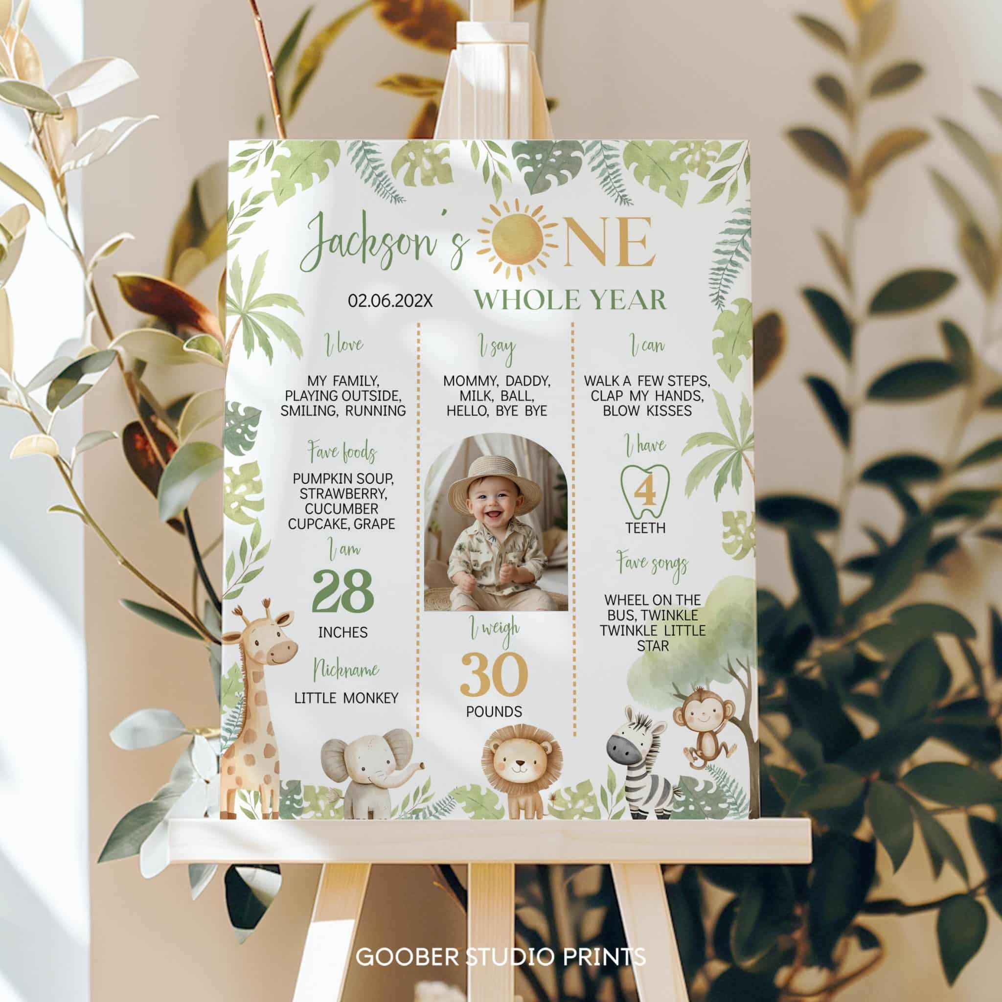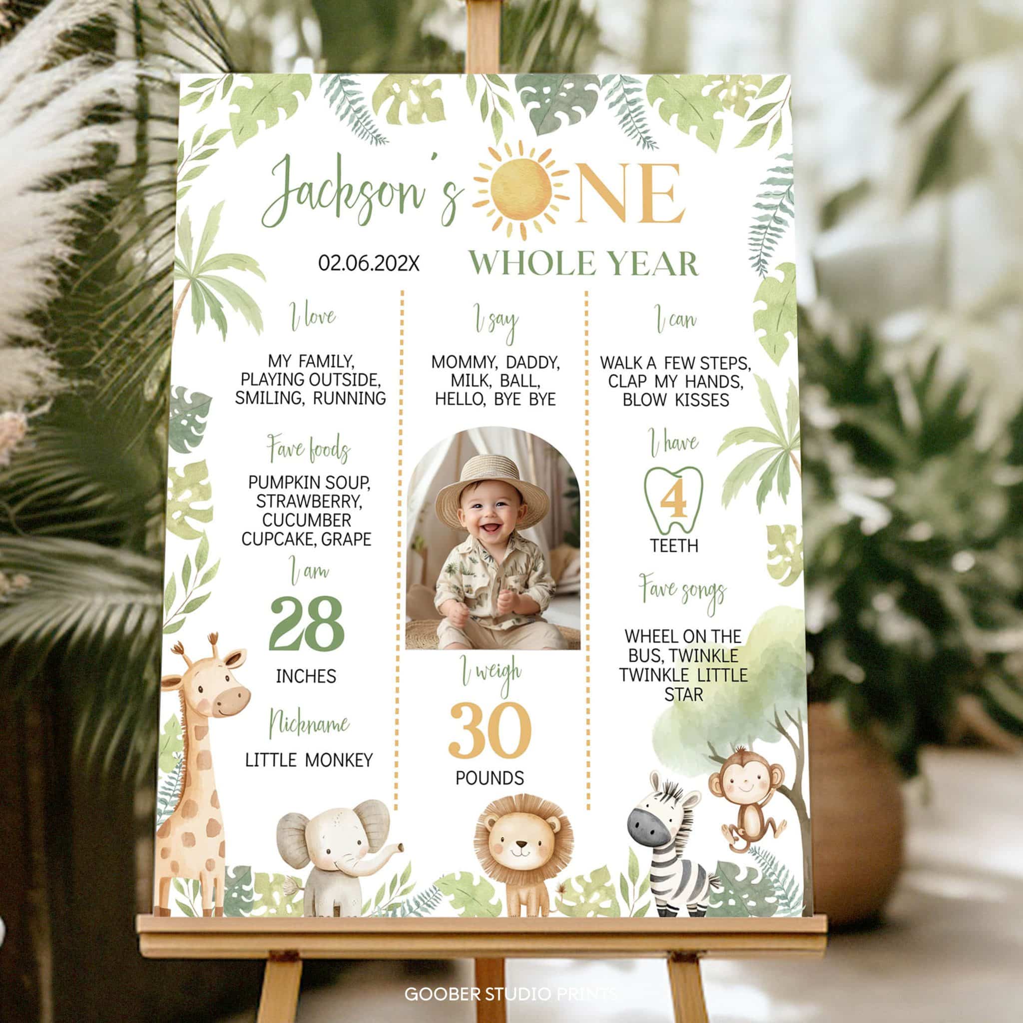 Commemorate your child’s first birthday with our Safari Wild One Birthday Milestone Photo Poster. This charming design showcases playful jungle animals—such as lions, elephants, and monkeys—amid lush greenery, capturing the adventurous spirit of a safari. The poster offers customizable sections to highlight your child’s name, special milestones, achievements, and cherished memories from their first year. Easily editable right inside your web browser, this poster serves as a delightful decoration during the celebration and a treasured keepsake for years to come.