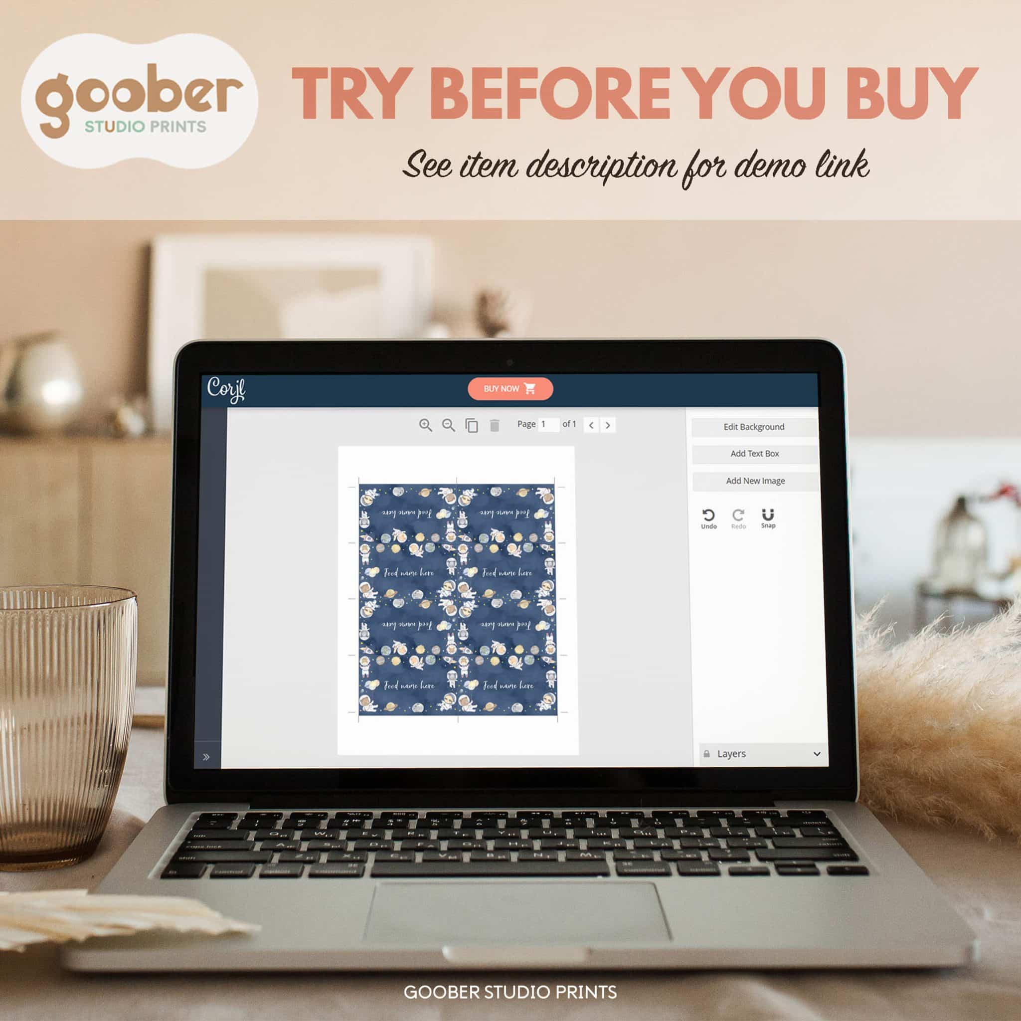 2. The Corjl template can be edited on your computer through a web browser. There is no additional software needed. You can edit the text, font color and size.