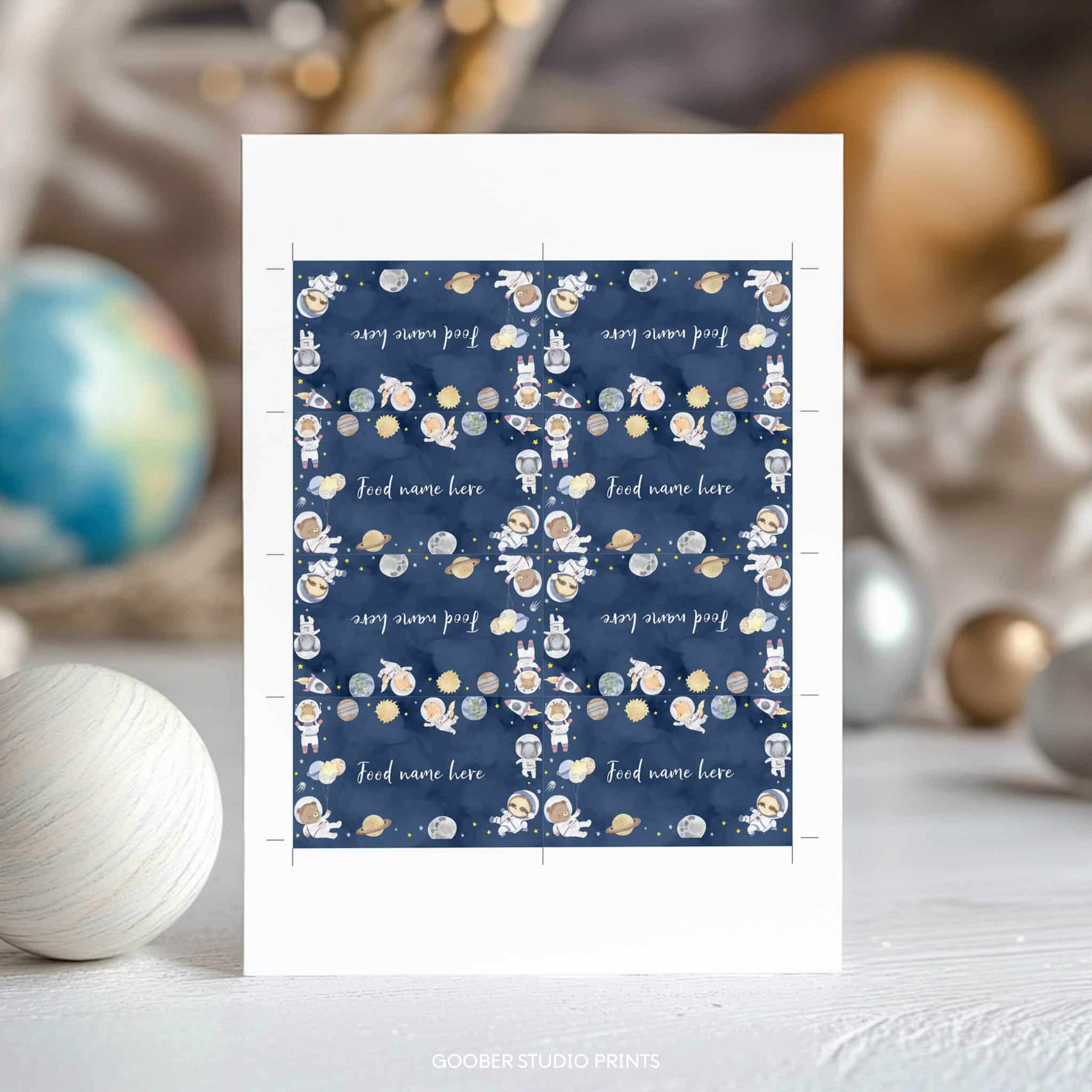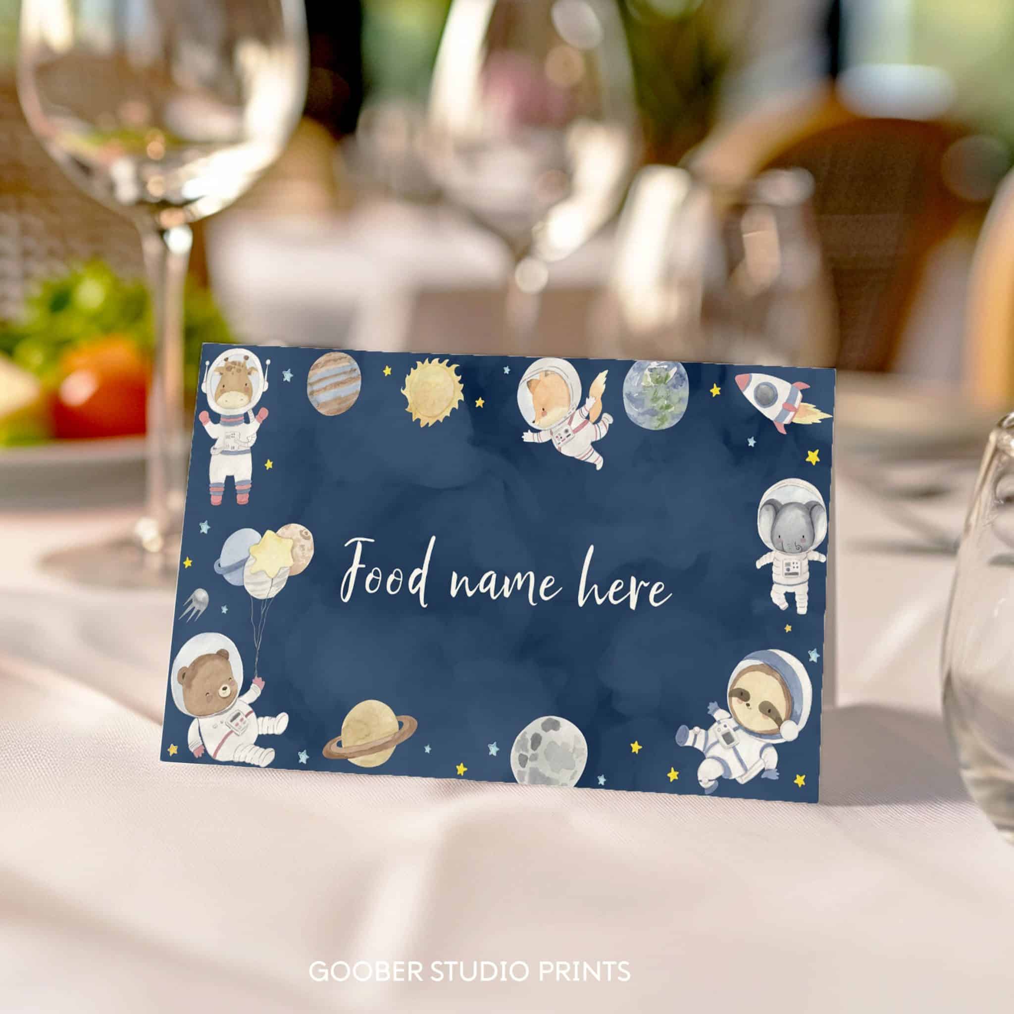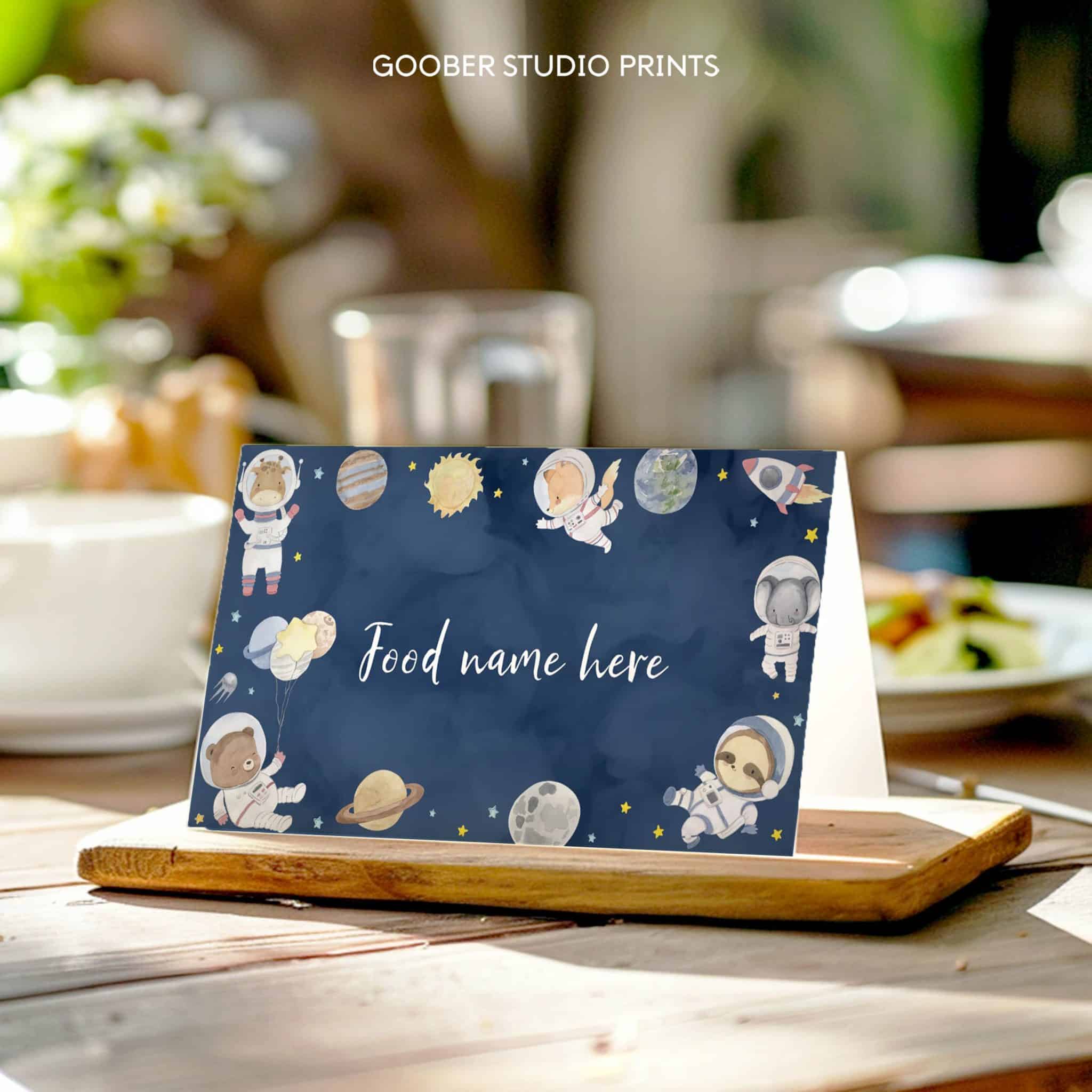 Label your party treats with a cosmic touch using our outer space safari animals food tent cards! Featuring cute safari animals in astronaut suits and space-themed accents, these cards are perfect for adding fun and function to your buffet or dessert table. With space to write dish names, they’re a great match for your wild one birthday, astronaut birthday theme, and outer space party supplies. Simply customize and print at home for an easy, themed setup!