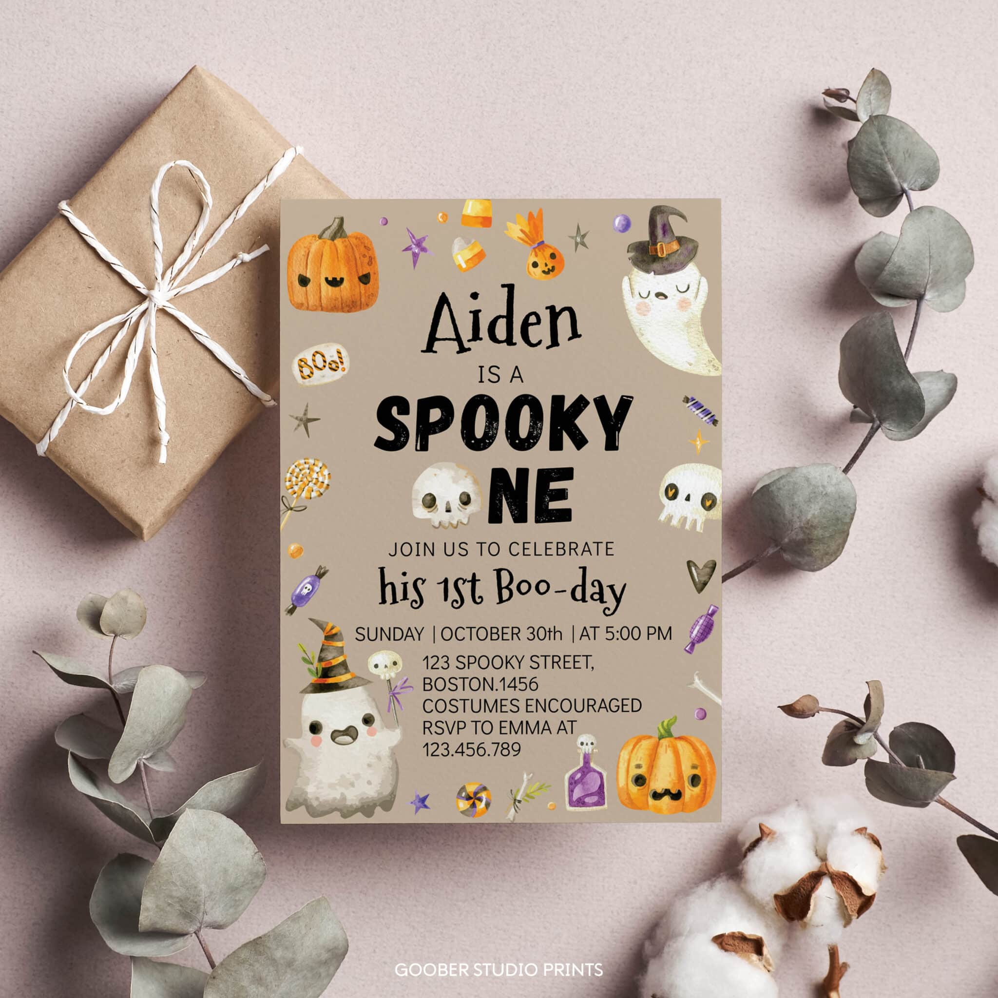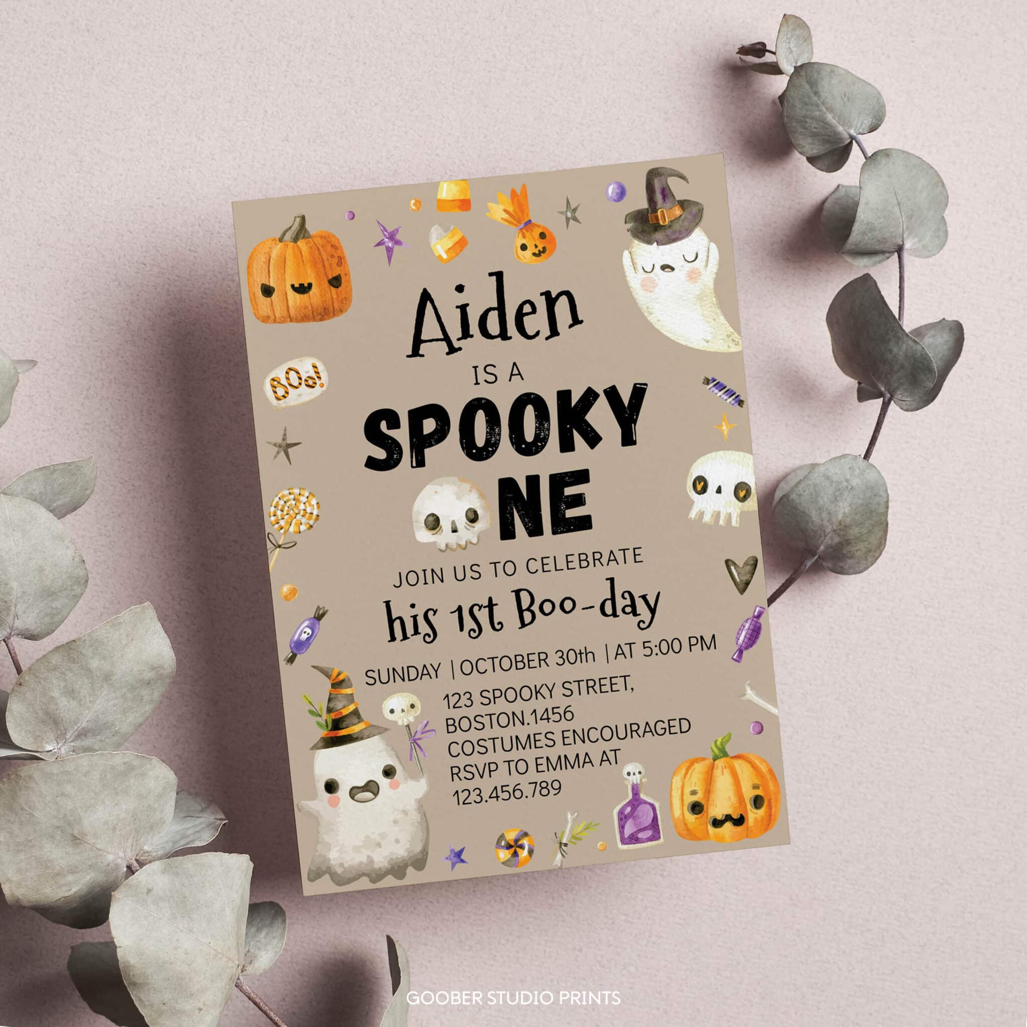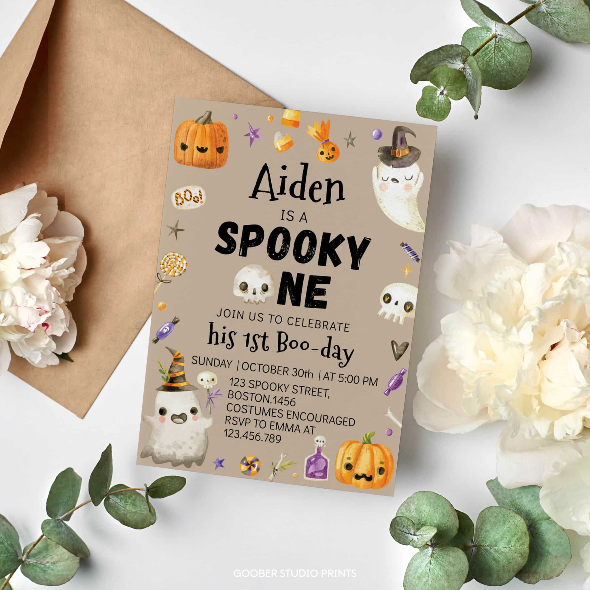 Invite family and friends to a frightfully fun celebration with our spooky one Halloween birthday party invitation. Designed especially for a boy birthday, this charming invite features adorable ghosts, smiling pumpkins, and festive Halloween details. Perfect for a ghost-themed Halloween birthday party, it sets the tone for your little pumpkin’s big “boo-day.” Personalize with your child’s name, age, and party details, then print at home or through a professional service. A budget-friendly way to make your spooky one celebration unforgettable.