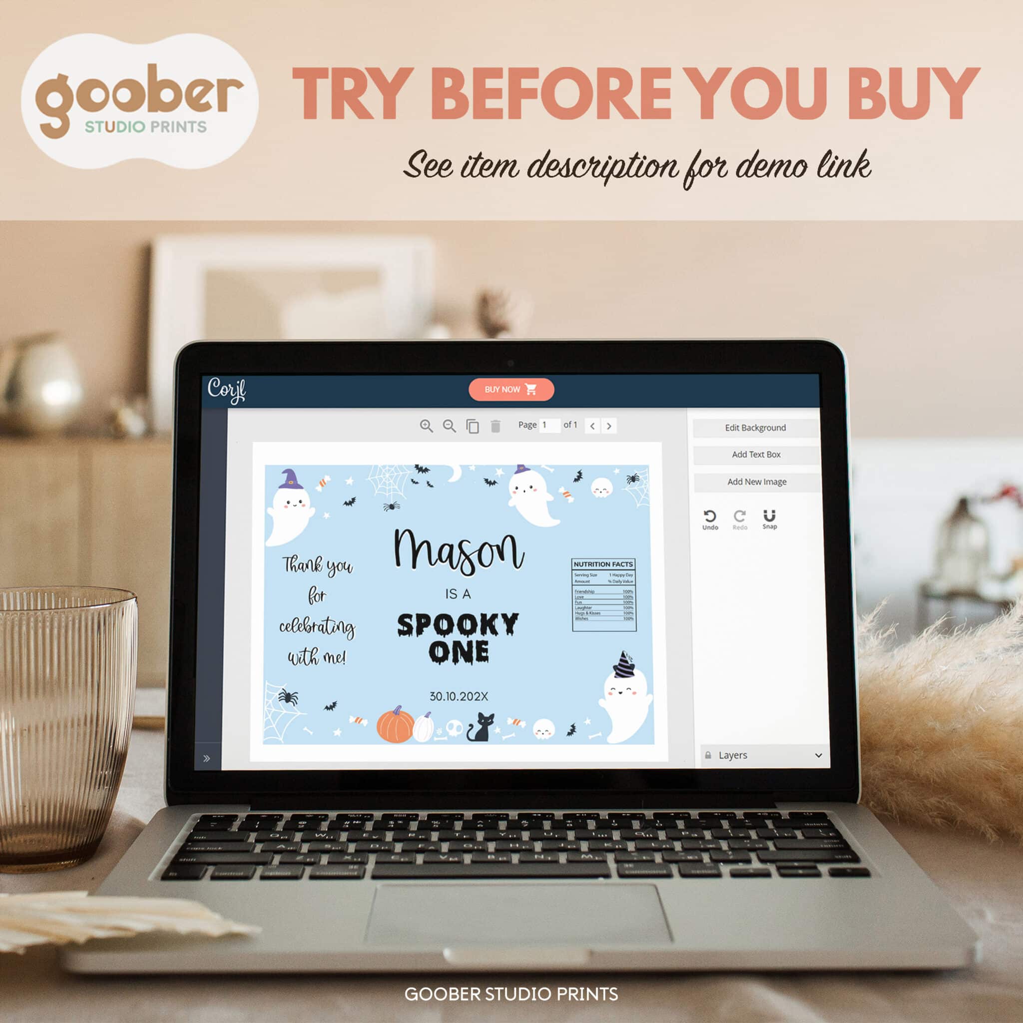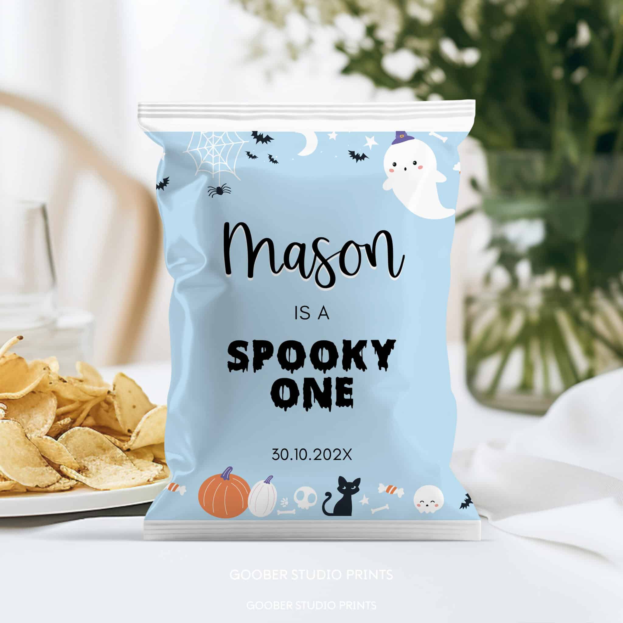 Make your spooky one celebration even sweeter with our halloween birthday party printable chip bag! Designed for a boy birthday, this ghost-themed chip bag features cute Halloween elements like ghosts, pumpkins, and bats. Personalize it with your child’s name and age for an extra special touch. Just print at home and assemble into snack-sized treat bags—perfect for adding a festive flair to your halloween birthday party table!