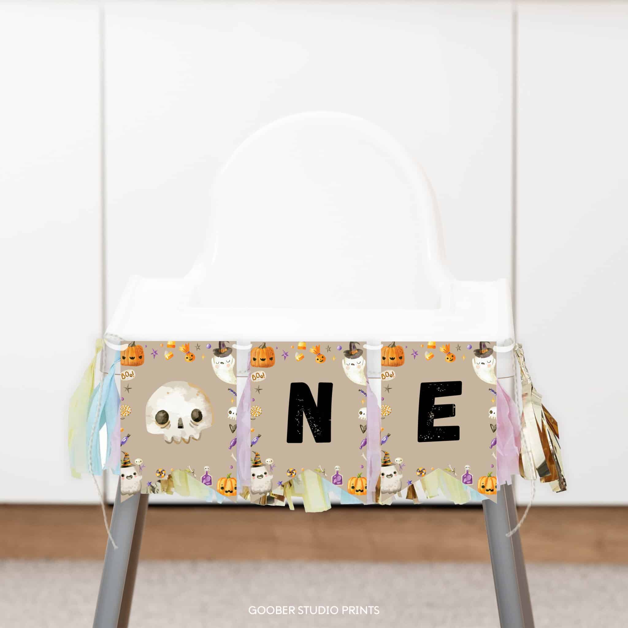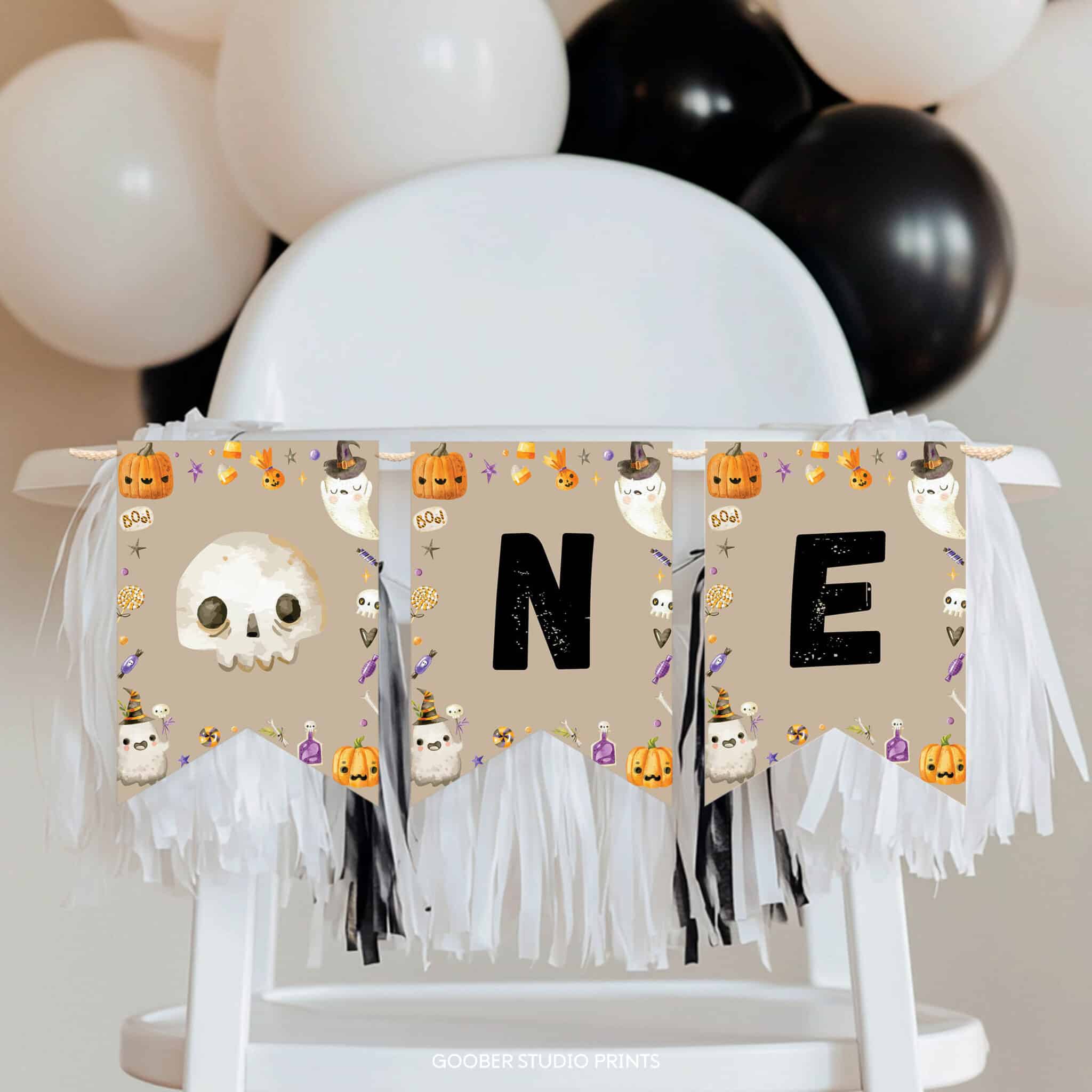 Make your baby boy’s first birthday unforgettable with our spooky one Halloween birthday party ghost highchair banner. Featuring cute ghosts, playful pumpkins, and Halloween-inspired letters spelling out “one,” this design turns your child’s highchair into a festive party centerpiece. Perfect for a boy birthday, it’s easy to print at home and adds the sweetest spooky touch to your little ghost’s big milestone celebration.