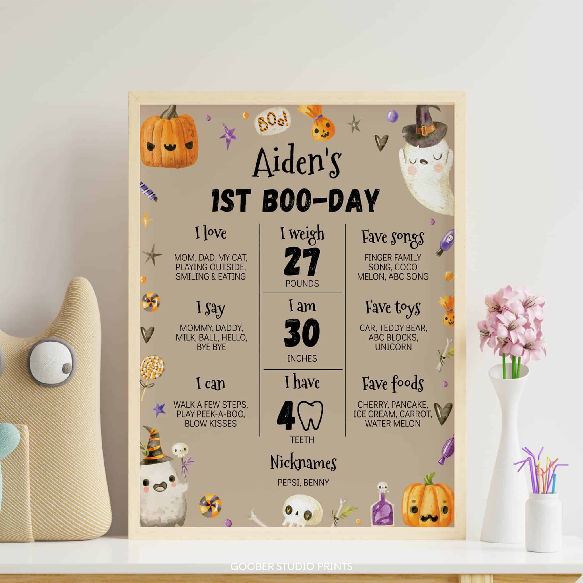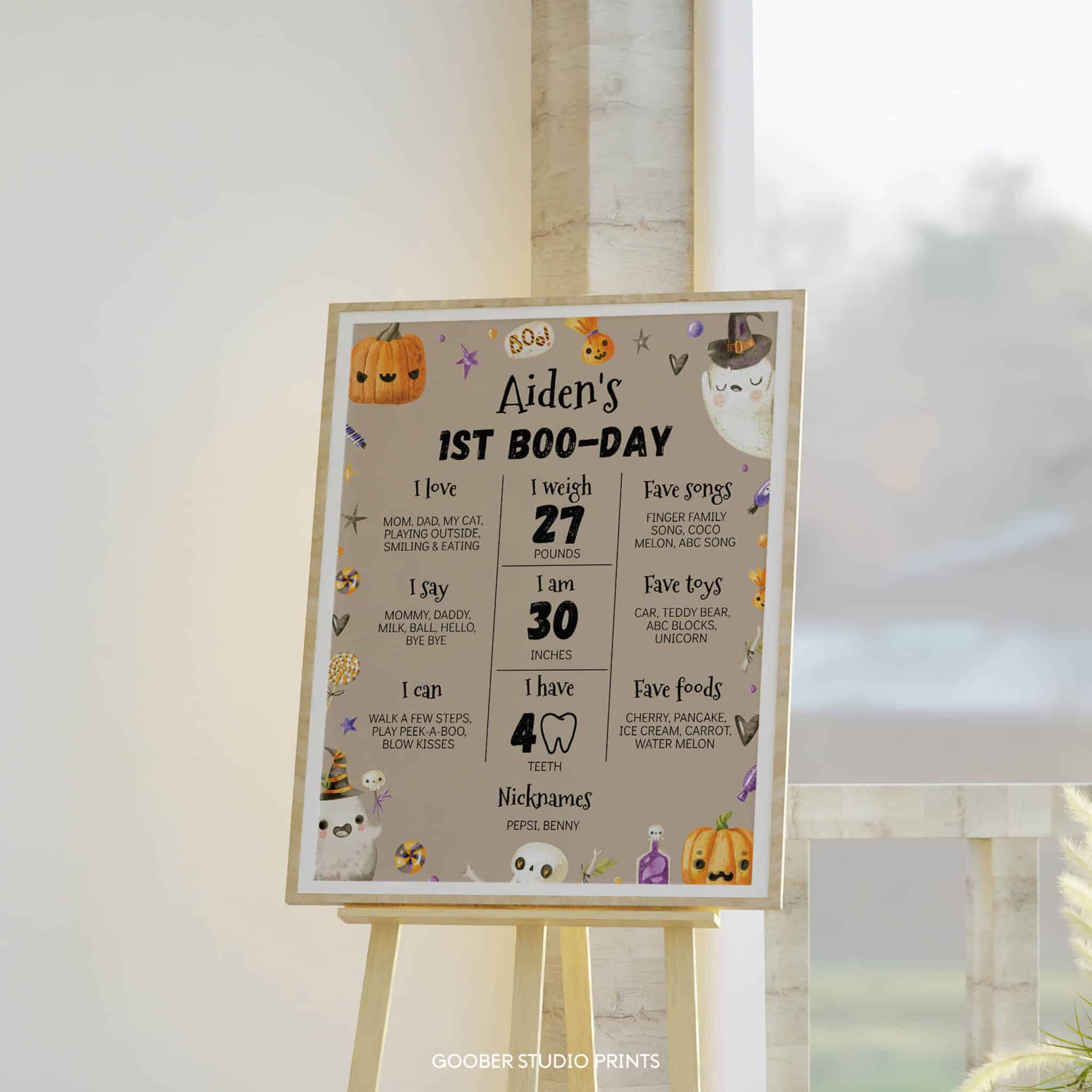 Celebrate your baby boy’s special milestone with our spooky one Halloween birthday party ghost milestone poster. This charming design features cute ghosts, playful pumpkins, and festive Halloween accents, with space to highlight your child’s name, age, favorite things, and milestones. Perfect for a boy birthday, it doubles as a keepsake and a fun decoration for your spooky one Halloween birthday celebration.